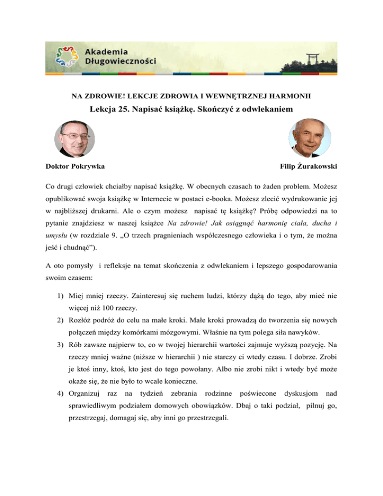 NA ZDROWIE! LEKCJE ZDROWIA I WEWNĘTRZNEJ HARMONII Lekcja 25. Napisać książkę. Skończyć z odwlekaniem Filip Żurakowski Doktor Pokrywka Co drugi człowiek chciałby napisać książkę. W obecnych czasach to żaden problem. Możesz opublikować swoja książkę w Internecie w postaci e-booka. Możesz zlecić wydrukowanie jej w najbliższej drukarni. Ale o czym możesz napisać tę książkę? Próbę odpowiedzi na to pytanie znajdziesz w naszej książce Na zdrowie! Jak osiągnąć harmonię ciała, ducha i umysłu (w rozdziale 9. „O trzech pragnieniach współczesnego człowieka i o tym, że można jeść i chudnąć”). A oto pomysły i refleksje na temat skończenia z odwlekaniem i lepszego gospodarowania swoim czasem: 1) Miej mniej rzeczy. Zainteresuj się ruchem ludzi, którzy dążą do tego, aby mieć nie więcej niż 100 rzeczy. 2) Rozłóż podróż do celu na małe kroki. Małe kroki prowadzą do tworzenia się nowych połączeń między komórkami mózgowymi. Właśnie na tym polega siła nawyków. 3) Rób zawsze najpierw to, co w twojej hierarchii wartości zajmuje wyższą pozycję. Na rzeczy mniej ważne (niższe w hierarchii ) nie starczy ci wtedy czasu. I dobrze. Zrobi je ktoś inny, ktoś, kto jest do tego powołany. Albo nie zrobi nikt i wtedy być może okaże się, że nie było to wcale konieczne. 4) Organizuj raz na tydzień zebrania rodzinne poświecone dyskusjom nad sprawiedliwym podziałem domowych obowiązków. Dbaj o taki podział, pilnuj go, przestrzegaj, domagaj się, aby inni go przestrzegali. 5) Postanów: od maja do października każda niedziela w górach! Przekonasz się, że przez 6 dni z relaksem w siódmym zrobisz znacznie więcej niż przez siedem dni bez relaksu. To jest sprawdzone, działa! 6) Każdego lata wyjeżdżaj na 3 tygodnie nad morze. Wypisz jeszcze 10 takich zaleceń i przy każdym z nich napisz, co to ma wspólnego z hasłem „Skończyć z odwlekaniem”. Zdjęcie : Szymon Kliszewski Przepis Doktora Pokrywki - Imbirówka Składniki: imbir w proszku ½ płaskiej łyżeczki wiśniówka 40 ml woda - ½ szklanki (120 ml) Przygotowanie: wlać wodę do garnka, dodać imbir gotować 2 minuty zdjąć z ognia i dodać wiśniówki przelać do szklanki Zalecenia: Wypić możliwie gorące, przed każdym łykiem wymieszać, żeby imbir nie pozostał na dnie po wypiciu. Zalecane jednorazowo na przeziębienie. Po wypiciu wypoczywać w ciepłym łóżku w ciszy (najlepiej zasnąć). Coś dla ducha Gdybym żył tak, jak inni każą mi żyć, nie byłbym sobą. Gdybym choć na krok zboczył z drogi – bo nie wypada, bo komuś będzie przykro, bo będą ze mnie się śmiać, bo co sobie pomyślą – nie byłbym już sobą. Złota myśl Filipa Jeśli ci się nie chce czegoś robić, to albo nie jest to twoim powołaniem, albo potrzebujesz relaksu. Książkę Doktora Pokrywki i Filipa Żurakowskiego Na zdrowie! Jak osiągnąć harmonię ciała, ducha i umysłu można kupić w salonach Empiku w całej Polsce lub na stronie www.nazdrowie.drpokrywka.pl Przeczytaj recenzje o naszej książce na stronie wydawnictwa Sensus http://sensus.pl/ksiazki/na-zdrowie-jak-osiagnac-harmonie-ciala-ducha-i-umyslu-dr-janpokrywka-filip-zurakowski,jakosi.htm