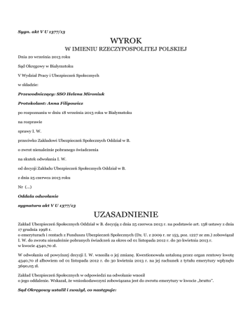 Sygn. akt V U 1377/13 WYROK W IMIENIU RZECZYPOSPOLITEJ POLSKIEJ Dnia 20 września 2013 roku Sąd Okręgowy w Białymstoku V Wydział Pracy i Ubezpieczeń Społecznych w składzie: Przewodniczący: SSO Helena Mironiuk Protokolant: Anna Filipowicz po rozpoznaniu w dniu 18 września 2013 roku w Białymstoku na rozprawie sprawy I. W. przeciwko Zakładowi Ubezpieczeń Społecznych Oddział w B. o zwrot nienależnie pobranego świadczenia na skutek odwołania I. W. od decyzji Zakładu Ubezpieczeń Społecznych Oddział w B. z dnia 25 czerwca 2013 roku Nr (...) Oddala odwołanie sygnatura akt V U 1377/13 UZASADNIENIE Zakład Ubezpieczeń Społecznych Oddział w B. decyzją z dnia 25 czerwca 2013 r. na podstawie art. 138 ustawy z dnia 17 grudnia 1998 r. o emeryturach i rentach z Funduszu Ubezpieczeń Społecznych (Dz. U. z 2009 r. nr 153, poz. 1227 ze zm.) zobowiązał I. W. do zwrotu nienależnie pobranych świadczeń za okres od 01 listopada 2012 r. do 30 kwietnia 2013 r. w kwocie 4340,70 zł. W odwołaniu od powyższej decyzji I. W. wnosiła o jej zmianę. Kwestionowała ustaloną przez organ rentowy kwotę 4340,70 zł albowiem od 01 listopada 2012 r. do 30 kwietnia 2013 r. na jej rachunek z tytułu emerytury wpłynęło 3690,05 zł. Zakład Ubezpieczeń Społecznych w odpowiedzi na odwołanie wnosił o jego oddalenie. Wskazał, że wnioskodawczyni zobowiązana jest do zwrotu emerytury w kwocie „brutto”. Sąd Okręgowy ustalił i zważył, co następuje: Zakład Ubezpieczeń Społecznych Oddział w B. decyzją z dnia 18 stycznia 2013 r. przyznał I. W. emeryturę od 01 listopada 2012 r. Organ rentowy jednocześnie zawiesił wypłatę emerytury, ponieważ wnioskodawczyni przysługuje prawo do emerytury rolniczej. Pomimo zawieszenia wypłaty przyznanego świadczenia Zakład Ubezpieczeń Społecznych przekazywał emeryturę na rachunek I. W.. W dniu 19 kwietnia 2013 r. odwołująca poinformowała Zakład Ubezpieczeń Społecznych, że emerytura nie powinna być wypłacana. Zgodnie z art. 138 ustawy z dnia 17 grudnia 1998 r. o emeryturach i rentach z Funduszu Ubezpieczeń Społecznych osoba, która nienależnie pobrała świadczenia, jest obowiązana do ich zwrotu. Za nienależnie pobrane świadczenia uważa się: 1) świadczenia wypłacone mimo zaistnienia okoliczności powodujących ustanie lub zawieszenie prawa do świadczeń albo wstrzymanie wypłaty świadczeń w całości lub w części, jeżeli osoba pobierająca świadczenia była pouczona o braku prawa do ich pobierania; 2) świadczenia przyznane lub wypłacone na podstawie fałszywych zeznań lub dokumentów albo w innych przypadkach świadomego wprowadzenia w błąd przez osobę pobierającą świadczenia. Nie można żądać zwrotu kwot nienależnie pobranych świadczeń za okres dłuższy niż 12 miesięcy, jeżeli osoba pobierająca świadczenia zawiadomiła organ rentowy o zajściu okoliczności powodujących ustanie lub zawieszenie prawa do świadczeń albo wstrzymanie wypłaty świadczeń w całości lub w części, a mimo to świadczenia były jej nadal wypłacane, w pozostałych zaś wypadkach - za okres dłuższy niż 3 lata. Organ rentowy może odstąpić od żądania zwrotu kwot nienależnie pobranych świadczeń w całości lub w części, zmniejszyć wysokość potrąceń, ustaloną zgodnie z art. 140 ust. 4 pkt 1, lub zawiesić dokonywanie tych potrąceń na okres nie dłuższy niż 12 miesięcy, jeżeli zachodzą szczególnie uzasadnione okoliczności (ust. 6). Na gruncie ustalonego w sprawie stanu faktycznego niewątpliwie zastosowanie ma art. 138 ust. 2 pkt 1 ustawy emerytalnej. Ubezpieczonej została bowiem wypłacona emerytura mimo zaistnienia okoliczności powodujących zawieszenie prawa do tego świadczenia. Pomiędzy stronami nie było sporne, że emerytura od 01 listopada 2012 r. do 30 kwietnia 2013 r. została przez I. W. nienależnie pobrana. Z przytoczonych powyżej przepisów nie wynika, czy zwrot nienależnie pobranych świadczeń powinien nastąpić w wysokości "brutto", czy też "netto". Przy wykładni tych przepisów należy uwzględnić tę okoliczność, że celem art. 138 ustawy o emeryturach i rentach z FUS jest ochrona Funduszu Ubezpieczeń Społecznych, dlatego zwrot nienależnie pobranego świadczenia powinien obejmować wysokość kwoty, o jaką Fundusz ten został bezpodstawnie uszczuplony (por. wyrok Sądu Apelacyjnego w Warszawie z 20 czerwca 2007 r., III AUa 478/07, OSA 2008/12/38). Nienależnie pobrane świadczenie podlegające zwrotowi obejmuje zatem kwotę "brutto", czyli kwotę świadczenia faktycznie wypłaconego osobie pobierającej świadczenie, zwiększoną o kwotę podatku dochodowego od osób fizycznych odprowadzaną przez organ rentowy na rzecz organu podatkowego oraz o składkę na ubezpieczenie zdrowotne, jeżeli została potrącona (por. uchwałę Sądu Najwyższego z 26 kwietnia 1994 r., II UZP 9/94, OSNAPiUS 1994/3/45; wyrok Sądu Najwyższego z dnia 17 kwietnia 2009 r., I UK 333/08, OSNP 2010/23-24/292). Zwrot na rzecz organu rentowego nienależnie pobranego świadczenia z ubezpieczenia społecznego w kwocie "brutto" powoduje, że po stronie ubezpieczonego powstaje możliwość ubiegania się o zwrot "nadpłaconego" podatku dochodowego od osób fizycznych, z którym to żądaniem ubezpieczony może wystąpić do organu podatkowego (właściwego urzędu skarbowego). Nadpłatę podatku dochodowego można zrekompensować odliczeniem od dochodu wykazanego w zeznaniu rocznym dokonanych w roku podatkowym zwrotów nienależnie pobranych świadczeń, które uprzednio zwiększyły dochód podlegający opodatkowaniu, w kwotach uwzględniających pobrany podatek dochodowy, jeżeli zwroty te nie zostały potrącone przez płatnika (art. 26 ust. 1 pkt 5 ustawy z dnia 26 lipca 1991 r. o podatku dochodowym od osób fizycznych; jednolity tekst: Dz. U. z 2012 r. poz. 361 ze zm.). Uwzględnienie przez sąd ubezpieczeń społecznych rozpoznający sprawę o zwrot nienależnie pobranego świa