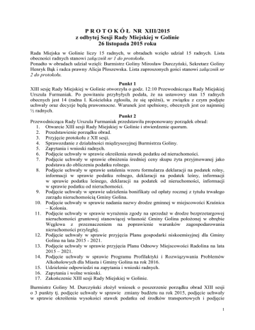 P R O T O K Ó Ł NR XIII/2015 z odbytej Sesji Rady Miejskiej w Golinie 26 listopada 2015 roku Rada Miejska w Golinie liczy 15 radnych, w obradach wzięło udział 15 radnych. Lista obecności radnych stanowi załącznik nr 1 do protokołu. Ponadto w obradach udział wzięli: Burmistrz Goliny Mirosław Durczyński, Sekretarz Goliny Henryk Bąk i radca prawny Alicja Płoszewska. Lista zaproszonych gości stanowi załącznik nr 2 do protokołu. Punkt 1 XIII sesję Rady Miejskiej w Golinie otworzyła o godz. 12:10 Przewodnicząca Rady Miejskiej Urszula Furmaniak. Po powitaniu przybyłych podała, że na ustawowy stan 15 radnych obecnych jest 14 (radna I. Kościelska zgłosiła, że się spóźni), w związku z czym podjęte uchwały oraz decyzje będą prawomocne. Warunek jest spełniony, obecnych jest co najmniej ½ radnych. Punkt 2 Przewodnicząca Rady Urszula Furmaniak przedstawiła proponowany porządek obrad: 1. Otwarcie XIII sesji Rady Miejskiej w Golinie i stwierdzenie quorum. 2. Przedstawienie porządku obrad. 3. Przyjęcie protokołu z XII sesji. 4. Sprawozdanie z działalności międzysesyjnej Burmistrza Goliny. 5. Zapytania i wnioski radnych. 6. Podjęcie uchwały w sprawie określenia stawek podatku od nieruchomości. 7. Podjęcie uchwały w sprawie obniżenia średniej ceny skupu żyta przyjmowanej jako podstawa do obliczenia podatku rolnego. 8. Podjęcie uchwały w sprawie ustalenia wzoru formularza deklaracji na podatek rolny, informacji w sprawie podatku rolnego, deklaracji na podatek leśny, informacji w sprawie podatku leśnego, deklaracji na podatek od nieruchomości, informacji w sprawie podatku od nieruchomości. 9. Podjęcie uchwały w sprawie udzielenia bonifikaty od opłaty rocznej z tytułu trwałego zarządu nieruchomością Gminy Golina. 10. Podjęcie uchwały w sprawie nadania nazwy drodze gminnej w miejscowości Kraśnica – Kolonia. 11. Podjęcie uchwały w sprawie wyrażenia zgody na sprzedaż w drodze bezprzetargowej nieruchomości gruntowej stanowiącej własność Gminy Golina położonej w obrębie Węglewa z przeznaczeniem na poprawienie warunków zagospodarowania nieruchomości przyległej. 12. Podjęcie uchwały w sprawie przyjęcia Planu gospodarki niskoemisyjnej dla Gminy Golina na lata 2015 - 2021. 13. Podjęcie uchwały w sprawie przyjęcia Planu Odnowy Miejscowości Radolina na lata 2015 – 2021. 14. Podjęcie uchwały w sprawie Programu Profilaktyki i Rozwiązywania Problemów Alkoholowych dla Miasta i Gminy Golina na rok 2016. 15. Udzielenie odpowiedzi na zapytania i wnioski radnych. 16. Zapytania i wolne wnioski. 17. Zakończenie XIII sesji Rady Miejskiej w Golinie. Burmistrz Goliny M. Durczyński złożył wniosek o poszerzenie porządku obrad XIII sesji o 3 punkty tj. podjęcie uchwały w sprawie zmiany budżetu na rok 2015, podjęcie uchwały w sprawie określenia wysokości stawek podatku od środków transportowych i podjęcie 1 uchwały w sprawie wyrażenia zgody na obciążenie służebnością przesyłu nieruchomości stanowiącej własność Gminy Golina. Przewodnicząca Rady U. Furmaniak zarządziła głosowanie nad wnioskiem złożonym przez burmistrza. W jawnym głosowaniu udział wzięło 14 radnych. Za głosowało 14 radnych. W związku z powyższym Przewodnicząca Rady U. Furmaniak odczytała porządek obrad XIII sesji z wprowadzonymi zmianami: 1. Otwarcie XIII sesji Rady Miejskiej w Golinie i stwierdzenie quorum. 2. Przedstawienie porządku obrad. 3. Przyjęcie protokołu z XII sesji. 4. Sprawozdanie z działalności międzysesyjnej Burmistrza Goliny. 5. Zapytania i wnioski radnych. 6. Podjęcie uchwały w sprawie zmiany budżetu na rok 2015. 7. Podjęcie uchwały w sprawie wyrażenia zgody na obciążenie służebnością przesyłu nieruchomości stanowiącej własność Gminy Golina. 8. Podjęcie uchwały w sprawie określenia wysokości stawek podatku od środków transportowych. 9. Podjęcie uchwały w sprawie określenia stawek podatku od nieruchomości. 10. Podjęcie uchwały w sprawie obniżenia średniej ceny skupu żyta przyjmowanej jako podstawa do obliczenia podatku rolnego. 11. Podjęcie uchwały w sprawie ustalenia wzoru formularza deklaracji na podatek rolny, informacji w sprawie podatku rolnego, deklaracji na podatek leśny, informacji w sprawie podatku leśnego, deklaracji na podatek od nieruchomości, informacji w sprawie podatku od nieruchomości. 12. Podjęcie uchwały w sprawie udzielenia bonifikaty od opłaty rocznej z tytułu trwałego zarządu nieruchomością Gminy Golina. 13. Podjęcie uchwały w sprawie nadania nazwy drodze gminnej w miejscowości Kraśnica – Kolonia. 14. Podjęcie uchwały w sprawie wyrażenia zgody na sprzedaż w drodze bezprzetargowej nieruchomości gruntowej stanowiącej własność Gminy Golina położonej w obrębie Węglewa z przeznaczeniem na poprawienie warunków zagospodarowania nieruchomości przyległej. 15. Podjęcie uchwały w sprawie przyjęcia Planu gospodarki niskoemisyjnej dla Gminy Golina na lata 2015 - 2021. 16. Podjęcie uchwały w sprawie przyjęcia Planu Odnowy Miejscowości Radolina na lata 2015 – 2021. 17. Podjęcie uchwały w sprawie Programu Profilaktyki i Rozwiązywania Problemów Alkoholowych dla Miasta i Gminy Golina na rok 2016. 18. Udzielenie odpowiedzi na zapytania i wnioski radnych. 19. Zapytania i wolne wnioski. 20. Zakończenie XIII sesji Rady Miejskiej w Golinie. Przewodnicząca Rady U. Furmaniak zarządziła głosowanie nad przyjęciem odczytanego porządku obrad sesji. Na ustawowy stan 15 radnych obecnych na sesji było 14. W głosowaniu jawnym udział wzięło 14 radnych. Za głosowało 14 radnych. 2 W związku z powyższym porządek obrad XIII sesji po wprowadzonych zmianach został przyjęty. Radca prawny A. Płoszewska stwierdziła, że porządek obrad sesji po zmianach nie wymaga jego przegłosowania, ponieważ zmiany do porządku obrad zostały już przyjęte, więc nie ma potrzeby przeprowadzania ponownego głosowania nad porządkiem ob