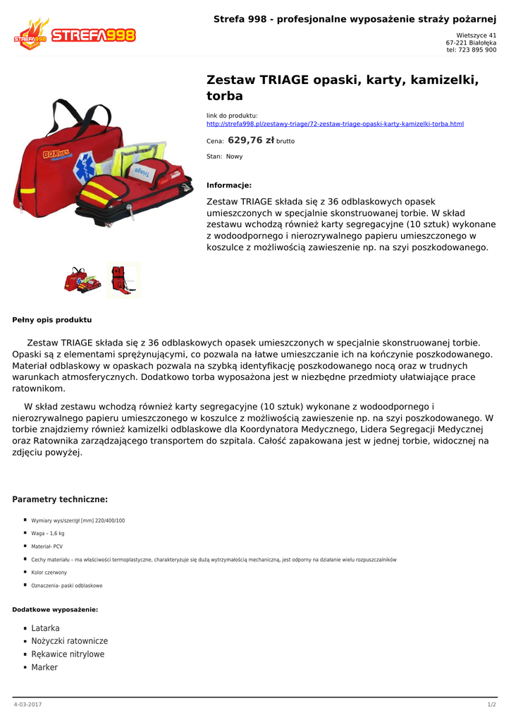 Strefa 998 - profesjonalne wyposażenie straży pożarnej Wietszyce 41 67-221 Białołęka tel: 723 895 900 Zestaw TRIAGE opaski, karty, kamizelki, torba link do produktu: http://strefa998.pl/zestawy-triage/72-zestaw-triage-opaski-karty-kamizelki-torba.html Cena: 629,76 zł brutto Stan: Nowy Informacje: Zestaw TRIAGE składa się z 36 odblaskowych opasek umieszczonych w specjalnie skonstruowanej torbie. W skład zestawu wchodzą również karty segregacyjne (10 sztuk) wykonane z wodoodpornego i nierozrywalnego papieru umieszczonego w koszulce z możliwością zawieszenie np. na szyi poszkodowanego. Pełny opis produktu Zestaw TRIAGE składa się z 36 odblaskowych opasek umieszczonych w specjalnie skonstruowanej torbie. Opaski są z elementami sprężynującymi, co pozwala na łatwe umieszczanie ich na kończynie poszkodowanego. Materiał odblaskowy w opaskach pozwala na szybką identyfikację poszkodowanego nocą oraz w trudnych warunkach atmosferycznych. Dodatkowo torba wyposażona jest w niezbędne przedmioty ułatwiające prace ratownikom. W skład zestawu wchodzą również karty segregacyjne (10 sztuk) wykonane z wodoodpornego i nierozrywalnego papieru umieszczonego w koszulce z możliwością zawieszenie np. na szyi poszkodowanego. W torbie znajdziemy również kamizelki odblaskowe dla Koordynatora Medycznego, Lidera Segregacji Medycznej oraz Ratownika zarządzającego transportem do szpitala. Całość zapakowana jest w jednej torbie, widocznej na zdjęciu powyżej. Parametry techniczne: Wymiary wys/szer/gł [mm] 220/400/100 Waga – 1,6 kg Materiał- PCV Cechy materiału – ma właściwości termoplastyczne, charakteryzuje się dużą wytrzymałością mechaniczną, jest odporny na działanie wielu rozpuszczalników Kolor czerwony Oznaczenia- paski odblaskowe Dodatkowe wyposażenie: Latarka Nożyczki ratownicze Rękawice nitrylowe Marker 4-03-2017 1/2 Zastosowanie: Segregacja medyczna poszkodowanych Kolory opasek: Kolor zielony - Pomoc Odroczona Kolor żółty – Pomoc Pilna Kolor czerwony - Pomoc Natychmiastowa Kolor Biały - Zmarły 4-03-2017 2/2