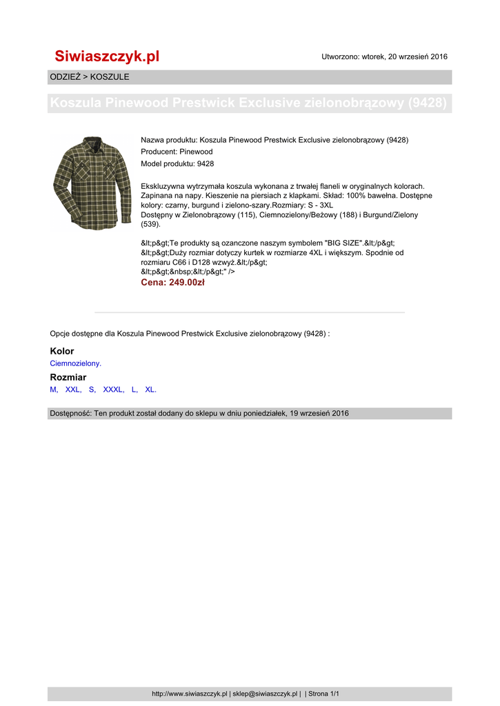 Siwiaszczyk.pl Utworzono: wtorek, 20 wrzesień 2016 ODZIEŻ > KOSZULE Koszula Pinewood Prestwick Exclusive zielonobrązowy (9428) Nazwa produktu: Koszula Pinewood Prestwick Exclusive zielonobrązowy (9428) Producent: Pinewood Model produktu: 9428 Ekskluzywna wytrzymała koszula wykonana z trwałej flaneli w oryginalnych kolorach. Zapinana na napy. Kieszenie na piersiach z klapkami. Skład: 100% bawełna. Dostępne kolory: czarny, burgund i zielono-szary.Rozmiary: S - 3XL Dostępny w Zielonobrązowy (115), Ciemnozielony/Beżowy (188) i Burgund/Zielony (539). <p>Te produkty są ozanczone naszym symbolem "BIG SIZE".</p> <p>Duży rozmiar dotyczy kurtek w rozmiarze 4XL i większym. Spodnie od rozmiaru C66 i D128 wzwyż.</p> <p> </p>" /> Cena: 249.00zł Opcje dostępne dla Koszula Pinewood Prestwick Exclusive zielonobrązowy (9428) : Kolor Ciemnozielony. Rozmiar M, XXL, S, XXXL, L, XL. Dostępność: Ten produkt został dodany do sklepu w dniu poniedziałek, 19 wrzesień 2016 http://www.siwiaszczyk.pl | [email protected] | | Strona 1/1