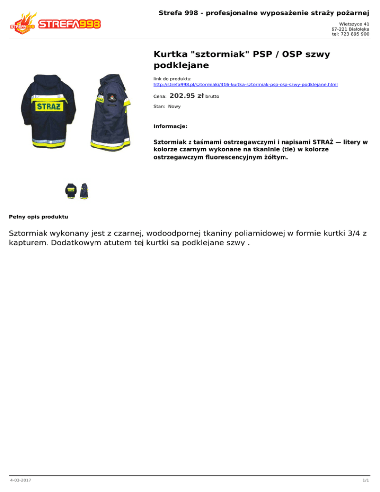 Strefa 998 - profesjonalne wyposażenie straży pożarnej Wietszyce 41 67-221 Białołęka tel: 723 895 900 Kurtka "sztormiak" PSP / OSP szwy podklejane link do produktu: http://strefa998.pl/sztormiaki/416-kurtka-sztormiak-psp-osp-szwy-podklejane.html Cena: 202,95 zł brutto Stan: Nowy Informacje: Sztormiak z taśmami ostrzegawczymi i napisami STRAŻ — litery w kolorze czarnym wykonane na tkaninie (tle) w kolorze ostrzegawczym fluorescencyjnym żółtym. Pełny opis produktu Sztormiak wykonany jest z czarnej, wodoodpornej tkaniny poliamidowej w formie kurtki 3/4 z kapturem. Dodatkowym atutem tej kurtki są podklejane szwy . 4-03-2017 1/1