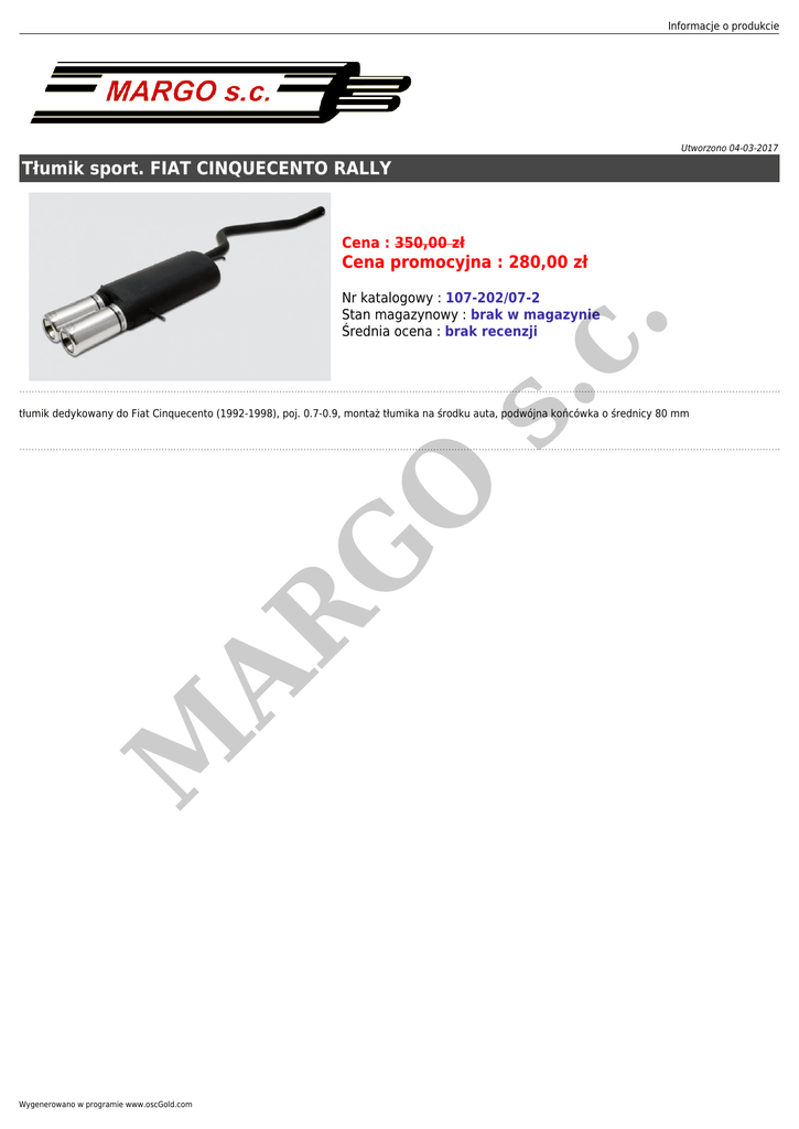 Informacje o produkcie Utworzono 04-03-2017 Tłumik sport. FIAT CINQUECENTO RALLY Cena : 350,00 zł Cena promocyjna : 280,00 zł s. c . Nr katalogowy : 107-202/07-2 Stan magazynowy : brak w magazynie Średnia ocena : brak recenzji M AR G O tłumik dedykowany do Fiat Cinquecento (1992-1998), poj. 0.7-0.9, montaż tłumika na środku auta, podwójna końcówka o średnicy 80 mm Wygenerowano w programie www.oscGold.com
