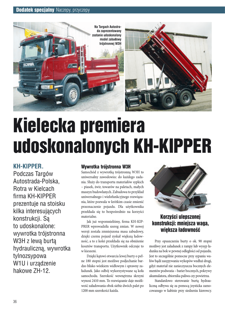Dodatek specjalny Naczepy, przyczepy Na Targach Autostrada zaprezentowany zostanie udoskonalony model zabudowy trójstronnej W3H Kielecka premiera udoskonalonych KH-KIPPER KH-KIPPER. Podczas Targów Autostrada-Polska, Rotra w Kielcach firma KH-KIPPER prezentuje na stoisku kilka interesujących konstrukcji. Są to udoskonalone: wywrotka trójstronna W3H z lewą burtą hydrauliczną, wywrotka tylnozsypowa W1U i urządzenie hakowe ZH-12. 36 Wywrotka trójstronna W3H Samochód z wywrotką trójstronną W3H to uniwersalny zawodowiec do każdego zadania. Służy do transportu materiałów sypkich – piasek, żwir, towarów na paletach, małych maszyn budowlanych. Zabudowa to przykład uniwersalnego i wielofunkcyjnego rozwiązania, które pozwala w krótkim czasie zmienić przeznaczenie pojazdu. Dla użytkownika przekłada się to bezpośrednio na korzyści materialne. Jak już wspomnieliśmy, firma KH-KIPPRER wprowadziła szereg zmian. W nowej wersji została zmniejszona masa zabudowy, dzięki czemu pojazd zyskał większą ładowność, a to z kolei przekłada się na obniżenie kosztów transportu. Użytkownik odczuje to w kieszeni. Dzięki kątowi otwarcia lewej burty o pełne 180 stopni jest możliwe podjechanie bardzo blisko wózkiem widłowym i sprawny załadunek. Jako odbój wykorzystywane są koła samochodu. Szerokość wewnętrzna skrzyni wynosi 2410 mm. To rozwiązanie daje możliwość załadowania obok siebie dwóch palet po 1200 mm szerokości każda. Korzyści ulepszonej konstrukcji: mniejsza waga, większa ładowność Przy opuszczeniu burty o ok. 90 stopni możliwy jest załadunek z rampy lub wysyp ładunku na bok w pewnej odległości od pojazdu. Jest to szczególnie pomocne przy sypaniu wałów bądź zasypywaniu wykopów wzdłuż drogi, gdyż materiał nie zanieczyszcza bocznych elementów podwozia – barier bocznych, pokrywy akumulatora, zbiornika paliwa czy powietrza. Standardowo sterowanie burtą hydrauliczną odbywa się za pomocą joysticka zamocowanego w kabinie przy siedzeniu kierowcy. Obsługa jest możliwa zarówno z ziemi, jak i z siedzenia bez konieczności wysiadania z kabiny, co jest ważne przy pracy w ciężkich warunkach terenowych bądź przy złej pogodzie. Prawa burta z górnymi zawiasami otwiera się dzięki centralnemu zamkowi na burcie przedniej, a burta tylna z górnymi zawiasami otwierana jest automatycznie przy podniesieniu skrzyni. Zastosowanie nowoczesnych stali trudnościeralnych, a co za tym idzie brak potrzeby stosowania bocznego użebrowania wzmacniającego w postaci tzw. szpant znacząco wpływają na obniżenie wagi zabudowy. Burty boczne gięte dają również większą sztywność uzyskaną w trzech liniach gięcia. Zastosowanie wysokojakościowych stali w znaczący sposób wydłuża czas bezawaryjnej pracy wywrotki. Mniejsza liczba wzmocnień oraz cieńsza blacha w stosunku do zwykłych stali to oszczędność wagi, a co za tym idzie większa ładowność pojazdu. Skraca się również czas produkcji, ze względu na mniejszy nakład pracy związany ze spawaniem i brakiem wzmocnień. Skrzynia wywrotki na podwoziu MAN 8x6 oraz Scania 6x4 posiada dodatkowo tylną szuflę zsypową SNEEP na równi z podłogą, zamiast SNEEP demontowanego. Takie rozwiązanie zapobiega zaleganiu lepkiego materiału, które z czasem uniemożliwiłoby domykanie burty tylnej. Jako opcja występuje sterowanie radiowe wszelkimi funkcjami wywrotki, aluminiowy dach otwierany hydraulicznie, prawa burta hydrauliczna lub uchylna zamiast stałej, żuraw hydrauliczny, tylna burta w formie klapo-drzwi, nastawki zwiększające objętość skrzyni. Zabudowa wywrotka tylnozsypowa W1U Skrzynię W1U charakteryzuje półokrągły kształt zapobiegający zaleganiu materiału podczas wyładunku. Udoskonalona zabudowa jest lżejsza i znacznie sztywniejsza. Cechu- W tym roku do oferty urządzeń hakowych na podwoziach 2-os. dołączy hakowiec o udźwigu 12 t ję ją w związku z tym wysoka produktywność i wytrzymałość. Dodatkowo przy projektowaniu nowej zabudowy duży nacisk położono na wzrost poziomu bezpieczeństwa. Poprzez obniżenie środka ciężkości ułatwiony jest wysyp ładunku. Hakowiec ZH-12 na DAF FL Urządzenie hakowe ZH-12 uzupełnia ofertę hakowców. Do tej pory KH-KIPPER oferował urządzenia o ładowności 6 i 8 ton. W Kielcach KH-KIPPER pokaże tę zabudowę na nowym DAF FL. Urządzenie hakowe ZH-12 wyposażone jest w hydrauliczną blokadę kontenera oraz sterowanie z kabiny kierowcy. Długość gabarytowa urządzenia hakowego wynosi 3900 mm. Dolna rama i łączniki urządzenia wykonane są ze specjalnej stali o dużej wytrzymałości plastycznej, dźwignia hakowa oraz sam hak wykonane są ze stali renomowanych firm o podwyższonych właściwościach mechanicznych. Urządzenia charakteryzują się niską masą własną dzięki konstrukcji ze stali o dużej wytrzymałości. Hak posiada grawitacyjne zabezpieczenie eliptyczne. Ładunek jest przesuwany łagodnie po rolkach. Poprawne zablokowanie kontene- Opcje: ładowność 6, 9 lub nawet 12 ton - nowość ra sygnalizowane jest lampką kontrolną. Tam gdzie jest to wymagane resory odciążane są za pomocą siłowników lub rolką podpierającą sterowanymi ze stanowiska sterowniczego. Siłowniki posiadają zawory zabezpieczające przed niekontrolowanym opadnięciem ładunku i uszkodzeniem urządzenia w przypadku rozerwania przewodów hydraulicznych. Urządzenie wyposażone jest w hydrauliczną blokadę kontenera oraz sterowanie z kabiny kierowcy. Przy rozładunku i załadunku pustego kontenera lub obciążonego częściowo istnieje możliwość przejścia w szybszy tryb pracy urządzenia hakowego przez odpowiednie przełączenie dźwigni sterowania. Nowe urządzenie hakowe jest łatwe w montażu i w całości przykręcane do podwozia. Ciekawostkę stanowi fakt, że model prezentowany na Targach wyposażono w system automatycznego smarowania firmy Groeneveld. Skraca to znacząco czas obsługi. Urządzenia hako