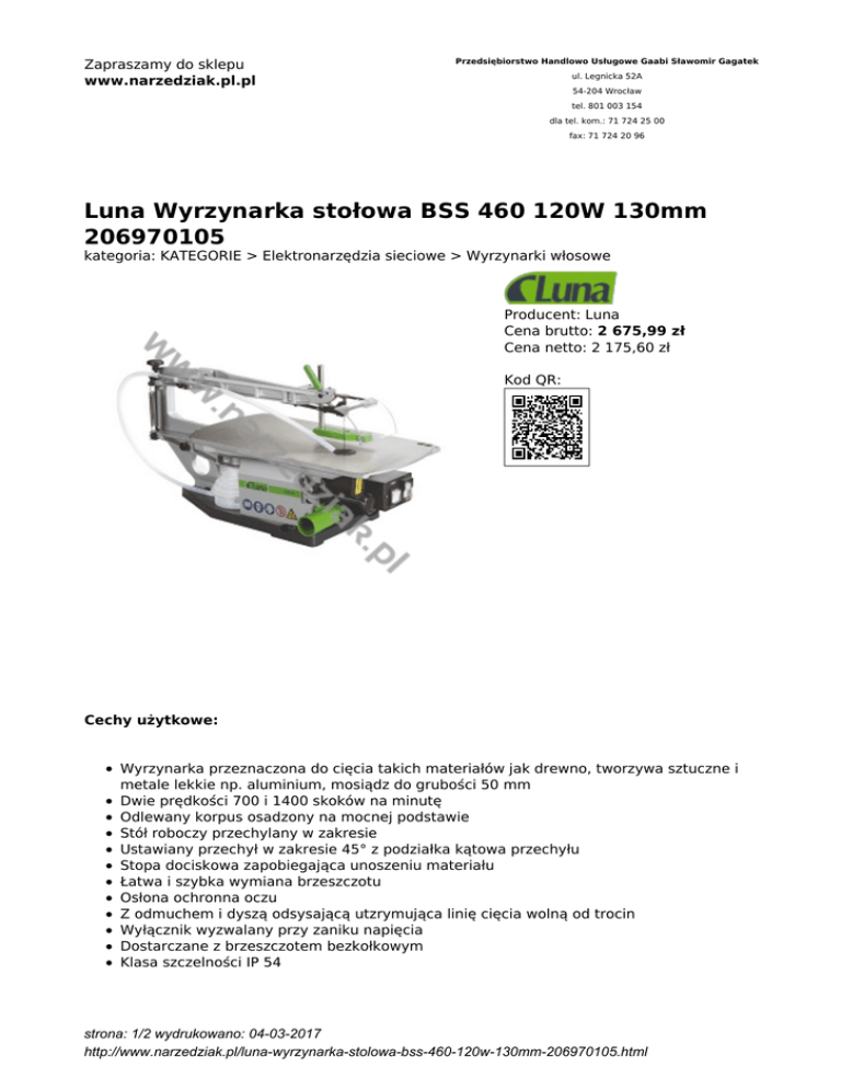 Zapraszamy do sklepu www.narzedziak.pl.pl Przedsiębiorstwo Handlowo Usługowe Gaabi Sławomir Gagatek ul. Legnicka 52A 54-204 Wrocław tel. 801 003 154 dla tel. kom.: 71 724 25 00 fax: 71 724 20 96 Luna Wyrzynarka stołowa BSS 460 120W 130mm 206970105 kategoria: KATEGORIE > Elektronarzędzia sieciowe > Wyrzynarki włosowe Producent: Luna Cena brutto: 2 675,99 zł Cena netto: 2 175,60 zł Kod QR: Cechy użytkowe: Wyrzynarka przeznaczona do cięcia takich materiałów jak drewno, tworzywa sztuczne i metale lekkie np. aluminium, mosiądz do grubości 50 mm Dwie prędkości 700 i 1400 skoków na minutę Odlewany korpus osadzony na mocnej podstawie Stół roboczy przechylany w zakresie Ustawiany przechył w zakresie 45° z podziałka kątowa przechyłu Stopa dociskowa zapobiegająca unoszeniu materiału Łatwa i szybka wymiana brzeszczotu Osłona ochronna oczu Z odmuchem i dyszą odsysającą utzrymująca linię cięcia wolną od trocin Wyłącznik wyzwalany przy zaniku napięcia Dostarczane z brzeszczotem bezkołkowym Klasa szczelności IP 54 strona: 1/2 wydrukowano: 04-03-2017 http://www.narzedziak.pl/luna-wyrzynarka-stolowa-bss-460-120w-130mm-206970105.html Dane techniczne: Odległość brzeszczot-ramię: 460 mm Przechył stołu w prawo-lewo: 10° - 0° - 45° Maksymalna grubość materiału: 65 mm Długość ostrza: 130 mm Skok: 20 mm Częstotliwość pracy: 700/1400 skoków/min Wymairy stołu: 460 x 235 mm Króciec odciągowy Ø: 32 mm Napięcie zasilania: 230 V 1-faz. 50 Hz Moc silnika: 120 W (0,12 kW) Wymiary: 620 x 285 x 310 mm Masa: 28 kg strona: 2/2 wydrukowano: 04-03-2017 http://www.narzedziak.pl/luna-wyrzynarka-stolowa-bss-460-120w-130mm-206970105.html
