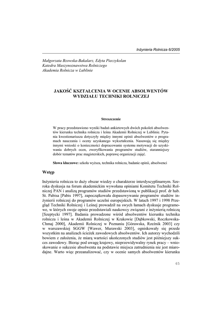 InŜynieria Rolnicza 6/2005 Małgorzata Bzowska-Bakalarz, Edyta Pieczykolan Katedra Maszynoznawstwa Rolniczego Akademia Rolnicza w Lublinie JAKOŚĆ KSZTAŁCENIA W OCENIE ABSOLWENTÓW WYDZIAŁU TECHNIKI ROLNICZEJ Streszczenie W pracy przedstawiono wyniki badań ankietowych dwóch pokoleń absolwentów kierunku technika rolnicza i leśna Akademii Rolniczej w Lublinie. Pytania kwestionariusza dotyczyły między innymi opinii absolwentów o programach nauczania i oceny uzyskanego wykształcenia. Nasuwają się między innymi wnioski o konieczności dopracowanie systemu motywacji do uzyskiwania dobrych ocen, zweryfikowania programów studiów, staranniejszy dobór tematów prac magisterskich, poprawę organizacji zajęć. Słowa kluczowe: szkoła wyŜsza, technika rolnicza, badanie opinii, absolwenci Wstęp InŜynieria rolnicza to duŜy obszar wiedzy o charakterze interdyscyplinarnym. Szeroka dyskusja na forum akademickim wywołana opiniami Komitetu Techniki Rolniczej PAN i analizą programów studiów przedstawioną w publikacji prof. dr hab. St. Pabisa [Pabis 1997], zapoczątkowała dopasowywanie programów studiów inŜynierii rolniczej do programów uczelni europejskich. W latach 1997 i 1998 Przegląd Techniki Rolniczej i Leśnej prowadził na swych łamach dyskusje programowe, w których swoje opinie przedstawiali naukowcy związani z inŜynierią rolniczą [Szeptycki 1997]. Badania prowadzone wśród absolwentów kierunku technika rolnicza i leśna w Akademii Rolniczej w Krakowie [Dąbkowski, RoczkowskaChmaj 2000], Akademii Rolniczej w Poznaniu [Górawska, Rzeźnik 2003] czy w warszawskiej SGGW [Wawer, Murawski 2003], ogniskowały się przede wszystkim na analizach ścieŜek zawodowych absolwentów. Ich autorzy wychodzili bowiem z załoŜenia, Ŝe miarą wartości ukończonych studiów jest późniejszy sukces zawodowy. Biorąc pod uwagę krajowy, nieprzewidywalny rynek pracy – wnioskowanie o sukcesie absolwenta na podstawie miejsca zatrudnienia nie jest miarodajne. Warto więc przeanalizować, czy w ocenie samych absolwentów kierunku 65 Małgorzata Bzowska-Bakalarz, Edyta Pieczykolan Technika rolnicza i leśna tak wąska specjalizacja stwarza moŜliwość przystosowania się do trudnej sytuacji na rynku pracy oraz czy daje ona szansę pomyślnego startu w karierze zawodowej. W 2001 roku Senat Akademii Rolniczej w Lublinie przyjął uchwałę o sprawie wprowadzenia systemu zarządzania jakością kształcenia. Jednym z elementów tego systemu jest takŜe badanie opinii studentów i monitorowanie ich losów. Cel i metoda badań Celem przeprowadzonego na Wydziale Techniki Rolniczej w Lublinie eksperymentu było poznanie opinii absolwentów na temat przebiegu i organizacji studiów oraz zbadanie jak wprowadzone zmiany wpłynęły na subiektywną ocenę jakości kształcenia dwóch grup absolwentów, którzy uzyskali dyplomy w latach siedemdziesiątych i w roku 2000. Badania przeprowadzono metodą ankietową. Ankieta składała się z instrukcji wprowadzającej, wyjaśniającej cel badania i z listy pytań w działach: dane podstawowe, przygotowanie do studiów, studia, okres po studiach. Przebadano dwie 36-osobowe grupy absolwentów kierunku Technika rolnicza i leśna: absolwentów, którzy ukończyli studia w latach 2000 i 2001 (19 osób za specjalności Technika rolno-spoŜywcza i 17 osób ze specjalności Technika komputerowa w inŜynierii rolniczej) oraz 36 absolwentów, którzy ukończyli studia w latach 1971, 1972 i 1973. Badania prowadzono w bezpośrednim kontakcie z respondentami. Wyniki Kierunek studiów feminizuje się. Na przestrzeni 30 lat udział kobiet wzrósł z 11 do 41%. Spadła natomiast liczba studentów pochodzących ze wsi (rys. 1). Obecnie mamy o 20% więcej studentów z przygotowaniem zawodowym (absolwenci technikum) (rys. 2), co ma swoje odzwierciedlenie w trudnościach z realizacją przedmiotów podstawowych. Absolwenci z lat 2000, 2001 zdawali sobie jednak sprawę z gorszego przygotowania do studiów i w 65% korzystali z kursów przygotowawczych. Przy wyborze kierunku studiów absolwenci starszych roczników kierowali się głównie zainteresowaniami, natomiast wśród młodszych w równym stopniu decydowały przypadek i zainteresowania. Świadczy to o niezdecydowaniu kandydatów na studia, a takŜe o słabej promocji uczelni. Oferta kierunkowa uczelni tylko w 15% pomaga w wyborze kierunku, a prestiŜ szkoły odgrywa rolę marginalną (rys. 3). 66 Jakość kształcenia... Miasto do 30. tys. 6% Wieś 86% Rys. 1. Fig. 1. 100% Miasto powyŜej 30 tys. 8% Miasto do 30. tys. 6% Wieś 47% Rok ukończenia 1971/1973 Rok ukończenia 1971/1973 Rok ukończenia 2000/2001 100% 80% 60% 60% 59% 40% 53% 40% 35% 33% 20% 20% 8% 0% Liceum ogólnokształcące Fig. 2. Rok ukończenia 2000/2001 Pochodzenie absolwentów Graduates background 80% Rys. 2. Miasto powyŜej 30 tys. 47% 12% 0% Szkoła o profilu rolniczym Liceum ogólnokształcące Szkoła o profilu rolniczym Rodzaj ukończonej szkoły średniej Type of high school finished 50% Rok ukończenia 1971/1973 Rok ukończenia2000/2001 43,0% 40% 30% 23,5% 20% 20,0% 20,0% 15,0% 10% 7,0% 7,5% 8,0% 0% Zainteresowania Przypadek Pozycja (prestiŜ) Oferta uczelni kierunkowa i programowa Uczelni Rys. 3. Fig. 3. Powody wyboru uczelni i kierunku studiów Reasons for choosing the school and studies 67 Małgorzata Bzowska-Bakalarz, Edyta Pieczykolan W czasie studiów wszyscy starsi absolwenci odbywali praktyki zawodowe, natomiast absolwenci z roczników 2000 i 2001 tylko w 33%. Młodsi absolwenci (2000, 2001) w większym stopniu niŜ starsi uznają sposób oceniania za sprawiedliwy, choć w obu grupach wiekowych prawie połowa nie przywiązywała wagi do ocen i wcale nie zaleŜało im na dobrych ocenach. Jednak tylko 35% absolwentów uwaŜa, Ŝe nie powinno się wystawiać ocen wartościujących, a jedynie oceniać zdał – nie zdał (rys. 4). 100% Czy byłeś oceniany sprawiedliwie? 80% 82% 60% 40% 46% 20% 0% Rocznik 1991/1973 100% Rocznik 2