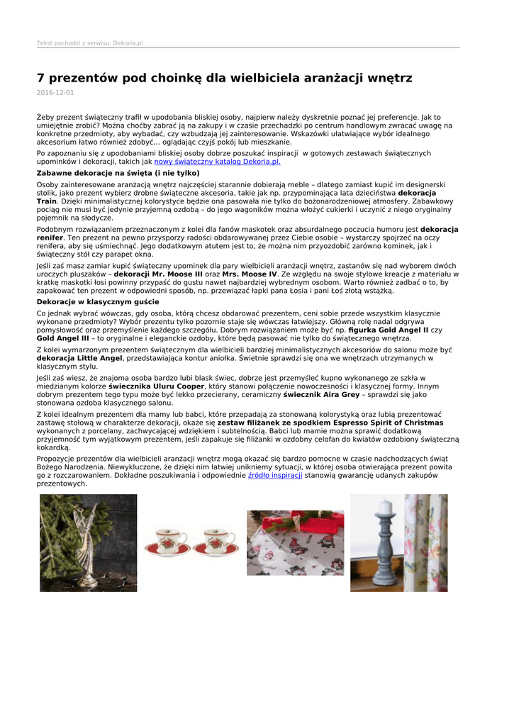 Tekst pochodzi z serwisu: Dekoria.pl 7 prezentów pod choinkę dla wielbiciela aranżacji wnętrz 2016-12-01 Żeby prezent świąteczny trafił w upodobania bliskiej osoby, najpierw należy dyskretnie poznać jej preferencje. Jak to umiejętnie zrobić? Można choćby zabrać ją na zakupy i w czasie przechadzki po centrum handlowym zwracać uwagę na konkretne przedmioty, aby wybadać, czy wzbudzają jej zainteresowanie. Wskazówki ułatwiające wybór idealnego akcesorium łatwo również zdobyć… oglądając czyjś pokój lub mieszkanie. Po zapoznaniu się z upodobaniami bliskiej osoby dobrze poszukać inspiracji w gotowych zestawach świątecznych upominków i dekoracji, takich jak nowy świąteczny katalog Dekoria.pl. Zabawne dekoracje na święta (i nie tylko) Osoby zainteresowane aranżacją wnętrz najczęściej starannie dobierają meble – dlatego zamiast kupić im designerski stolik, jako prezent wybierz drobne świąteczne akcesoria, takie jak np. przypominająca lata dzieciństwa dekoracja Train. Dzięki minimalistycznej kolorystyce będzie ona pasowała nie tylko do bożonarodzeniowej atmosfery. Zabawkowy pociąg nie musi być jedynie przyjemną ozdobą – do jego wagoników można włożyć cukierki i uczynić z niego oryginalny pojemnik na słodycze. Podobnym rozwiązaniem przeznaczonym z kolei dla fanów maskotek oraz absurdalnego poczucia humoru jest dekoracja renifer. Ten prezent na pewno przysporzy radości obdarowywanej przez Ciebie osobie – wystarczy spojrzeć na oczy renifera, aby się uśmiechnąć. Jego dodatkowym atutem jest to, że można nim przyozdobić zarówno kominek, jak i świąteczny stół czy parapet okna. Jeśli zaś masz zamiar kupić świąteczny upominek dla pary wielbicieli aranżacji wnętrz, zastanów się nad wyborem dwóch uroczych pluszaków – dekoracji Mr. Moose III oraz Mrs. Moose IV. Ze względu na swoje stylowe kreacje z materiału w kratkę maskotki łosi powinny przypaść do gustu nawet najbardziej wybrednym osobom. Warto również zadbać o to, by zapakować ten prezent w odpowiedni sposób, np. przewiązać łapki pana Łosia i pani Łoś złotą wstążką. Dekoracje w klasycznym guście Co jednak wybrać wówczas, gdy osoba, którą chcesz obdarować prezentem, ceni sobie przede wszystkim klasycznie wykonane przedmioty? Wybór prezentu tylko pozornie staje się wówczas łatwiejszy. Główną rolę nadal odgrywa pomysłowość oraz przemyślenie każdego szczegółu. Dobrym rozwiązaniem może być np. figurka Gold Angel II czy Gold Angel III – to oryginalne i eleganckie ozdoby, które będą pasować nie tylko do świątecznego wnętrza. Z kolei wymarzonym prezentem świątecznym dla wielbicieli bardziej minimalistycznych akcesoriów do salonu może być dekoracja Little Angel, przedstawiająca kontur aniołka. Świetnie sprawdzi się ona we wnętrzach utrzymanych w klasycznym stylu. Jeśli zaś wiesz, że znajoma osoba bardzo lubi blask świec, dobrze jest przemyśleć kupno wykonanego ze szkła w miedzianym kolorze świecznika Uluru Cooper, który stanowi połączenie nowoczesności i klasycznej formy. Innym dobrym prezentem tego typu może być lekko przecierany, ceramiczny świecznik Aira Grey – sprawdzi się jako stonowana ozdoba klasycznego salonu. Z kolei idealnym prezentem dla mamy lub babci, które przepadają za stonowaną kolorystyką oraz lubią prezentować zastawę stołową w charakterze dekoracji, okaże się zestaw filiżanek ze spodkiem Espresso Spirit of Christmas wykonanych z porcelany, zachwycającej wdziękiem i subtelnością. Babci lub mamie można sprawić dodatkową przyjemność tym wyjątkowym prezentem, jeśli zapakuje się filiżanki w ozdobny celofan do kwiatów ozdobiony świąteczną kokardką. Propozycje prezentów dla wielbicieli aranżacji wnętrz mogą okazać się bardzo pomocne w czasie nadchodzących świąt Bożego Narodzenia. Niewykluczone, że dzięki nim łatwiej unikniemy sytuacji, w której osoba otwierająca prezent powita go z rozczarowaniem. Dokładne poszukiwania i odpowiednie źródło inspiracji stanowią gwarancję udanych zakupów prezentowych.