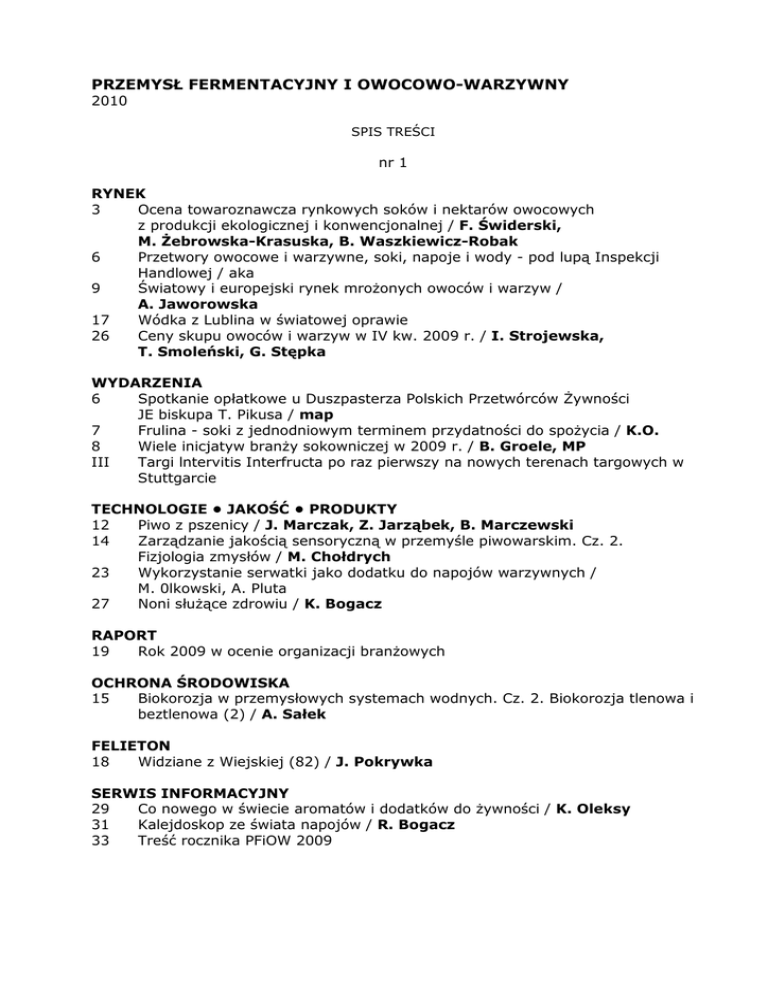 PRZEMYSŁ FERMENTACYJNY I OWOCOWO-WARZYWNY 2010 SPIS TREŚCI nr 1 RYNEK 3 Ocena towaroznawcza rynkowych soków i nektarów owocowych z produkcji ekologicznej i konwencjonalnej / F. Świderski, M. śebrowska-Krasuska, B. Waszkiewicz-Robak 6 Przetwory owocowe i warzywne, soki, napoje i wody - pod lupą Inspekcji Handlowej / aka 9 Światowy i europejski rynek mroŜonych owoców i warzyw / A. Jaworowska 17 Wódka z Lublina w światowej oprawie 26 Ceny skupu owoców i warzyw w IV kw. 2009 r. / I. Strojewska, T. Smoleński, G. Stępka WYDARZENIA 6 Spotkanie opłatkowe u Duszpasterza Polskich Przetwórców śywności JE biskupa T. Pikusa / map 7 Frulina - soki z jednodniowym terminem przydatności do spoŜycia / K.O. 8 Wiele inicjatyw branŜy sokowniczej w 2009 r. / B. Groele, MP III Targi lntervitis Interfructa po raz pierwszy na nowych terenach targowych w Stuttgarcie TECHNOLOGIE • JAKOŚĆ • PRODUKTY 12 Piwo z pszenicy / J. Marczak, Z. Jarząbek, B. Marczewski 14 Zarządzanie jakością sensoryczną w przemyśle piwowarskim. Cz. 2. Fizjologia zmysłów / M. Chołdrych 23 Wykorzystanie serwatki jako dodatku do napojów warzywnych / M. 0lkowski, A. Pluta 27 Noni słuŜące zdrowiu / K. Bogacz RAPORT 19 Rok 2009 w ocenie organizacji branŜowych OCHRONA ŚRODOWISKA 15 Biokorozja w przemysłowych systemach wodnych. Cz. 2. Biokorozja tlenowa i beztlenowa (2) / A. Sałek FELIETON 18 Widziane z Wiejskiej (82) / J. Pokrywka SERWIS INFORMACYJNY 29 Co nowego w świecie aromatów i dodatków do Ŝywności / K. Oleksy 31 Kalejdoskop ze świata napojów / R. Bogacz 33 Treść rocznika PFiOW 2009 nr 2 RAPORT 4 Kłopotliwe pozostałości środków ochrony roślin w mroŜonkach - przetwórcy szukają rozwiązania problemu / A.Ł. 11 Rok 2009 w ocenie organizacji branŜowych RYNEK 6 Polski handel zagraniczny mroŜonymi owocami i warzywami / B. Nosecka, A. Bugała 10 SprzedaŜ mroŜonek w Polsce - wybrane dane WYDARZENIA 9 Docenione sukcesy kampanii KUPS „5 porcji warzyw, owoców lub soku" / B. Groele 13 „śywność i Ŝywienie w XXI wieku - wizja rozwoju polskiego sektora spoŜywczego" 14 Healthy & Wellness Food - jedzenie dla zdrowia i przyjemności / A. Ł. 17 XV Szkota Technologii Fermentacji, Kraków - Kocierz, 21-24 IV 2010 r. / M. Przegalińska 20 O propozycjach zmian prawa regulującego funkcjonowanie przemysłu spirytusowego / H. Kubik 26 Drinktec 2009 (cz. 2) - w reporterskim skrócie / MP 28 Noworoczne spotkania władz i członków Stowarzyszenia InŜynierów i Techników Przemysłu SpoŜywczego / M. Wojnarowska, E. Górecka 29 Kolejne produkty oznaczone znakiem Poznaj Dobrą śywność / map 36 POLEKO 2009 - pod hasłem „Ekologia to się opłaca" / K. O. SUROWCE • TECHNOLOGIE 15 Świdośliwa - jeszcze jeden wartościowy krzew owocowy do masowej uprawy / A. Mika 18 Zdrowe sadzonki chmielu szansą na lepszą jakość surowca / U. Skomra 21 Produkcja biopaliwa z lignocelulozowych surowców rolniczych / K. Leja, G. Lewandowicz 23 Inhibitory fermentacji etanolowej w winiarstwie / P. Sroka, U. Błaszczyk FELIETON 27 Widziane z Wiejskiej (83) / T. Pokrywka SERWIS INFORMACYJNY 30 Napoje funkcjonalne /A. Bogacz 32 Co nowego w świecie aromatów i dodatków do Ŝywności / K. Oleksy 34 Kalejdoskop ze świata napojów / R Bogacz Z śAŁOBNEJ KARTY 36 Prof. dr hab. Bohdan Drzazga (1934-2009) nr 3 WYWIADY 3 Browar śywiec w drodze na Mount Everest. Rozmowa z J. Dwornickim, dyr. Browaru śywiec / M. J. Przegalińska 4 W dobie kryzysu stawiany na jakość, a nie na zamienniki i agresywne reklamy / K. Baranowski SUROWCE • TECHNOLOGIE 7 Dynamika i efekty końcowe fermentacji stęŜonych (HG i VHG) brzeczek piwowarskich / P. Zarychta, E. Dziuba, J. Chmielewska, B. Foszczyńska 14 MoŜliwość wykorzystania droŜdŜy pofermentacyjnych w produkcji autolizatów droŜdŜowych / B. Podpora, F. Świderski 2O Krones TwinPro. Innowacyjna koncepcja piwnicy fermentacyjno-leŜakowej / P Gattermeyer 3O Tunel zamraŜalniczy Freshline® DM łączy dwa systemy zamraŜania Ŝywności w jednym urządzeniu 34 Bimbrownictwo - wczoraj i dziś / L Wiwała JAKOŚĆ 10 Zarządzanie jakością sensoryczną w przemyśle piwowarskim - szkolenie „Piwa Świata" / M. Chołdrych 17 Eurowater. Uzdatnianie wody w browarnictwie / J. Grzech 26 Wpływ obróbki enzymatycznej miazgi na zawartość związków polifenolowych, aktywność przeciwutleniającą i jakość mętnego soku jabłkowego / P. Rubiński, J. Oszmiański RYNEK 12 Rynek piwa w Polsce zmniejszył się znacząco / MJP 13 Nielsen. SprzedaŜ piwa w roku 2009 / M. Woroniecka 22 Obroty polskiego handlu zagranicznego zagęszczonymi sokami owocowymi / B. Nosecka 29 Trendy rozwoju produktów mroŜonych w Polsce / A. Ł. WYDARZENIA 37 Targowe spotkania branŜy spoŜywczej w Poznaniu 38 Drinktec 2009 (cz. 3) - w reporterskim skrócie / map FELIETON 36 Widziane z Wiejskiej (84) / T. Pokrywka SERWIS INFORMACYJNY 39 Napoje funkcjonalne / A Bogacz 41 Co nowego w świecie aromatów i dodatków do Ŝywności / K. Oleksy 43 Kalejdoskop ze świata napojów / P. Bogacz nr 4 WYWIADY 1 Nie moŜemy zmienić kierunku wiatru, ale moŜemy odpowiednio ustawić Ŝagle. Rozmowa z R. Zarembą, dyr. zarządzającym Wild Flavors Polska Sp. z o.o. / M. Przegalińska, A. Lazarowicz 13 Nowe alternatywne kierunki w produkcji soków - czyli jak zrobić sok naturalnie mętny najwyŜszej jakości. Rozmowa z T. Voglsamem, właścicielem austriackiej firmy Hasenfit / M. Przegalińska RYNEK 6 Rynek soków pitnych, nektarów i napojów owocowych / B. Nosecka 9 SprzedaŜ soków, nektarów i napojów / M. Woroniecka 34 Ceny skupu owoców i warzyw / I. Strojewska, T. Smoleński, G. Stępka SUROWCE • TECHNOLOGIE 10 MoŜliwości zwiększenia konsumpcji soków owocowych poprzez wprowadzenie nowych asortymentów - mętne soki śliwkowe / M. Fastyn, J. Markowski, M. Mieszczakowska-Frąc, W. Płocharski 16 Zaawansowane instalacje oczyszczania ścieków z produkcji soków, napojów i koncentratów - oczyszczalnie ście