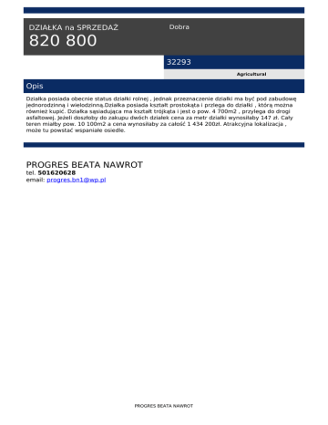 Dobra DZIAŁKA na SPRZEDAŻ 820 800 32293 Agricultural Opis Działka posiada obecnie status działki rolnej , jednak przeznaczenie działki ma być pod zabudowę jednorodzinną i wielodzinną.Działka posiada kształt prostokąta i przlega do działki , którą można również kupić. Działka sąsiadująca ma kształt trójkąta i jest o pow. 4 700m2 , przylega do drogi asfaltowej. Jeżeli doszłoby do zakupu dwóch działek cena za metr działki wynosiłaby 147 zł. Cały teren miałby pow. 10 100m2 a cena wynosiłaby za całość 1 434 200zł. Atrakcyjna lokalizacja , może tu powstać wspaniałe osiedle. PROGRES BEATA NAWROT tel. 501620628 email: [email protected] PROGRES BEATA NAWROT Powered by TCPDF (www.tcpdf.org)