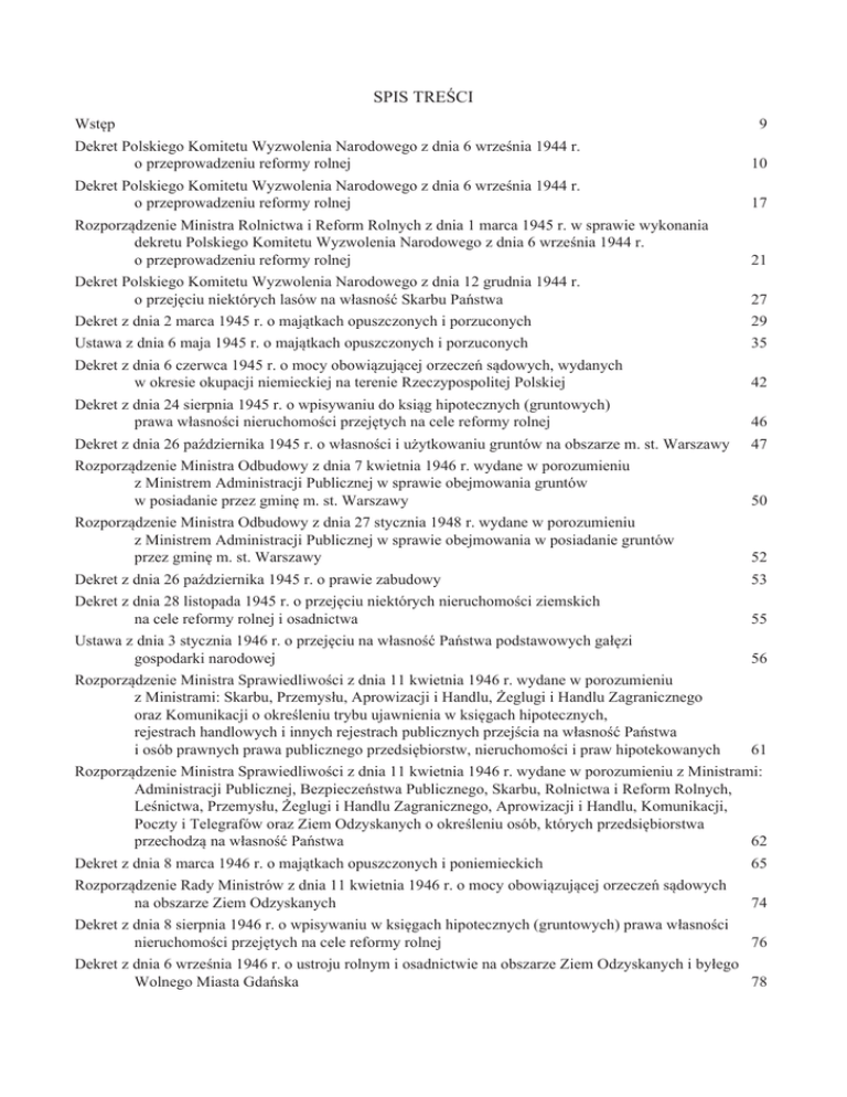 Spis treści Wstęp 9 Dekret Polskiego Komitetu Wyzwolenia Narodowego z dnia 6 września 1944 r. o przeprowadzeniu reformy rolnej 10 Dekret Polskiego Komitetu Wyzwolenia Narodowego z dnia 6 września 1944 r. o przeprowadzeniu reformy rolnej 17 Rozporządzenie Ministra Rolnictwa i Reform Rolnych z dnia 1 marca 1945 r. w sprawie wykonania dekretu Polskiego Komitetu Wyzwolenia Narodowego z dnia 6 września 1944 r. o przeprowadzeniu reformy rolnej 21 Dekret Polskiego Komitetu Wyzwolenia Narodowego z dnia 12 grudnia 1944 r. o przejęciu niektórych lasów na własność Skarbu Państwa 27 Dekret z dnia 2 marca 1945 r. o majątkach opuszczonych i porzuconych 29 Ustawa z dnia 6 maja 1945 r. o majątkach opuszczonych i porzuconych 35 Dekret z dnia 6 czerwca 1945 r. o mocy obowiązującej orzeczeń sądowych, wydanych w okresie okupacji niemieckiej na terenie Rzeczypospolitej Polskiej 42 Dekret z dnia 24 sierpnia 1945 r. o wpisywaniu do ksiąg hipotecznych (gruntowych) prawa własności nieruchomości przejętych na cele reformy rolnej 46 Dekret z dnia 26 października 1945 r. o własności i użytkowaniu gruntów na obszarze m. st. Warszawy 47 Rozporządzenie Ministra Odbudowy z dnia 7 kwietnia 1946 r. wydane w porozumieniu z Ministrem Administracji Publicznej w sprawie obejmowania gruntów w posiadanie przez gminę m. st. Warszawy 50 Rozporządzenie Ministra Odbudowy z dnia 27 stycznia 1948 r. wydane w porozumieniu z Ministrem Administracji Publicznej w sprawie obejmowania w posiadanie gruntów przez gminę m. st. Warszawy 52 Dekret z dnia 26 października 1945 r. o prawie zabudowy 53 Dekret z dnia 28 listopada 1945 r. o przejęciu niektórych nieruchomości ziemskich na cele reformy rolnej i osadnictwa 55 Ustawa z dnia 3 stycznia 1946 r. o przejęciu na własność Państwa podstawowych gałęzi gospodarki narodowej 56 Rozporządzenie Ministra Sprawiedliwości z dnia 11 kwietnia 1946 r. wydane w porozumieniu z Ministrami: Skarbu, Przemysłu, Aprowizacji i Handlu, Żeglugi i Handlu Zagranicznego oraz Komunikacji o określeniu trybu ujawnienia w księgach hipotecznych, rejestrach handlowych i innych rejestrach publicznych przejścia na własność Państwa i osób prawnych prawa publicznego przedsiębiorstw, nieruchomości i praw hipotekowanych 61 Rozporządzenie Ministra Sprawiedliwości z dnia 11 kwietnia 1946 r. wydane w porozumieniu z Ministrami: Administracji Publicznej, Bezpieczeństwa Publicznego, Skarbu, Rolnictwa i Reform Rolnych, Leśnictwa, Przemysłu, Żeglugi i Handlu Zagranicznego, Aprowizacji i Handlu, Komunikacji, Poczty i Telegrafów oraz Ziem Odzyskanych o określeniu osób, których przedsiębiorstwa 62 przechodzą na własność Państwa Dekret z dnia 8 marca 1946 r. o majątkach opuszczonych i poniemieckich 65 Rozporządzenie Rady Ministrów z dnia 11 kwietnia 1946 r. o mocy obowiązującej orzeczeń sądowych na obszarze Ziem Odzyskanych 74 Dekret z dnia 8 sierpnia 1946 r. o wpisywaniu w księgach hipotecznych (gruntowych) prawa własności nieruchomości przejętych na cele reformy rolnej 76 Dekret z dnia 6 września 1946 r. o ustroju rolnym i osadnictwie na obszarze Ziem Odzyskanych i byłego Wolnego Miasta Gdańska 78 —— Rozporządzenie Ministrów: Rolnictwa i Reform Rolnych, Ziem Odzyskanych oraz Administracji Publicznej z dnia 18 czerwca 1947 r. wydane w porozumieniu z Ministrem Skarbu w sprawie przejmowania na własność Państwa nieruchomości ziemskich na mocy art. 41 i 42 86 Rozporządzenie Ministrów: Ziem Odzyskanych, Administracji Publicznej, Rolnictwa i Reform Rolnych, Skarbu oraz Odbudowy z dnia 14 października 1947 r. wydane w porozumieniu z Ministrem Leśnictwa w sprawie włączeń i wydzieleń z zapasu ziemi na obszarze Ziem 88 Dekret z dnia 13 września 1946 r. o wyłączeniu ze społeczeństwa polskiego osób narodowości niemieckiej Dekret z dnia 11 października 1946 r. Prawo rzeczowe 91 94 Dekret z dnia 11 października 1946 r. Prawo o księgach wieczystych 121 Dekret z dnia 11 października 1946 r. Przepisy wprowadzające prawo rzeczowe i prawo o księgach wieczystych 126 Rozporządzenie Ministra Sprawiedliwości z dnia 26 listopada 1946 r. o urządzeniu i prowadzeniu ksiąg wieczystych 139 Rozporządzenie Ministra Sprawiedliwości z dnia 29 listopada 1946 r. o prowadzeniu dotychczasowych ksiąg hipotecznych (gruntowych, wieczystych) po dniu 31 grudnia 1946 r. 150 Rozporządzenie Ministra Sprawiedliwości z dnia 29 listopada 1946 r. o urządzeniu i prowadzeniu zbioru dokumentów oraz o postępowaniu w przedmiocie składania dokumentów 155 Dekret z dnia 15 listopada 1946 r. o zajęciu majątku państw pozostających z Państwem Polskim w stanie wojny w latach 1939-1945 i majątku osób prawnych tych państw oraz o zarządzie przymusowym nad tymi majątkami 158 Dekret z dnia 28 października 1947 r. o mocy prawnej ksiąg wieczystych na obszarze Ziem Odzyskanych i b. Wolnego Miasta Gdańska 160 Ustawa z dnia 18 listopada 1948 r. o przejściu na własność Państwa niektórych lasów i innych gruntów samorządowych 162 Dekret z dnia 27 lipca 1949 r. o przejęciu na własność Państwa nie pozostających w faktycznym władaniu właścicieli nieruchomości ziemskich, położonych w niektórych powiatach województwa białostockiego, lubelskiego, rzeszowskiego i krakowskiego 164 Dekret z dnia 6 września 1951 r. o ochronie i uregulowaniu własności osadniczych gospodarstw chłopskich na obszarze Ziem Odzyskanych 167 Dekret z dnia 18 kwietnia 1955 r. o uwłaszczeniu i o uregulowaniu innych spraw, związanych z reformą rolną i osadnictwem rolnym 170 Dekret z dnia 18 kwietnia 1955 r. o uwłaszczeniu i o uregulowaniu innych spraw, związanych z reformą rolną i osadnictwem rolnym 175 Ustawa z dnia 29 maja 1957 r. o uregulowaniu spraw własności niektórych nieruchomości nierolniczych na Ziemiach Odzyskanych i na terenach b. W. M. Gdańska 179 Ustawa z dnia 13 lipca 1957 r. o obrocie nieruchomościami rolnymi 182 Ustawa z dnia 12 marca 1958 r. o z