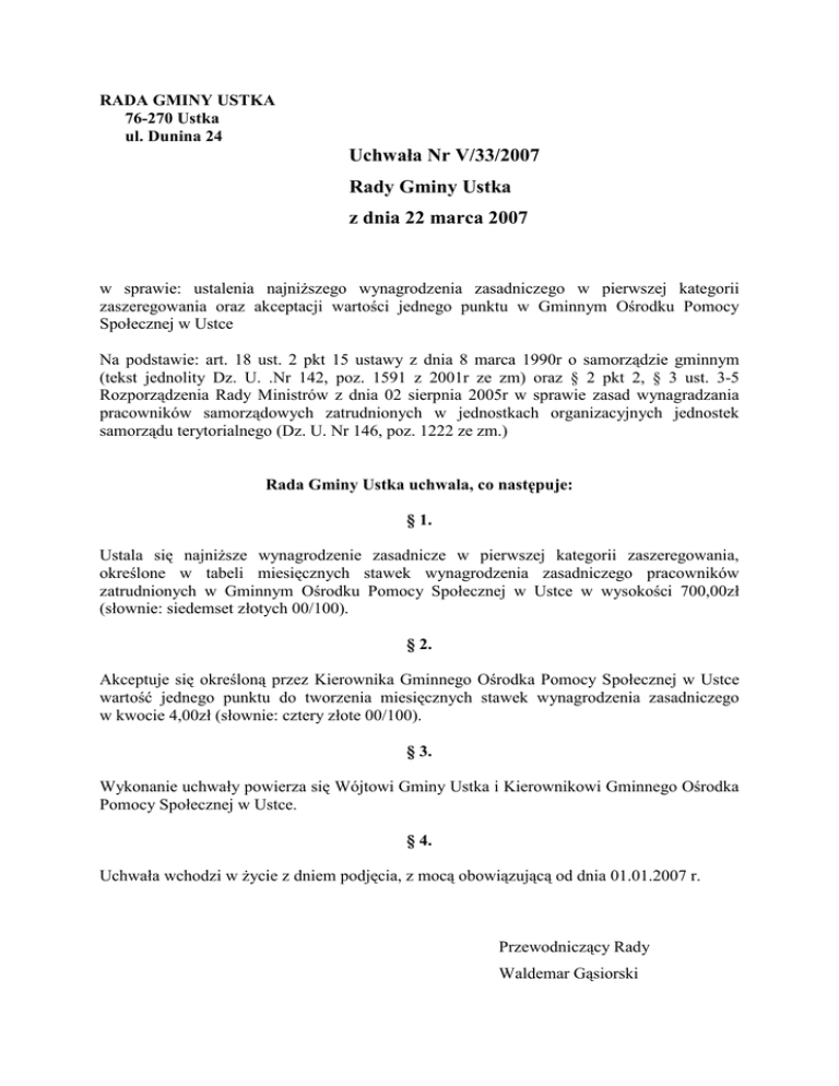 RADA GMINY USTKA 76-270 Ustka ul. Dunina 24 Uchwała Nr V/33/2007 Rady Gminy Ustka z dnia 22 marca 2007 w sprawie: ustalenia najniŜszego wynagrodzenia zasadniczego w pierwszej kategorii zaszeregowania oraz akceptacji wartości jednego punktu w Gminnym Ośrodku Pomocy Społecznej w Ustce Na podstawie: art. 18 ust. 2 pkt 15 ustawy z dnia 8 marca 1990r o samorządzie gminnym (tekst jednolity Dz. U. .Nr 142, poz. 1591 z 2001r ze zm) oraz § 2 pkt 2, § 3 ust. 3-5 Rozporządzenia Rady Ministrów z dnia 02 sierpnia 2005r w sprawie zasad wynagradzania pracowników samorządowych zatrudnionych w jednostkach organizacyjnych jednostek samorządu terytorialnego (Dz. U. Nr 146, poz. 1222 ze zm.) Rada Gminy Ustka uchwala, co następuje: § 1. Ustala się najniŜsze wynagrodzenie zasadnicze w pierwszej kategorii zaszeregowania, określone w tabeli miesięcznych stawek wynagrodzenia zasadniczego pracowników zatrudnionych w Gminnym Ośrodku Pomocy Społecznej w Ustce w wysokości 700,00zł (słownie: siedemset złotych 00/100). § 2. Akceptuje się określoną przez Kierownika Gminnego Ośrodka Pomocy Społecznej w Ustce wartość jednego punktu do tworzenia miesięcznych stawek wynagrodzenia zasadniczego w kwocie 4,00zł (słownie: cztery złote 00/100). § 3. Wykonanie uchwały powierza się Wójtowi Gminy Ustka i Kierownikowi Gminnego Ośrodka Pomocy Społecznej w Ustce. § 4. Uchwała wchodzi w Ŝycie z dniem podjęcia, z mocą obowiązującą od dnia 01.01.2007 r. Przewodniczący Rady Waldemar Gąsiorski