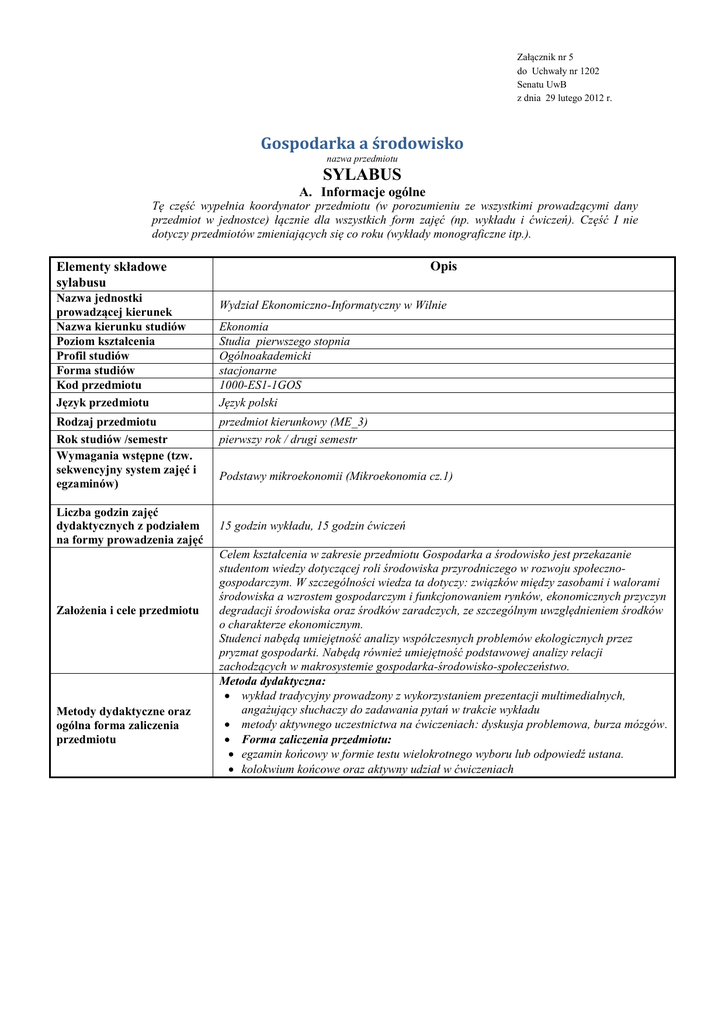 Gospodarka a środowisko SYLABUS