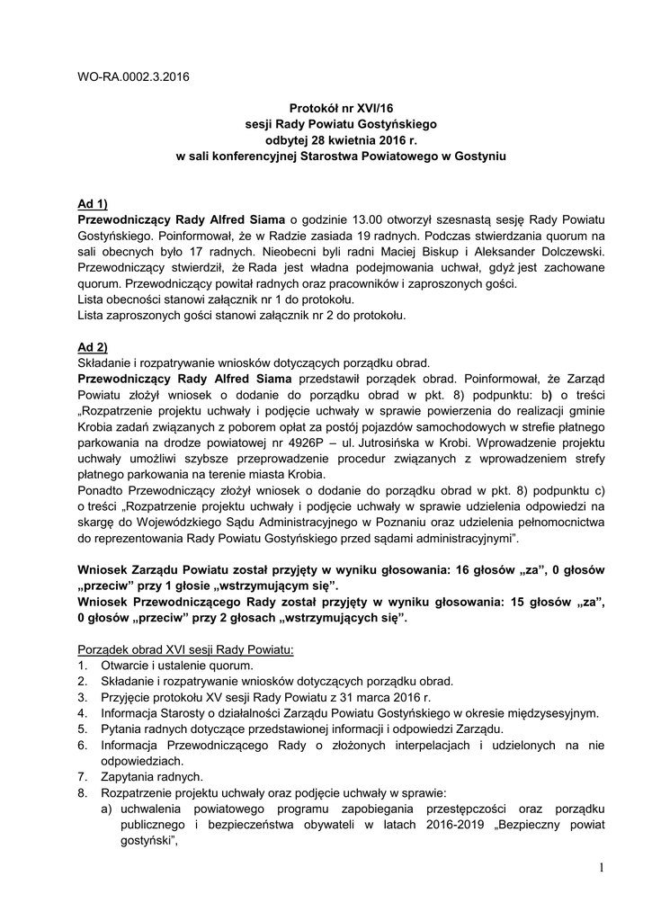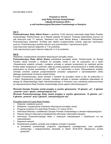 WO-RA.0002.3.2016 Protokół nr XVI/16 sesji Rady Powiatu Gostyńskiego odbytej 28 kwietnia 2016 r. w sali konferencyjnej Starostwa Powiatowego w Gostyniu Ad 1) Przewodniczący Rady Alfred Siama o godzinie 13.00 otworzył szesnastą sesję Rady Powiatu Gostyńskiego. Poinformował, że w Radzie zasiada 19 radnych. Podczas stwierdzania quorum na sali obecnych było 17 radnych. Nieobecni byli radni Maciej Biskup i Aleksander Dolczewski. Przewodniczący stwierdził, że Rada jest władna podejmowania uchwał, gdyż jest zachowane quorum. Przewodniczący powitał radnych oraz pracowników i zaproszonych gości. Lista obecności stanowi załącznik nr 1 do protokołu. Lista zaproszonych gości stanowi załącznik nr 2 do protokołu. Ad 2) Składanie i rozpatrywanie wniosków dotyczących porządku obrad. Przewodniczący Rady Alfred Siama przedstawił porządek obrad. Poinformował, że Zarząd Powiatu złożył wniosek o dodanie do porządku obrad w pkt. 8) podpunktu: b) o treści „Rozpatrzenie projektu uchwały i podjęcie uchwały w sprawie powierzenia do realizacji gminie Krobia zadań związanych z poborem opłat za postój pojazdów samochodowych w strefie płatnego parkowania na drodze powiatowej nr 4926P – ul. Jutrosińska w Krobi. Wprowadzenie projektu uchwały umożliwi szybsze przeprowadzenie procedur związanych z wprowadzeniem strefy płatnego parkowania na terenie miasta Krobia. Ponadto Przewodniczący złożył wniosek o dodanie do porządku obrad w pkt. 8) podpunktu c) o treści „Rozpatrzenie projektu uchwały i podjęcie uchwały w sprawie udzielenia odpowiedzi na skargę do Wojewódzkiego Sądu Administracyjnego w Poznaniu oraz udzielenia pełnomocnictwa do reprezentowania Rady Powiatu Gostyńskiego przed sądami administracyjnymi”. Wniosek Zarządu Powiatu został przyjęty w wyniku głosowania: 16 głosów „za”, 0 głosów „przeciw” przy 1 głosie „wstrzymującym się”. Wniosek Przewodniczącego Rady został przyjęty w wyniku głosowania: 15 głosów „za”, 0 głosów „przeciw” przy 2 głosach „wstrzymujących się”. Porządek obrad XVI sesji Rady Powiatu: 1. Otwarcie i ustalenie quorum. 2. Składanie i rozpatrywanie wniosków dotyczących porządku obrad. 3. Przyjęcie protokołu XV sesji Rady Powiatu z 31 marca 2016 r. 4. Informacja Starosty o działalności Zarządu Powiatu Gostyńskiego w okresie międzysesyjnym. 5. Pytania radnych dotyczące przedstawionej informacji i odpowiedzi Zarządu. 6. Informacja Przewodniczącego Rady o złożonych interpelacjach i udzielonych na nie odpowiedziach. 7. Zapytania radnych. 8. Rozpatrzenie projektu uchwały oraz podjęcie uchwały w sprawie: a) uchwalenia powiatowego programu zapobiegania przestępczości oraz porządku publicznego i bezpieczeństwa obywateli w latach 2016-2019 „Bezpieczny powiat gostyński”, 1 9) 10) 11) 12) 13) b) powierzenia do realizacji gminie Krobia zadań związanych z poborem opłat za postój pojazdów samochodowych w strefie płatnego parkowania na drodze powiatowej nr 4926P – ul. Jutrosińska w Krobi, c) udzielenia odpowiedzi na skargę do Wojewódzkiego Sądu Administracyjnego w Poznaniu oraz udzielenia pełnomocnictwa do reprezentowania Rady Powiatu Gostyńskiego przed sądami administracyjnymi. Informacja z działalności Wojewódzkiego Inspektoratu Ochrony Roślin i Nasiennictwa w Poznaniu na terenie powiatu gostyńskiego w 2015 r. Odpowiedzi na zapytania. Wnioski i oświadczenia radnych. Wolne głosy. Zakończenie. Ad 3) Przyjęcie protokołu Rady Powiatu z 31 marca 2016 r. Przewodniczący Rady Alfred Siama poinformował, że każdy z radnych otrzymał drogą elektroniczną protokół XV sesji z dnia 31 marca br. Protokół XV sesji Rady Powiatu został przyjęty w wyniku głosowania: 17 głosów „za”. Ad 4) Przewodniczący Rady Alfred Siama poinformował, że w związku z wprowadzeniem punktów do porządku obrad w przerwie zbierze się Komisja Samorządowo-Organizacyjna i Porządku Publicznego celem zaopiniowania tych projektów uchwał. Przewodniczący Alfred Siama poinformował, że informacje z posiedzenia Zarządu z 31 marca, 14 i 21 kwietnia br. zostały przekazane radnym drogą elektroniczną. Następnie Starosta przedstawił informację w formie prezentacji multimedialnej. Wydruk prezentacji stanowi załącznik nr 3 do protokołu. Starosta Robert Marcinkowski poinformował, że Wojewoda Wielkopolski opublikował listę szkół, którym zostanie udzielone wsparcie finansowe na realizację Narodowego Programu Rozwoju Czytelnictwa. Zespół Szkół Specjalnych w Brzeziu, Zespół Szkół Ogólnokształcących w Gostyniu oraz Zespół Szkół Rolniczych w Grabonogu otrzymają łącznie 28 tys. złotych dotacji na zakup nowości wydawniczych do bibliotek szkolnych. Ta kwota zależna jest od liczby uczniów, stąd Zespół Szkół Specjalnych w Brzeziu otrzyma 4 tys. zł, a Zespół Szkół Ogólnokształcących w Gostyniu i Zespół Szkół Rolniczych w Grabonogu po 12 tys. zł. Dodatkowo powiat zaangażuje w zadanie środki własne w wysokości 7 tys. zł. Częścią programu są działania promujące czytelnictwo wśród dzieci i młodzieży oraz zwiększające zakres współpracy bibliotek ze środowiskiem lokalnym. Szkoły zaplanowały różnorodne konkursy czytelnicze, imprezy, pogadanki i akcje, przy współuczestnictwie rodziców, stowarzyszeń, instytucji kultury, np. w Zespole Szkół Specjalnych w Brzeziu w ramach radiowęzła szkolnego prowadzona będzie audycja radiowa „Książki tygodnia”. Na terenie powiatu gostyńskiego przeprowadzane są sukcesywnie remonty dróg różnymi technologiami – masą na zimno, emulsją, grysami, a także masą na gorąco. W tym roku postanowiono pójść w nieco innym kierunku i zamiast łatać poszczególne dziury w najbardziej newralgicznych fragmentach przeprowadzono kompleksową odnowę nawierzchni, tak stało się na fragmencie ulicy Starogostyńskiej w Gostyniu, gdzie zostało przebudowane skrzyżow