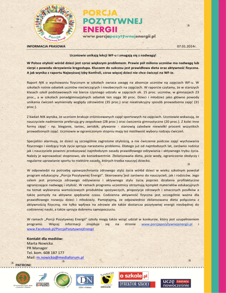 07.01.2014r. INFORMACJA PRASOWA Uczniowie unikają lekcji WF-u i zmagają się z nadwagą! W Polsce otyłość wśród dzieci jest coraz większym problemem. Prawie pół miliona uczniów ma nadwagę lub cierpi z powodu skrzywienia kręgosłupa. Kluczem do sukcesu jest prawidłowa dieta oraz aktywność fizyczna. A jak wynika z raportu Najwyższej Izby Kontroli, coraz więcej dzieci nie chce ćwiczyć na WF-ie. Raport NIK o wychowaniu fizycznym w szkołach zwraca uwagę na absencje uczniów na zajęciach WF-u. W szkołach rośnie odsetek uczniów niećwiczących i nieobecnych na zajęciach. W raporcie czytamy, że w starszych klasach szkół podstawowych nie bierze czynnego udziału w zajęciach ok. 15 proc. uczniów, w gimnazjach 23 proc., a w szkołach ponadgimnazjalnych odsetek ten sięga 30 proc. Dzieci i młodzież jako główne powody unikania ćwiczeń wymieniały względy zdrowotne (35 proc.) oraz nieatrakcyjny sposób prowadzenia zajęć (31 proc.). Z badań NIK wynika, że uczniom brakuje zróżnicowanych zajęć sportowych na zajęciach. Uczniowie wskazują, że nauczyciele nadmiernie preferują gry zespołowe (28 proc.) oraz ćwiczenia gimnastyczne (20 proc.). Z kolei inne formy zajęć - np. bieganie, taniec, aerobik, pływanie - stanowią zaledwie niewielki procent wszystkich prowadzonych zajęć. Uczniowie w ograniczonym stopniu mają też możliwość wyboru rodzaju ćwiczeń. Specjaliści alarmują, że dzieci są szczególnie zagrożone otyłością, a nie ćwiczenie podczas zajęć wychowania fizycznego i siedzący tryb życia sprzyja narastaniu problemu. Dlatego już od najmłodszych lat, zarówno rodzice jak i nauczyciele powinni przekazywać najmłodszym zasady prawidłowego odżywiania i aktywnego trybu życia. Należy je wprowadzać stopniowo, ale konsekwentnie. Zbilansowana dieta, picie wody, ograniczenie słodyczy i regularne uprawianie sportu to niektóre zasady, których trzeba nauczyć dziecko. W odpowiedzi na potrzebę upowszechniania zdrowego stylu życia wśród dzieci w wieku szkolnym powstał program edukacyjny „Porcja Pozytywnej Energii”. Skierowany jest zarówno do nauczycieli, jak i rodziców. Jego celem jest promocja zdrowego odżywiania i aktywnego stylu życia poprzez działania profilaktyczne ograniczające nadwagę i otyłość. W ramach programu uczestnicy otrzymają komplet materiałów edukacyjnych na temat wybierania wartościowych produktów spożywczych, propozycje zdrowych i smacznych posiłków a także pomysły na aktywne spędzanie czasu. Codzienna aktywność fizyczna jest szczególnie ważna dla prawidłowego rozwoju dzieci i młodzieży. Pamiętajmy, że odpowiednio zbilansowana dieta połączona z aktywnością fizyczną, nie tylko wpływa na zdrowie ale także dostarcza pozytywnej energii niezbędnej do codziennej nauki, a także sprzyja dobremu samopoczuciu. W ramach „Porcji Pozytywnej Energii” szkoły mogą także wziąć udział w konkursie, który jest uzupełnieniem www.porcjapozytywnejenergii.pl i programu. Więcej informacji znajduje się na stronie www.Facebook.pl/PorcjaPozytywnejEnergii Kontakt dla mediów: Marta Nowicka PR Manager Tel. kom. 608 187 177 Mail: [email protected]