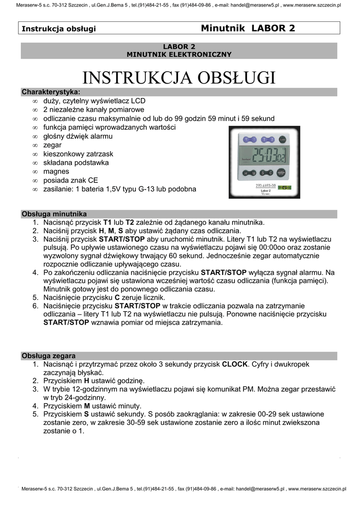 Meraserw-5 s.c. 70-312 Szczecin , ul.Gen.J.Bema 5 , tel.(91)484-21-55 , fax (91)484-09-86 , e-mail: [email protected] , www.meraserw.szczecin.pl Instrukcja obsługi Minutnik LABOR 2 LABOR 2 MINUTNIK ELEKTRONICZNY INSTRUKCJA OBSŁUGI Charakterystyka: • duży, czytelny wyświetlacz LCD • 2 niezależne kanały pomiarowe • odliczanie czasu maksymalnie od lub do 99 godzin 59 minut i 59 sekund • funkcja pamięci wprowadzanych wartości • głośny dźwięk alarmu • zegar • kieszonkowy zatrzask • składana podstawka • magnes • posiada znak CE • zasilanie: 1 bateria 1,5V typu G-13 lub podobna Obsługa minutnika 1. Nacisnąć przycisk T1 lub T2 zależnie od żądanego kanału minutnika. 2. Naciśnij przycisk H, M, S aby ustawić żądany czas odliczania. 3. Naciśnij przycisk START/STOP aby uruchomić minutnik. Litery T1 lub T2 na wyświetlaczu pulsują. Po upływie ustawionego czasu na wyświetlaczu pojawi się 00:00oo oraz zostanie wyzwolony sygnał dźwiękowy trwający 60 sekund. Jednocześnie zegar automatycznie rozpocznie odliczanie upływającego czasu. 4. Po zakończeniu odliczania naciśnięcie przycisku START/STOP wyłącza sygnał alarmu. Na wyświetlaczu pojawi się ustawiona wcześniej wartość czasu odliczania (funkcja pamięci). Minutnik gotowy jest do ponownego odliczania czasu. 5. Naciśnięcie przycisku C zeruje licznik. 6. Naciśnięcie przycisku START/STOP w trakcie odliczania pozwala na zatrzymanie odliczania – litery T1 lub T2 na wyświetlaczu nie pulsują. Ponowne naciśnięcie przycisku START/STOP wznawia pomiar od miejsca zatrzymania. Obsługa zegara 1. Nacisnąć i przytrzymać przez około 3 sekundy przycisk CLOCK. Cyfry i dwukropek zaczynają błyskać. 2. Przyciskiem H ustawić godzinę. 3. W trybie 12-godzinnym na wyświetlaczu pojawi się komunikat PM. Można zegar przestawić w tryb 24-godzinny. 4. Przyciskiem M ustawić minuty. 5. Przyciskiem S ustawić sekundy. S posób zaokrąglania: w zakresie 00-29 sek ustawione zostanie zero, w zakresie 30-59 sek ustawione zostanie zero a ilośc minut zwiekszona zostanie o 1. Meraserw-5 s.c. 70-312 Szczecin , ul.Gen.J.Bema 5 , tel.(91)484-21-55 , fax (91)484-09-86 , e-mail: [email protected] , www.meraserw.szczecin.pl Instrukcja obsługi Minutnik LABOR 2 6. Przyciskiem CLOCK potwierdzić wprowadzony czas. Błuska dwukropek, cyfry przestają błyskać. 7. Zegar pracuje niezależnie od minutników T1 i T2. W każdym momencie odliczania czasu na dowolnym kanale minutnika naciśnięcie przycisku CLOCK powoduje wyświetlenie aktualnej godziny. Powrót do odliczania poprzez naciśnięcie odpowiedniego przycisku T1 lub T2. Tryb wskazania godziny 1. Nacisnąć i przytrzymać przez 3 sekundy przycisk START/STOP w czasie wskazywania godziny. Powoduje to zmianę formatu wskazywania godziny. 2. Procedurę tą można powtórzyć aby przywrócić format 12-godzinny. Wymiana baterii Otworzyć zasobnik na baterię w tylnej ściance obudowy poprzez obrót pokrywki w kierunku oznaczonym strzałką. Wyjąć starą baterię. Włożyć nową baterię zwracając uwagę na polaryzację. (+ do góry). Zamknąć zasobnik na baterię. Minutnik resetuje się poprzez wyjęcie i ponowne włożenie baterii. Meraserw-5 s.c. 70-312 Szczecin , ul.Gen.J.Bema 5 , tel.(91)484-21-55 , fax (91)484-09-86 , e-mail: [email protected] , www.meraserw.szczecin.pl