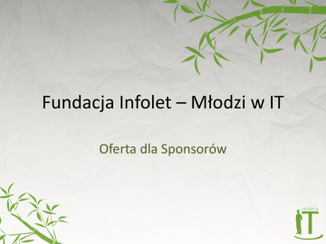 Fundacja Infolet – Młodzi w IT Oferta dla Sponsorów Kim jesteśmy Wspieramy młodych ludzi dla których IT to pasja i pomysł na rozwój zawodowy. Ułatwiamy start życiowy młodym w trudnej sytuacji materialnej lub ze słabym zdrowiem. Co robimy • Przyznajemy i wypłacamy stypendia naukowe i socjalne studentom kierunków informatycznych • Organizujemy, wspieramy i finansujemy kursy i szkolenia doszkalające dla studentów IT • Organizujemy staże w firmach IT W planach: • • Pożyczki dla absolwentów szkół wyższych z kierunków IT na założenie i rozwój przez nich działalności gospodarczej w branży IT Organizacja, wspieranie i finansowanie programów edukacyjnych, konkursów naukowych i technicznych z nagrodami finansowymi na rzecz uczestników konkursów Dlaczego warto nas wesprzeć? Nasza Fundacja jest doskonałym rozwiązaniem dla firm, które dopiero chcą zaangażować się w CSR. Jeśli Twoja firma posiada już politykę CSR – wsparcie Fundacji może być jej kolejnym elementem. Działania CSR pozytywnie wpływają na wizerunek pracodawcy wśród pracowników również tych potencjalnych. 72% respondentów badanych przez amerykański Deloitte, mając do wyboru pracę w dwóch firmach na tym samym stanowisku, wybrałoby tą angażującą się w działania związane z wolontariatem pracowniczym.* W 2014 r w Polsce brakuje 50 tysięcy pracowników IT. W przyszłych latach może być jeszcze trudniej o specjalistów.** * Dane z artykułu: http://csr.pl/article/735/ ** Dane z artykułu: http://www.bankier.pl/wiadomosc/W-Polsce-brakuje-do-pracy-50-tys-informatykow-3172716.html?comments=1#boxArticleComment Korzyści ze wsparcia Fundacji Od nas: • Twoje logo na stronie głównej Fundacji, • informacja o Twojej firmie na stronie Fundacji w zakładce „Przyjaciele Fundacji” a także w aktualnościach, • informacja o Twojej firmie na internetowych profilach Fundacji (Twitter i Facebook), • link do strony firmowej (i zakładki Kariera) podawany w informacjach zamieszczanych na różnych kanałach komunikacji ze studentami. Pośrednie: • • • • • • pozytywny wpływ na rozwój branży IT i rozwój przyszłych specjalistów, umocnienie wizerunku firmy co przyczyni się do jej kolejnych sukcesów, promocja i rozgłos medialny firmy, wzrost znajomości i marki usług/produktów firmy, zwiększenie lojalności konsumentów i interesariuszy, pozyskanie i utrzymanie najlepszych pracowników w firmie. Chcesz pomóc • Stypendia roczne Ze względów podatkowych wysokość jednego rocznego stypendium wynosi 3800 zł. Stypendium jest wypłacane na konto studenta przez 9 miesięcy w kwocie o wysokości 420 zł. Firma może przekazać do 10% swoich przychodów dla fundacji, a kwota ta stanowiła będzie koszt uzyskania przychodów. Dodatkowe formy wsparcia • Wsparcie merytoryczne jak również finansowe szkoleń organizowanych przez Fundację * Istnieje możliwość organizacji szkolenia dedykowanego specjalnie pod potrzeby Państwa firmy! • Organizacja praktyk i/lub staży *Najlepszym sposobem na zdobycie wiedzy jest branie udziału w realnych projektach. Pomożemy zorganizować praktyki a także zrekrutować najlepszych studentów. Jesteś zainteresowany wsparciem Fundacji? Masz nowy pomysł na współpracę? Skontaktuj się z nami. Jesteśmy otwarci na nowe pomysły i formy kooperacji! Kontakt Fundacja Infolet – Młodzi w IT Ul. Miłkowskiego 3/302 30-349 Kraków + 48 12 385 40 00 [email protected] www.mlodziwit.org