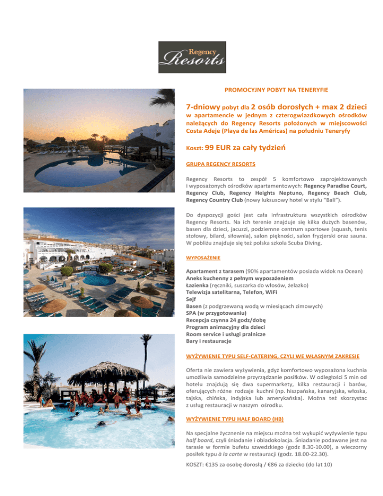PROMOCYJNY POBYT NA TENERYFIE 7-dniowy pobyt dla 2 osób dorosłych + max 2 dzieci w apartamencie w jednym z czterogwiazdkowych ośrodków należących do Regency Resorts położonych w miejscowości Costa Adeje (Playa de las Américas) na południu Teneryfy Koszt: 99 EUR za cały tydzień GRUPA REGENCY RESORTS Regency Resorts to zespół 5 komfortowo zaprojektowanych i wyposażonych ośrodków apartamentowych: Regency Paradise Court, Regency Club, Regency Heights Neptuno, Regency Beach Club, Regency Country Club (nowy luksusowy hotel w stylu “Bali”). Do dyspozycji gości jest cała infrastruktura wszystkich ośrodków Regency Resorts. Na ich terenie znajduje się kilka dużych basenów, basen dla dzieci, jacuzzi, podziemne centrum sportowe (squash, tenis stołowy, bilard, siłownia), salon piękności, salon fryzjerski oraz sauna. W pobliżu znajduje się też polska szkola Scuba Diving. WYPOSAŻENIE Apartament z tarasem (90% apartamentów posiada widok na Ocean) Aneks kuchenny z pełnym wyposażeniem Łazienka (ręczniki, suszarka do włosów, żelazko) Telewizja satelitarna, Telefon, WiFi Sejf Basen (z podgrzewaną wodą w miesiącach zimowych) SPA (w przygotowaniu) Recepcja czynna 24 godz/dobę Program animacyjny dla dzieci Room service i usługi pralnicze Bary i restauracje WYŻYWIENIE TYPU SELF-CATERING, CZYLI WE WŁASNYM ZAKRESIE Oferta nie zawiera wyżywienia, gdyż komfortowo wyposażona kuchnia umożliwia samodzielne przyrządzanie posiłków. W odległości 5 min od hotelu znajdują się dwa supermarkety, kilka restauracji i barów, oferujących różne rodzaje kuchni (np. hiszpańska, kanaryjska, włoska, tajska, chińska, indyjska lub amerykańska). Można też skorzystac z usług restauracji w naszym ośrodku. WYŻYWIENIE TYPU HALF BOARD (HB) Na specjalne życznenie na miejscu można też wykupić wyżywienie typu half board, czyli śniadanie i obiadokolacja. Śniadanie podawane jest na tarasie w formie bufetu szwedzkiego (godz 8.30-10.00), a wieczorny posiłek typu à la carte w restauracji (godz. 18.00-22.30). KOSZT: €135 za osobę dorosłą / €86 za dziecko (do lat 10) BILETY LOTNICZE Dojazd we własnym zakresie. Pomagamy w rezerwacji biletów lotniczych. Oto przewoźnicy oferujący przeloty na Teneryfę: www.airberlin.com, www.skyeurope.com, www.momondo.com, www.condor.com, www.spanair.com, www.TUI.pl, www.ryanair.com Hotel oddalony jest o 20 km od lotniska Tenerife Reina Sofia-dojazd do hotelu minibusem lub taksówką (koszt ok. €25 w jedną stronę). POLSKI REZYDENT Po przyjeżdzie w recepcji będzie na Państwa oczekiwał polski rezydent. Pomoże Wam w zakwaterowaniu i udzieli informacji o tym, co warto zobaczyć na wyspie. Podczas jednego przedpołudnia rezydent pokaże Państwu nasze ośrodki i przedstawi korzyści z przynależności do naszego ekskluzywnego klubu wakacyjnego, z możliwością zakupu własnego apartamentu na zasadzie timeshare. Będą Państwo mogli zapoznać się z nowym ośrodkiem, Regency Country Club, wybudowanym w stylu “Bali”, który znajduje się w miejscowości Chayofa. Przy zakwaterowaniu zostaną Państwo poproszeni o zwrotną kaucje w wysokości €300 płatną gotówką lub kartą kredytowa (na recepcji podają Państwo tylko numer karty a suma nie zostaje pobrana). SPORT I ROZRYWKA (uczestnictwo BEZPŁATNE) wodne polo, bule, duże szachy, bilard, rzutki, wodne gry, stretching, joga, wodny aerobic, masaże, a także muzyka na żywo każdego wieczoru, pokazy (papugi, węże, tańce-flamenco, czarodzieje, klauni, akrobaci itd.) WYCIECZKA PO TENERYFIE Hotel organizuje całodzienną wycieczkę dookoła wyspy (godz. 9-18), ze zwiedzaniem ciekawych miejsc na Teneryfie (czarne plaże, wygasły wulkan, miasto zatopione lawą, smocze drzewo, wyrób pitnej wody, przejazd na wielbłądach). W cenę wycieczki wliczony jest obiad i degustacja likierów. KOSZT: €55 za osobę dorosłą / €35 za dziecko (do lat 12) WARUNKI OFERTY 1. 2. 3. 4. 5. Promocyjny pobyt obejmuje 7 nocy i musi być zarezerwowany z co najmniej 2-tyg wyprzedzeniem. Cena nie zawiera kosztów przelotu i wyżywienia. Oferta skierowana jest do rodzin z dziećmi lub małżeństw/par w wieku od 30 lat. Osoby zakwalifikowane zobowiązane są do uczestnictwa w jednym promocyjnym spotkaniu. Oferta ważna jest do końca 2009 roku. JEŚLI MAJĄ PAŃSTWO PYTANIA PROSIMY O KONTAKT! Ewa Bakowicz: CEE Ambassador Program, REGENCY RESORTS, 2 Cataluña, Torviscas Alto, 38660 Costa Adeje, Tenerife, Spain Kom: +351 910 970 196, Skype: tm_ewa, Email: [email protected] www.regencyresorts.com