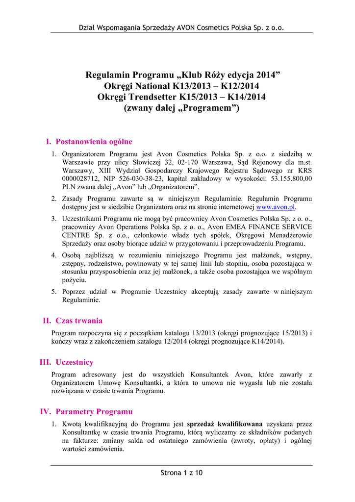 Dział Wspomagania Sprzedaży AVON Cosmetics Polska Sp. z o.o. Regulamin Programu „Klub Róży edycja 2014” Okręgi National K13/2013 – K12/2014 Okręgi Trendsetter K15/2013 – K14/2014 (zwany dalej „Programem”) I. Postanowienia ogólne 1. Organizatorem Programu jest Avon Cosmetics Polska Sp. z o.o. z siedzibą w Warszawie przy ulicy Słowiczej 32, 02-170 Warszawa, Sąd Rejonowy dla m.st. Warszawy, XIII Wydział Gospodarczy Krajowego Rejestru Sądowego nr KRS 0000028712, NIP 526-030-38-23, kapitał zakładowy w wysokości: 53.155.800,00 PLN zwana dalej „Avon” lub „Organizatorem”. 2. Zasady Programu zawarte są w niniejszym Regulaminie. Regulamin Programu dostępny jest w siedzibie Organizatora oraz na stronie internetowej www.avon.pl. 3. Uczestnikami Programu nie mogą być pracownicy Avon Cosmetics Polska Sp. z o. o., pracownicy Avon Operations Polska Sp. z o. o., Avon EMEA FINANCE SERVICE CENTRE Sp. z o.o., członkowie władz tych spółek, Okręgowi Menadżerowie Sprzedaży oraz osoby biorące udział w przygotowaniu i przeprowadzeniu Programu. 4. Osobą najbliższą w rozumieniu niniejszego Programu jest małżonek, wstępny, zstępny, rodzeństwo, powinowaty w tej samej linii lub stopniu, osoba pozostająca w stosunku przysposobienia oraz jej małżonek, a także osoba pozostająca we wspólnym pożyciu. 5. Poprzez udział w Programie Uczestnicy akceptują zasady zawarte w niniejszym Regulaminie. II. Czas trwania Program rozpoczyna się z początkiem katalogu 13/2013 (okręgi prognozujące 15/2013) i kończy wraz z zakończeniem katalogu 12/2014 (okręgi prognozujące K14/2014). III. Uczestnicy Program adresowany jest do wszystkich Konsultantek Avon, które zawarły z Organizatorem Umowę Konsultantki, a która to umowa nie wygasła lub nie została rozwiązana w czasie trwania Programu. IV. Parametry Programu 1. Kwotą kwalifikacyjną do Programu jest sprzedaż kwalifikowana uzyskana przez Konsultantkę w czasie trwania Programu, którą wyliczamy ze składników podanych na fakturze: zmiany salda od ostatniego zamówienia (zwroty, opłaty) i ogólnej wartości zamówienia. Strona 1 z 10 Dział Wspomagania Sprzedaży AVON Cosmetics Polska Sp. z o.o. a. Sprzedaż kwalifikowana - jest to sprzedaż liczona jak podstawa opustu Konsultantki, ale pomniejszona o wartość zwróconych przez Konsultantkę produktów. b. Podstawa opustu - wartość zamówionych produktów kosmetycznych i niekosmetycznych zamówionych w danym katalogu po cenach katalogowych z uwzględnieniem dostarczonych produktów z oferty netto, materiałów pomocnych w sprzedaży, artykułów z logo, produktów zamówionych a niedostarczonych z powodu braku w magazynie oraz produktów z Różową Wstążką i Avon Kontra Przemoc. Do bazy opustu nie wliczają się: opłaty za szkolenia, opłata administracyjna, braki dosłane z poprzednich zamówień, opłaty transportowe, Koszt Realizacji Małego Zamówienia (Konsultantkom, które złożą pierwsze zamówienie w katalogu na mniej niż 150 zł zostanie doliczony Koszt Realizacji Małego Zamówienia w wysokości 10 zł), nagrody z Programów dla Nowej Konsultantki i Klubu Róży oraz produkty z komunikatem „Produkcja zakończona, prosimy nie zamawiać”. Informacja o zakończeniu produkcji danego produktu zawarta jest w strefie Konsultantki w czasie składania zamówienia w części informującej o zasadach działania świateł (dostępności produktów). 2. Konsultantka zostaje zakwalifikowana do Programu Klub Róży edycja 2014 (Poziom 1 – Bursztynowy), kiedy łączna sprzedaż kwalifikowana w czasie trwania Programu przekroczy 11 000 zł . 3. Konsultantka osiąga kolejne poziomy w Programie Klub Róży edycja 2014 opisane poniżej, kiedy suma wartości produktów zakupionych w czasie trwania Programu od Avon odpowiada kwotom wskazanym przy danym poziomie. Poziom 1 Bursztynowy 11 000 zł Poziom 2 Rubinowy 20 000 zł Poziom 3 Szmaragdowy 50 000 zł Poziom 4 Diamentowy 150 000 zł 4. Awans na każdy z poziomów Programu następuje po zakończeniu Katalogu, w którym Konsultantka osiągnęła łączną sprzedaż wymaganą na danym poziomie. Pierwsze awanse w Programie nastąpią po zakończeniu K13/2013 (TS K15/2013). 5. Ostatnim zamówieniem Konsultantki, które wlicza się do kwoty kwalifikacyjnej w Programie jest zamówienie złożone w ostatnim dniu katalogu 12/2014 (dla okręgów prognozujących jest to zamówienie złożone w ostatnim dniu katalogu 14/2014). Zamówienia zrealizowane po tym terminie nie będą wliczały się do kwoty kwalifikacyjnej Programu Klub Róży edycja 2014. V. Przywileje 1. Poszczególnym poziomom odpowiadają następujące przywileje: Nazwy i kwoty kwalifikacyjne Poziom Przywileje - gwarantowany 30% stały opust na zakup produktów kosmetycznych AVON Strona 2 z 10 Dział Wspomagania Sprzedaży AVON Cosmetics Polska Sp. z o.o. Bursztynowy - gwarantowany 30% opust na zakup próbek 11 000 PLN - oferta specjalna na zakup pakietu kolejnych katalogów („+1”), pakiet zawiera 15 sztuk katalogów; cena pakietu 9 zł brutto; możliwość zakupienia 1 pakietu w każdym katalogu trwania Programu; Okręgi National LN 96503 ; Okręgi Prognozujące LN 95232 - wyższy limit kredytowy (9 000 zł brutto na każdy katalog; 4 500 zł brutto na pojedyncze zamówienie) - katalog otrzymywany z wyprzedzeniem 2 Katalogów („+2”) – tylko dla okręgów National - ulgowa infolinia - bransoletka z zawieszką Apart, w specjalnej cenie 1 zł - gwarantowany 30% stały opust na zakup produktów kosmetycznych AVON - gwarantowany 30% opust na zakup próbek Poziom Rubinowy - oferta specjalna na zakup pakietu kolejnych katalogów („+1”), pakiet zawiera 25 sztuk katalogów; cena pakietu 15 zł brutto; możliwość zakupienia max. 2 pakietów w każdym katalogu trwania Programu; Okręgi National LN 96511; Okręgi Prognozujące LN 95240 20 000 PLN - wyższy limit kredytowy (10 400 zł brutto na każdy katalog; 5 200 zł brutto na pojedyncze zam