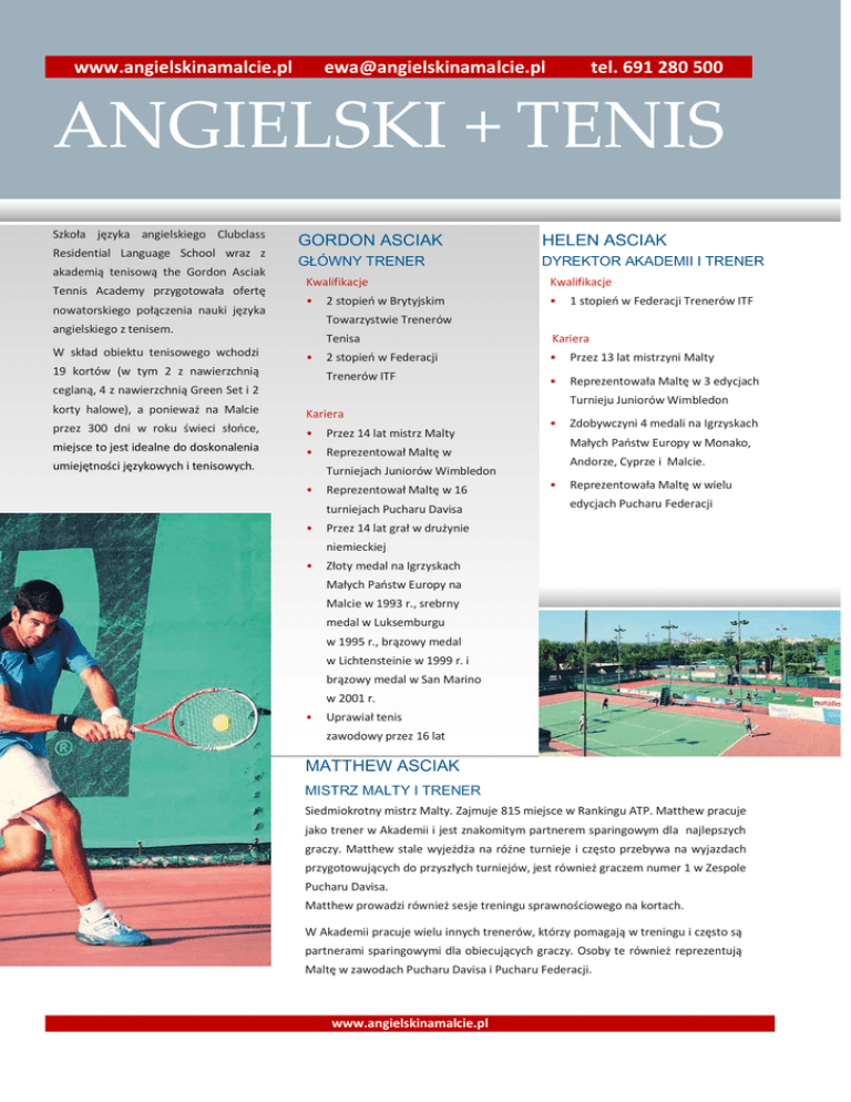 www.angielskinamalcie.pl [email protected] tel. 691 280 500 ANGIELSKI + TENIS Szkoła języka angielskiego Clubclass Residential Language School wraz z akademią tenisową the Gordon Asciak Tennis Academy przygotowała ofertę nowatorskiego połączenia nauki języka GORDON ASCIAK HELEN ASCIAK GŁÓWNY TRENER DYREKTOR AKADEMII I TRENER Kwalifikacje Kwalifikacje • • 1 stopień w Federacji Trenerów ITF Towarzystwie Trenerów angielskiego z tenisem. W skład obiektu tenisowego wchodzi 2 stopień w Brytyjskim • 19 kortów (w tym 2 z nawierzchnią Tenisa Kariera 2 stopień w Federacji • Przez 13 lat mistrzyni Malty Trenerów ITF • Reprezentowała Maltę w 3 edycjach ceglaną, 4 z nawierzchnią Green Set i 2 Turnieju Juniorów Wimbledon korty halowe), a ponieważ na Malcie Kariera przez 300 dni w roku świeci słońce, • Przez 14 lat mistrz Malty miejsce to jest idealne do doskonalenia • Reprezentował Maltę w umiejętności językowych i tenisowych. • Małych Państw Europy w Monako, Andorze, Cyprze i Malcie. Turniejach Juniorów Wimbledon • Reprezentował Maltę w 16 turniejach Pucharu Davisa • Zdobywczyni 4 medali na Igrzyskach • Reprezentowała Maltę w wielu edycjach Pucharu Federacji Przez 14 lat grał w drużynie niemieckiej • Złoty medal na Igrzyskach Małych Państw Europy na Malcie w 1993 r., srebrny medal w Luksemburgu w 1995 r., brązowy medal w Lichtensteinie w 1999 r. i brązowy medal w San Marino w 2001 r. • Uprawiał tenis zawodowy przez 16 lat MATTHEW ASCIAK MISTRZ MALTY I TRENER Siedmiokrotny mistrz Malty. Zajmuje 815 miejsce w Rankingu ATP. Matthew pracuje jako trener w Akademii i jest znakomitym partnerem sparingowym dla najlepszych graczy. Matthew stale wyjeżdża na różne turnieje i często przebywa na wyjazdach przygotowujących do przyszłych turniejów, jest również graczem numer 1 w Zespole Pucharu Davisa. Matthew prowadzi również sesje treningu sprawnościowego na kortach. W Akademii pracuje wielu innych trenerów, którzy pomagają w treningu i często są partnerami sparingowymi dla obiecujących graczy. Osoby te również reprezentują Maltę w zawodach Pucharu Davisa i Pucharu Federacji. www.angielskinamalcie.pl OBÓZ TENISOWY Obozy tenisowe są dostępne przez cały rok i mogą zostać zarezerwowane na co najmniej jeden tydzień. Programy dostosowane są do poziomu uczestnika i można je zamawiać indywidualnie lub w zorganizowanych grupach. Na początku obozu jeden z trenerów przeprowadza szczegółową analizę dotychczasowego poziomu gracza i ustala indywidualne cele uczestnika. Na podstawie szczegółowej analizy tworzony jest następnie program treningu na czas obozu tenisowego. Program tenisowy obejmuje 4 godziny treningu tenisowego i zajęć sprawnościowych, codziennie od poniedziałku do piątku. Trenerzy zapewniają profesjonalne podejście do programu, które jednak nie jest pozbawione elementów zabawy – przewidziane są różne ćwiczenia, gry, opracowywanie taktyki oraz rozgrywanie meczów z przeciwnikami na podobnym poziomie. Uczestnicy obozu tenisowego otrzymują wskazówki i reguły dotyczące zachowania na korcie i poza kortem, co pomoże im stać się dobrymi sportowcami. Istotnym aspektem życia sportowca jest również właściwe odżywianie, dlatego uczestnicy będą mieli możliwość omówienia kwestii żywieniowych z dostępnym na miejscu dietetykiem. Po zakończeniu obozu tenisowego uczestnicy dostaną koszulkę Wilsona i czapkę tenisową. Otrzymają również szczegółowy raport wraz z uwagami trenera i zaleceniami dotyczącymi kluczowych aspektów do dalszego rozwoju. CENA Cena obejmuje: • 750,00 € za tydzień Trening indywidualny • 2 godziny treningu indywidualnego Trening w zorganizowanych obiektu tenisowego w obie 1 godzinę sparingu z graczem strony • grupach (rezerwowany Możliwość korzystania z maszyny do podawania piłek (poniedziałek – piątek) • Codzienny transport do dziennie (poniedziałek – piątek) Pucharu Davisa dziennie 550,00 € za tydzień • 1 godzinę treningu sprawnościowego • Analiza wideo dziennie (poniedziałek – piątek) • Użycie piłek tenisowych do wspólnie) ćwiczenia samych serwisów • Szczegółowy raport i certyfikat GRUPY Zorganizowane grupy liczące co najmniej 4 osoby mają do wyboru wiele opcji obozu tenisowego. Grupy mogą wziąć udział w obozie samodzielnie lub z własnym trenerem, a podczas pobytu istnieje możliwość zorganizowania turnieju. Na życzenie, dla poszczególnych grup może zostać opracowany specjalny program dostosowany do wymagań uczestników. OBOZY MOŻNA REZERWOWAĆ ODDZIELNIE LUB Z KURSEM JĘZYKA ANGIELSKIEGO W SZKOLE CLUBCLASS. CENY KURSU I ZAKWATEROWANIA ORAZ DALSZE INFORMACJE ZAWARTE SĄ NA STRONIE: www.angielskinamalcie.pl www.angielskinamalcie.pl