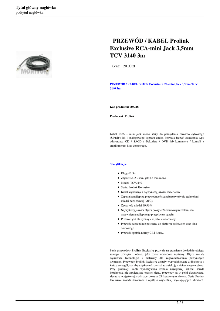 Tytuł główny nagłówka podtytuł nagłówka PRZEWÓD / KABEL Prolink Exclusive RCA-mini Jack 3,5mm TCV 3140 3m Cena: 20.00 zł PRZEWÓD / KABEL Prolink Exclusive RCA-mini Jack 3,5mm TCV 3140 3m Kod produktu: 003318 Producent: Prolink Kabel RCA - mini jack mono służy do przesyłania zarówno cyfrowego (S/PDiF) jak i analogowego sygnału audio. Pozwala łączyć urządzenia typu odtwarzacz CD / SACD / Dekodera / DVD lub komputera / konsoli z amplitunerem kina domowego. Specyfikacja: Długość: 3m Złącze: RCA - mini jak 3.5 mm mono Model: TCV3140 Seria: Prolink Exclusive Kabel wykonany z najwyższej jakości materiałów Zapewnia najlepszą przewodność sygnału przy użyciu technologii miedzi beztlenowej (OFC) Zawartość miedzi 99,96% Najwyższej jakości złącza pokryte 24-karatowym złotem, dla zapewnienia najlepszego przepływu sygnału Przewód jest elastyczny i w pełni ekranowany Przewód szczególnie polecany do platform cyfrowych oraz kina domowego. Przewód spełnia normy CE i RoHS. Seria przewodów Prolink Exclusive pozwala na przesłanie dokładnie takiego samego dźwięku i obrazu jaki został uprzednio zapisany. Użyte zostały najnowsze technologie i materiały dla zagwarantowania powyższych wymagań. Przewody Prolink Exclusive zostały wyprodukowane z dbałością o każdy szczegół, tak aby użytkownik czerpał satysfakcję z dokonanego wyboru. Przy produkcji kabli wykorzystana została najwyższej jakości miedź beztlenowa nie zawierająca cząstek tlenu, przewody są w pełni ekranowane, złącza o wyjątkowej stylistyce pokryto 24 karatowym złotem. Seria Prolink Exclusive została stworzona z myślą o najbardziej wymagających klientach. 1/2 Tytuł główny nagłówka podtytuł nagłówka Łączy w sobie doskonalą jakość przy stosunkowo niskiej cenie. Stosując przewody Prolink Exclusive masz pewność, że dokonałeś właściwego wyboru w celu osiągnięcia i zapewnienia maksymalnej jakości transmisji sygnału. Szczegóły Długość RCA (CINCH) Jack Rodzaje przyłączy 3m 1RCA mini jack 3,5mm RCA - Jack 2/2 Powered by TCPDF (www.tcpdf.org)