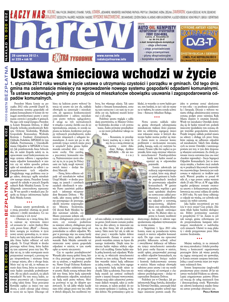 nakład 15 000 egz. ááááá gazeta B E Z P Ł AT N A nakład 15 000 egz. ááááá gazeta B E Z P Ł AT N A nakład 15 000 egz. reklama 26 czerwca 2012 r. nr 229 n rok VI www.narew.info [email protected] Ustawa śmieciowa wchodzi w życie 1. stycznia 2012 roku weszła w życie ustawa o utrzymaniu czystości i porządku w gminach. Od tego dnia gmina ma osiemnaście miesięcy na wprowadzenie nowego systemu gospodarki odpadami komunalnymi. Ta ustawa zobowiązuje gminy do przejęcia od mieszkańców obowiązku usuwania i zagospodarowania odpadów komunalnych. Prezydent Miasta Łomży na początku 2012 roku powołał Zespół ds. dostosowania systemu gospodarki odpadami komunalnymi w Łomży do wymagań znowelizowanej ustawy o utrzymaniu czystości i porządku w gminach. Na jego czele stanął Zastępca Prezydenta Łomży Beniamin Dobosz, w skład Zespołu wchodzą przedstawiciele Referatu Ochrony Środowiska, Wydziału Gospodarki Komunalnej, Wydziału Rozwoju i Funduszy Zewnętrznych, Oddziału Podatków, MPGKiM (w tym Zakładu Przetwarzania i Unieszkodliwiania Odpadów w MPGKiM w Łomży). Jak poinformowała Anna Sobocińska, do zadań Zespołu należy m. in. opracowanie zasad funkcjonowania nowego systemu odbioru i zagospodarowania odpadów komunalnych w mieście czy też wybór sposobu poboru opłat od mieszkańców za odbiór i zagospodarowanie tych odpadów. Uwzględniając wagę problemu oraz jego zakres, dotyczący ogółu mieszkańców naszego miasta, Prezydent Łomży zaprosił do udziału w pracach Zespołu radnych Rady Miejskiej Łomży. Ta wydelegowała czteroosobową reprezentację. W ten sposób o wynikach prac Zespołu na bieżąco informowana będzie Rada Miejska Łomży. l l l Zmiana ustawy spowodowała, że o swoją przyszłość obawiają się przedsiębiorcy i zwykli mieszkańcy. Co nowości zmienią w ich życiu? – Obawiam się o swoją firmę, która zajmuje się wywozem śmieci od szesnastu lat – mówi Andrzej Marczyk, prezes firmy „Błysk”. – Zmiany, które nastąpią po wcieleniu w życie nowej ustawy spowodują to, że mieszkańcy nie będą sami decydować o tym jaka firma będzie odbierać od nich odpady. To Urząd Miejski w drodze przetargu wyłoni firmę, która będzie się tym zajmować przez trzy lata. Wydaje mi się, że takie rozwiązanie może przypominać monopol, a przetarg wygra niesprawdzona i nieznana firma z innego miasta, albo z obcego kraju. Może stać się też tak, że wybrana zostanie duża firma, która na naszym terenie będzie zatrudniła podwykonawców. Ale na jakich zasadach, na jakich warunkach? Na tym stracą ludzie, zarówno pracownicy jak i korzystający z usług takiej firmy. Teraz przeciętny Kowalski zapłaci za śmieci trzy razy drożej, a jeżeli odczuje jakąś różnicę to raczej nie na lepsze. Dlaczego od- biera się ludziom prawo wyboru? Intencja tej ustawy nie jest zła, nakłada obowiązki na samorządy i mieszkańców, ale ogranicza konkurencyjność przedsiębiorstw i zabiera mieszkańcom prawo wyboru ugługodawcy. Z uwagi na tyle niewiadomych w związku z ustawą i krótki czas do jej wprowadzenia, uważam, że została napisana na kolanie, konkretnie pod grupy wybranych przedsiębiorstw, niekoniecznie związanych z usługami komunalnymi. A może jest po to aby powstało tysiące nowych miejsc pracy w urzędach? Jedna gmina będzie musiała zatrudnić dwie – trzy nowe osoby. Oni zarobią, a pracownicy komunalni stracą. Najśmieszniejsze może okazać się to, że za parę lat Polacy sami nie będą mogli wywozić swoich śmieci – dodaje Andrzej Marczyk. – Firmę, która odbierze odpady od mieszkańców wyłoni Urząd Miejski – w drodze przetargu, na jasnych i czytelnych zasadach określonych w ustawie Prawo zamówień publicznych – informuje wiceprezydent Beniamin Dobosz. – Warunki, jakie muszą spełnić firmy przystępujące do przetargu, określi stosowne rozporządzenie Ministra Środowiska. Od decyzji Rady Miejskiej będzie natomiast zależało, czy Miasto pozostanie jednym sektorem obsługiwanym przez jeden podmiot, czy zostanie podzielone na mniejsze sektory, obsługiwane przez inne, wyłonione w przetargu firmy odpowiedzialne za odbiór odpadów. Wygrać w przetargu więc ma szansę każdy przedsiębiorca, który spełni określone warunki. Rada Miejska zatwierdzi też ostatecznie nowy system gospodarki odpadami w mieście, w tym stawki opłat za wywóz nieczystości. Czy to uspokoi przedsiębiorców? Warunki jakie muszą spełnić firmy, które chcą przystąpić do przetargu nadal nie są ustalone, a wątpliwości przybywa. Nawet Urząd Ochrony Konkurencji jest przeciwko niektórym zapisom w ustawie. Kiedy zostaną wybrane dwie lub trzy firmy, które będą zajmowały się odbieraniem odpadów, mieszkańcy nie będą mieli prawa wyboru. Można porównać to np. do sklepów spożywczych. To tak jakby władze kazały nam robić zakupy przez trzy lata tylko w dwóch sklepach, bez możliwości wy- boru, bez własnego zdania. Tak samo będzie z firmami komunalnymi, zostaną nam narzucone i czy nam się to podoba czy nie, będziemi musieli korzystać z ich usług. Podobnie sprawa wygląda z zakładami przetwórstwa, to Minister Ochrony Środowiska decyduje o ich powstawaniu. Żaden prywatny przedsiębiorca nie może pobudować takiego zakładu. – Rozumiem, że przedsiębiorcy martwią się o swoje firmy, bo ja o swoją również się martwię – mówi Arkadiusz Kułaga, dyrektor MPGKiM. – Ale nie możemy od razu zakładać, że wszystko zmieni się na gorsze. Jeżeli miasto zostanie podzielone na dwa sektory, to śmieciami zajmą się dwie firmy, lub ich podwykonawcy. Także może być tak, że nikt nie straci pracy i wszystko będzie dobrze funkcjonowało. Zmiany w ustawie to przede wszystkim zmiany na lepsze dla naszego środowiska. Dzięki temu konieczna będzie większa selekcja odpadów i ich recykling. Gmina będzie miała pełną kontrolę nad odpadami. Wydaje mi się, że wła