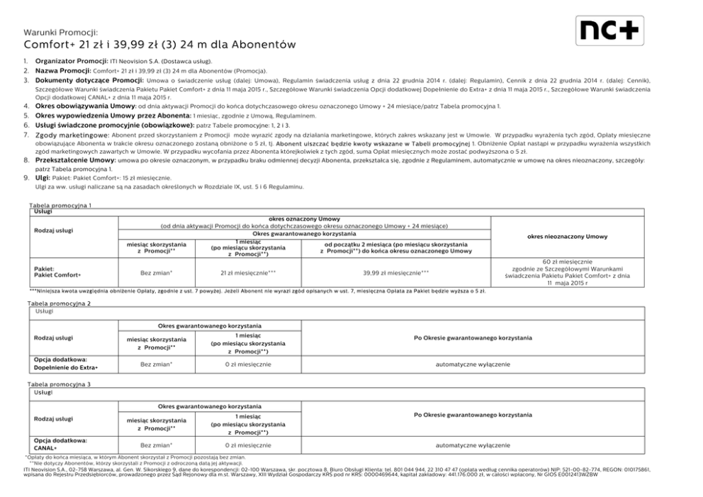 Warunki Promocji: Comfort+ 21 zł i 39,99 zł (3) 24 m dla Abonentów 1. Organizator Promocji: ITI Neovision S.A. (Dostawca usług). 2. Nazwa Promocji: Comfort+ 21 zł i 39,99 zł (3) 24 m dla Abonentów (Promocja). 3. Dokumenty dotyczące Promocji: Umowa o świadczenie usług (dalej: Umowa), Regulamin świadczenia usług z dnia 22 grudnia 2014 r. (dalej: Regulamin), Cennik z dnia 22 grudnia 2014 r. (dalej: Cennik), Szczegółowe Warunki świadczenia Pakietu Pakiet Comfort+ z dnia 11 maja 2015 r., Szczegółowe Warunki świadczenia Opcji dodatkowej Dopełnienie do Extra+ z dnia 11 maja 2015 r., Szczegółowe Warunki świadczenia Opcji dodatkowej CANAL+ z dnia 11 maja 2015 r. 4. 5. 6. 7. Okres obowiązywania Umowy: od dnia aktywacji Promocji do końca dotychczasowego okresu oznaczonego Umowy + 24 miesiące/patrz Tabela promocyjna 1. Okres wypowiedzenia Umowy przez Abonenta: 1 miesiąc, zgodnie z Umową, Regulaminem. Usługi świadczone promocyjnie (obowiązkowe): patrz Tabele promocyjne: 1, 2 i 3. Zgody marketingowe: Abonent przed skorzystaniem z Promocji może wyrazić zgody na działania marketingowe, których zakres wskazany jest w Umowie. W przypadku wyrażenia tych zgód, Opłaty miesięczne obowiązujące Abonenta w trakcie okresu oznaczonego zostaną obniżone o 5 zł, tj. Abonent uiszczać będzie kwoty wskazane w Tabeli promocyjnej 1. Obniżenie Opłat nastąpi w przypadku wyrażenia wszystkich zgód marketingowych zawartych w Umowie. W przypadku wycofania przez Abonenta którejkolwiek z tych zgód, suma Opłat miesięcznych może zostać podwyższona o 5 zł. 8. Przekształcenie Umowy: umowa po okresie oznaczonym, w przypadku braku odmiennej decyzji Abonenta, przekształca się, zgodnie z Regulaminem, automatycznie w umowę na okres nieoznaczony, szczegóły: patrz Tabela promocyjna 1. 9. Ulgi: Pakiet: Pakiet Comfort+: 15 zł miesięcznie. Ulgi za ww. usługi naliczane są na zasadach określonych w Rozdziale IX, ust. 5 i 6 Regulaminu. Tabela promocyjna 1 Usługi Rodzaj usługi Pakiet: Pakiet Comfort+ okres oznaczony Umowy (od dnia aktywacji Promocji do końca dotychczasowego okresu oznaczonego Umowy + 24 miesiące) Okres gwarantowanego korzystania 1 miesiąc miesiąc skorzystania od początku 2 miesiąca (po miesiącu skorzystania (po miesiącu skorzystania z Promocji** z Promocji**) do końca okresu oznaczonego Umowy z Promocji**) Bez zmian* 21 zł miesięcznie*** okres nieoznaczony Umowy 60 zł miesięcznie zgodnie ze Szczegółowymi Warunkami świadczenia Pakietu Pakiet Comfort+ z dnia 11 maja 2015 r 39,99 zł miesięcznie*** ***Niniejsza kwota uwzględnia obniżenie Opłaty, zgodnie z ust. 7 powyżej. Jeżeli Abonent nie wyrazi zgód opisanych w ust. 7, miesięczna Opłata za Pakiet będzie wyższa o 5 zł. Tabela promocyjna 2 Usługi Okres gwarantowanego korzystania Rodzaj usługi Opcja dodatkowa: Dopełnienie do Extra+ miesiąc skorzystania z Promocji** 1 miesiąc (po miesiącu skorzystania z Promocji**) Po Okresie gwarantowanego korzystania Bez zmian* 0 zł miesięcznie automatyczne wyłączenie Tabela promocyjna 3 Usługi Okres gwarantowanego korzystania Rodzaj usługi Opcja dodatkowa: CANAL+ 1 miesiąc (po miesiącu skorzystania z Promocji**) Po Okresie gwarantowanego korzystania miesiąc skorzystania z Promocji** Bez zmian* 0 zł miesięcznie automatyczne wyłączenie *Opłaty do końca miesiąca, w którym Abonent skorzystał z Promocji pozostają bez zmian. **Nie dotyczy Abonentów, którzy skorzystali z Promocji z odroczoną datą jej aktywacji. ITI Neovision S.A., 02-758 Warszawa, al. Gen. W. Sikorskiego 9, dane do korespondencji: 02-100 Warszawa, skr. pocztowa 8, Biuro Obsługi Klienta: tel. 801 044 944, 22 310 47 47 (opłata według cennika operatorów) NIP: 521-00-82-774, REGON: 010175861, wpisana do Rejestru Przedsiębiorców, prowadzonego przez Sąd Rejonowy dla m.st. Warszawy, XIII Wydział Gospodarczy KRS pod nr KRS: 0000469644, kapitał zakładowy: 441.176.000 zł, w całości wpłacony, Nr GIOŚ E0012413WZBW 10. Okres obowiązywania Promocji: od 7 marca 2016 r. do odwołania, z zachowaniem praw nabytych Abonentów. 11. Szczegółowa zawartość usług: w załączniku do niniejszej Promocji, na stronie internetowej Dostawcy usług oraz w Biurze Obsługi Klienta. 12. Zasady wyłączania usług: Pakiet: Pakiet Comfort+: brak możliwości wyłączenia poza przypadkami rozwiązania/wygaśnięcia Umowy, Opcje dodatkowe: Dopełnienie do Extra+, CANAL+: automatyczne wyłączenie z końcem Okresu gwarantowanego korzystania. 13. Uwagi: Z chwilą aktywacji niniejszej Promocji, Abonent traci prawo do korzystania z usług Dostawcy usług świadczonych dotychczas na rzecz Abonenta, w oparciu o Warunki Promocji właściwe dla usług, z których Abonent dotychczas korzystał. 14. Kwestie nieuregulowane: w kwestiach nieuregulowanych niniejszymi Warunkami Promocji zastosowanie będą miały postanowienia: Regulaminu, Umowy, Cennika, Szczegółowych Warunków świadczenia Pakietu Pakiet Comfort+ z dnia 11 maja 2015 r., Szczegółowych Warunków świadczenia Opcji dodatkowej Dopełnienie do Extra+ z dnia 11 maja 2015 r. Szczegółowych Warunków świadczenia Opcji dodatkowej CANAL+ z dnia 11 maja 2015 r. 15. W przypadku kolizji między postanowieniami zawartymi w dokumentach wymienionych w ust. 14 powyżej, a postanowieniami niniejszych Warunków Promocji, pierwszeństwo będą miały postanowienia niniejszych Warunków Promocji. Drogi Abonencie, Zwróć uwagę, że w skład Twojej oferty wchodzą również usługi, które świadczone są w Okresach gwarantowanego korzystania krótszych niż okres oznaczony Umowy. Pamiętaj, że przed upływem Okresów gwarantowanego korzystania musisz zdecydować czy chcesz z nich nadal korzystać. Jeżeli nie zdecydujesz się na ich wyłączenie Twoje miesięczne opłaty wzrosną. Dlatego też zapoznaj się dokładnie z powyższymi tabelami, abyś mógł świadomie decydować o kształcie i opłatach w Twojej ofercie. Życzymy miłego korz