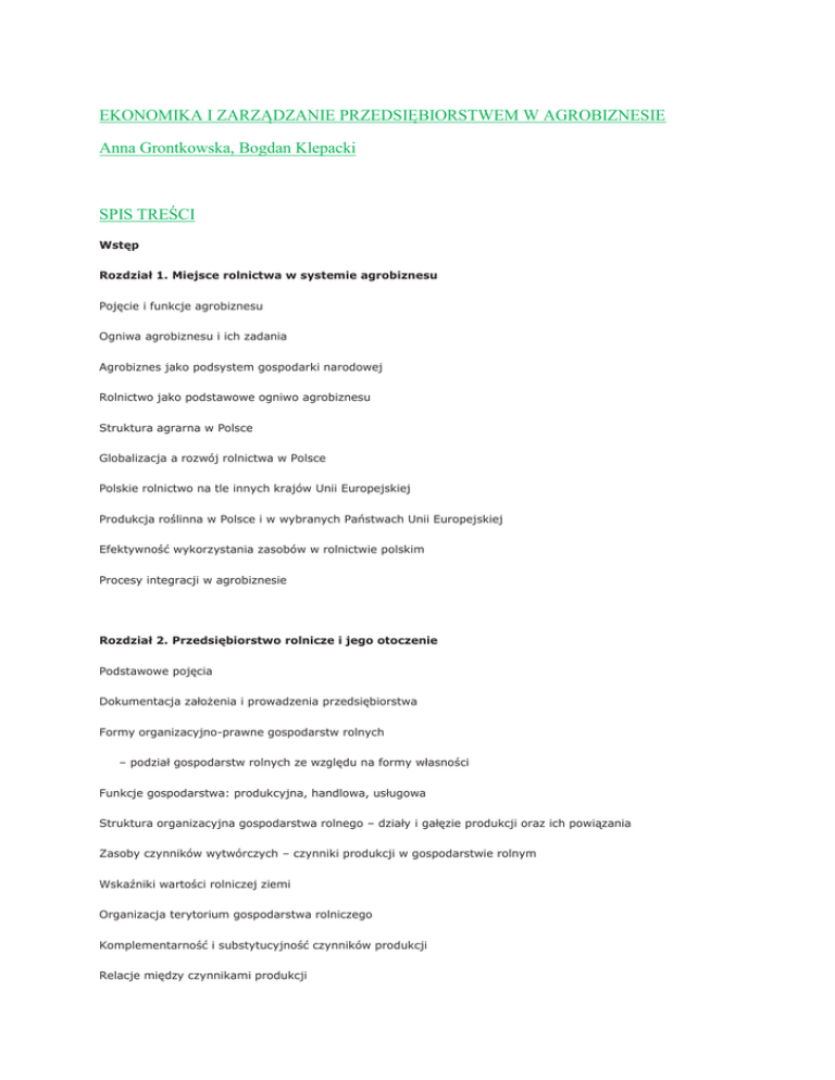 EKONOMIKA I ZARZĄDZANIE PRZEDSIĘBIORSTWEM W AGROBIZNESIE Anna Grontkowska, Bogdan Klepacki SPIS TREŚCI Wstęp Rozdział 1. Miejsce rolnictwa w systemie agrobiznesu Pojęcie i funkcje agrobiznesu Ogniwa agrobiznesu i ich zadania Agrobiznes jako podsystem gospodarki narodowej Rolnictwo jako podstawowe ogniwo agrobiznesu Struktura agrarna w Polsce Globalizacja a rozwój rolnictwa w Polsce Polskie rolnictwo na tle innych krajów Unii Europejskiej Produkcja roślinna w Polsce i w wybranych Państwach Unii Europejskiej Efektywność wykorzystania zasobów w rolnictwie polskim Procesy integracji w agrobiznesie Rozdział 2. Przedsiębiorstwo rolnicze i jego otoczenie Podstawowe pojęcia Dokumentacja założenia i prowadzenia przedsiębiorstwa Formy organizacyjno-prawne gospodarstw rolnych – podział gospodarstw rolnych ze względu na formy własności Funkcje gospodarstwa: produkcyjna, handlowa, usługowa Struktura organizacyjna gospodarstwa rolnego – działy i gałęzie produkcji oraz ich powiązania Zasoby czynników wytwórczych – czynniki produkcji w gospodarstwie rolnym Wskaźniki wartości rolniczej ziemi Organizacja terytorium gospodarstwa rolniczego Komplementarność i substytucyjność czynników produkcji Relacje między czynnikami produkcji Pojęcie, klasyfikacja i struktura trwałych środków produkcji Wyposażenie gospodarstwa w trwałe środki produkcji Zużycie i amortyzacja środków trwałych Inwestycje w rolnictwie Ekonomika remontów środków trwałych Składniki i funkcje majątku obrotowego Makro- i mikrootoczenie gospodarstwa rolnego Instytucje rządowe, samorządowe i pozarządowe Obsługa bankowa agrobiznesu Organizacje producentów rolnych Wybrane zagadnienia prawa rolnego w Polsce Źródła prawa w Unii Europejskiej i w Polsce Rola Agencji Nieruchomości Rolnych Biura notarialne Księgi wieczyste Podatki i opłaty w rolnictwie Ubezpieczenia społeczne i majątkowe w agrobiznesie Rozdział 3. Organizacja produkcji i pracy Specyficzne cechy procesu pracy i produkcji w rolnictwie Charakterystyka pracy jako czynnika produkcji w rolnictwie Klasyfikacje gospodarstw rolniczych Organizacja produkcji roślinnej Organizacja produkcji zwierzęcej Organizacja produkcji pasz Intensywność produkcji i organizacji gospodarstw rolnych Ważniejsze mierniki efektywności produkcji Rodzaje technik wytwórczych Wpływ obszaru gospodarstwa na wybór techniki wytwarzania produktów rolnych Proces intensyfikacji produkcji rolniczej Technologia produkcji w rolnictwie Tendencje w produkcji rolniczej – biotechnologia Metody produkcji rolniczej (rolnictwo konwencjonalne, ekologiczne i integrowane) Rolnictwo precyzyjne Poprawa konkurencyjności gospodarstw rolnych Podstawy organizacji pracy Pojęcie organizacji pracy i ergonomii Elementy procesu pracy Zasady organizacji pracy Normowanie pracy Bilans siły roboczej Bezpieczeństwo i higiena pracy Rozdział 4. Rachunkowość rolna Znaczenie rachunkowości w gospodarstwie rolnym Pojęcie rachunkowości i jej funkcje Księgowość Majątek jednostek gospodarczych i jego charakterystyka Operacje gospodarcze i ich wpływ na bilans Bilans majątkowy, budowa i struktura Rachunek zysków i strat Inwentaryzacja Wycena składników majątkowych Dowody księgowe, pojęcie, znaczenie i klasyfikacja; Dokumenty wewnętrzne i zewnętrzne Zasady sporządzania, obiegu, kontroli i przechowywania dokumentów księgowych Wykorzystanie techniki komputerowej w rachunkowości Organizacja Systemu Zbierania i Wykorzystywania Danych Rachunkowych – POLSKI FADN Zasady i zakres gromadzenia danych rachunkowych Raport Indywidualny Gospodarstwa Rolnego Wykorzystanie rachunkowości w procesie zarządzania Istota rachunkowości zarządczej Rola rachunkowości zarządczej w procesie decyzyjnym Sprawozdania finansowe Podstawowe pojęcia stosowane w rachunku ekonomicznym Koszty i ich klasyfikacja Kryteria kosztów dla celów sprawozdawczych Kryteria klasyfikacyjne kosztów dla celów decyzyjnych Metody wyodrębniania kosztów stałych i zmiennych Koszty stałe i ich rola w przedsiębiorstwie rolnym Kalkulacje rolnicze, znaczenie, rodzaje i zastosowanie Rodzaje przychodów i zakres analiz Pojęcie i kategorie wyniku finansowego Metody oceny przedsięwzięć rozwojowych Analiza porównawcza i przyczynowo-skutkowa wyniku finansowego Żywotność ekonomiczna gospodarstwa rolnego Rozdział 5. Marketing w agrobiznesie Marketing w skali gospodarki rynkowej oraz w skali gospodarstwa i przedsiębiorstwa Potrzeby jako punkt wyjścia działań marketingowych Informacje i badania marketingowe Plan marketingowy Instrumenty strategii marketingowej (produkt, dystrybucja, promocja, cena) Decyzje w dziedzinie komunikacji marketingowej – promocja sprzedaży, reklama, sprzedaż bezpośrednia, public relations Cechy gospodarki rynkowej i zasady jej funkcjonowania Elastyczność cenowa popytu Rynek rolno-żywnościowy – pojęcie, elementy i funkcje Popyt na żywność i jego uwarunkowania Czynniki kształtujące podaż surowców żywnościowych Uczestnicy rynku rolno-żywnościowego Ogólna charakterystyka wybranych rynków surowców i produktów rolniczych Warunki ekonomiczne rynku środków produkcji i usług dla rolnictwa Struktura i specyfika różnych kanałów dystrybucyjnych Logistyka – definicje, rola i zadania Rola logistyki w tworzeniu nowej wartości Łańcuch dostaw i jego elementy Opakowania Zapewnienie jakości i bezpieczeństwa żywnościowego Handel zagraniczny produktami rolno-żywnościowymi Światowa Organizacja Handlu (WTO) Rozdział 6. Zarządzanie przedsiębiorstwem Podstawowe pojęcia Style i systemy kierowania Funkcje zarządzania Zasady zarządzania Charakterystyka menedżera Nowe metody zarządzania stosowane w agrobiznesie Wykorzystanie Internetu w planowaniu i zarządzaniu przedsiębiorstwem Etapy procesu podejmowania decyzji Elementy procesu planowania Rodzaje planów w rolnictwie Hierarchia planów Biznesplan Rodzaje strategii Analiza strategiczna Etapy