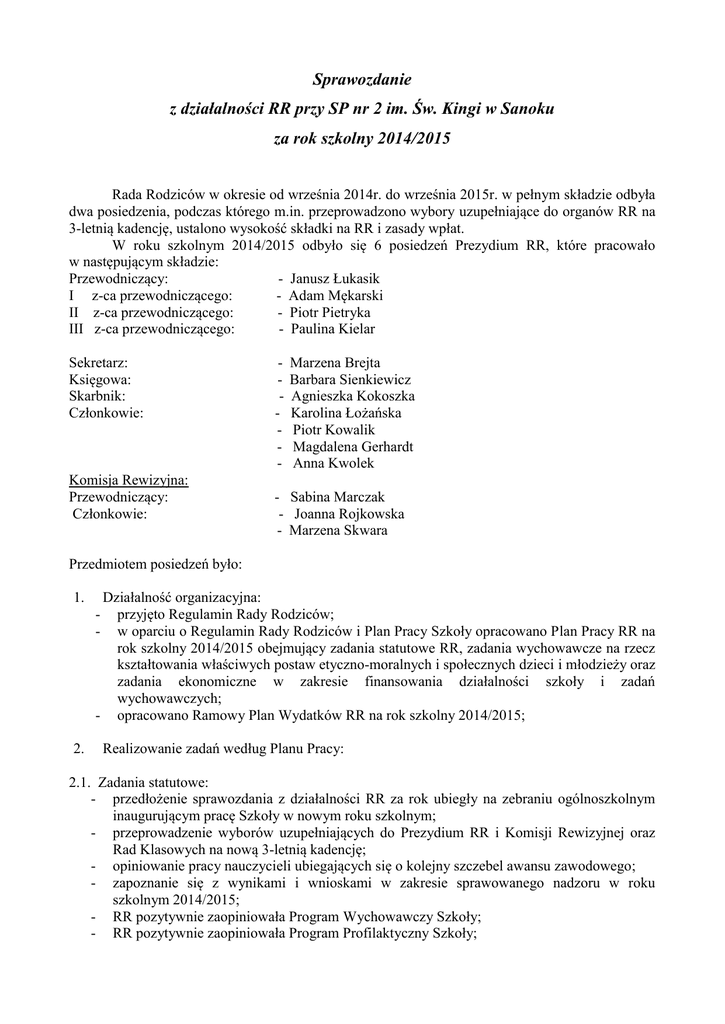 Sprawozdanie z działalności RR przy SP nr 2 im. Św. Kingi w Sanoku za rok szkolny 2014/2015 Rada Rodziców w okresie od września 2014r. do września 2015r. w pełnym składzie odbyła dwa posiedzenia, podczas którego m.in. przeprowadzono wybory uzupełniające do organów RR na 3-letnią kadencję, ustalono wysokość składki na RR i zasady wpłat. W roku szkolnym 2014/2015 odbyło się 6 posiedzeń Prezydium RR, które pracowało w następującym składzie: Przewodniczący: - Janusz Łukasik I z-ca przewodniczącego: - Adam Mękarski II z-ca przewodniczącego: - Piotr Pietryka III z-ca przewodniczącego: - Paulina Kielar Sekretarz: Księgowa: Skarbnik: Członkowie: Komisja Rewizyjna: Przewodniczący: Członkowie: - Marzena Brejta Barbara Sienkiewicz Agnieszka Kokoszka Karolina Łożańska Piotr Kowalik Magdalena Gerhardt Anna Kwolek - Sabina Marczak - Joanna Rojkowska - Marzena Skwara Przedmiotem posiedzeń było: 1. 2. Działalność organizacyjna: - przyjęto Regulamin Rady Rodziców; - w oparciu o Regulamin Rady Rodziców i Plan Pracy Szkoły opracowano Plan Pracy RR na rok szkolny 2014/2015 obejmujący zadania statutowe RR, zadania wychowawcze na rzecz kształtowania właściwych postaw etyczno-moralnych i społecznych dzieci i młodzieży oraz zadania ekonomiczne w zakresie finansowania działalności szkoły i zadań wychowawczych; - opracowano Ramowy Plan Wydatków RR na rok szkolny 2014/2015; Realizowanie zadań według Planu Pracy: 2.1. Zadania statutowe: - przedłożenie sprawozdania z działalności RR za rok ubiegły na zebraniu ogólnoszkolnym inaugurującym pracę Szkoły w nowym roku szkolnym; - przeprowadzenie wyborów uzupełniających do Prezydium RR i Komisji Rewizyjnej oraz Rad Klasowych na nową 3-letnią kadencję; - opiniowanie pracy nauczycieli ubiegających się o kolejny szczebel awansu zawodowego; - zapoznanie się z wynikami i wnioskami w zakresie sprawowanego nadzoru w roku szkolnym 2014/2015; - RR pozytywnie zaopiniowała Program Wychowawczy Szkoły; - RR pozytywnie zaopiniowała Program Profilaktyczny Szkoły; - RR pozytywnie zaopiniowała realizację czwartej godziny wychowania fizycznego; RR pozytywnie zaopiniowała wolne dodatkowe dni od nauki szkolnej w roku szkolnym 2014/2015; RR zapoznała się z projektem planu finansowego szkoły na 2015 rok; RR pozytywnie zaopiniowała utworzenie klasy innowacyjnej z matematyki w roku szkolnym 2015/2016; RR pozytywnie zaopiniowała zestawy podręczników na rok szkolny 2015/2016; RR pozytywnie zaopiniowała zakup książek do biblioteki szkolnej; RR zapoznała się z informacją o wypadkach w szkole zgłoszonych, które wymagały interwencji lekarskiej. 2.2. Zadania wychowawcze: - udział rodziców w zawodach sportowych i imprezach środowiskowych, w tym w pikniku sportowo-rekreacyjnym; - uczestnictwo rodziców w lekcjach „otwartych”, w „dniach otwartych szkoły”; - opracowanie harmonogramu imprez klasowych z udziałem rodziców; - uczestnictwo rodziców w uroczystościach szkolnych, dyskotekach i zabawach szkolnych; - udział rodziców w indywidualnych konsultacjach z Pedagogiem Szkolnym; - uczestniczenie rodziców w kultywowaniu zwyczajów, obrzędów i tradycji (Św. Mikołaj, opłatek, tłusty czwartek, Dzień Dziecka ) oraz w tworzeniu własnych zwyczajów (Święto Szkoły, pożegnanie klas szóstych); - pomoc w organizowaniu wycieczek turystyczno-krajoznawczych i tematycznych; - współpraca w zakresie organizacji różnych akcji mających na celu pozyskiwanie środków finansowych na rzecz Szkoły; 2.3. Zadania ekonomiczne: - zbiórka pieniędzy na rzecz RR z przeznaczeniem m.in., zakup czekolad, pączków, lodów, oraz wspomaganie sygnalizowanych przez Dyrekcję Szkoły bieżących działań np. zakup nagród na koniec roku, dofinansowanie nagrody dla „Klasy Roku”, ”Ucznia Roku”, przekazanie środków finansowych pozyskanych przez Radę Rodziców dla najlepszych sportowców oraz wspieranie działań wychowawczych; - wspomaganie działań dyrekcji w ramach trwałego wyposażenia szkoły, tj: zakup kolejnego segmentu szafek ubraniowych (kwota 7200 zł ze składek na RR, pozostała część pochodziła ze środków Stowarzyszenia); zakup projektora oraz dwóch radioodtwarzaczy z okazji DEN; - pomoc w pozyskiwaniu środków finansowych z różnych akcji min. przekazanie 1% podatku na działalność statutową Stowarzyszenia Inicjatyw Edukacyjnych "Kinga" działającego przy szkole. 3. Współpraca Rady Rodziców z Dyrekcją Szkoły. Panie Dyrektor: mgr Maria Harajda i mgr Alicja Staruchowicz- Pastuszczak uczestniczyły we wszystkich posiedzeniach RR i Prezydium RR, na bieżąco informując o potrzebach, planach, problemach i osiągnięciach Szkoły. Decyzje dotyczące rozwiązywania problemów i wydawania środków podejmowano wspólnie, po dokładnej analizie i dyskusji. Bardzo dobra współpraca z Dyrekcją wpływała na umacnianie wizerunku „szkoły otwartej”, na efektywność działań wychowawczych oraz kształcenie właściwych postaw etyczno-moralnych i społecznych dzieci i młodzieży. Sporządziła: Marzena Brejta