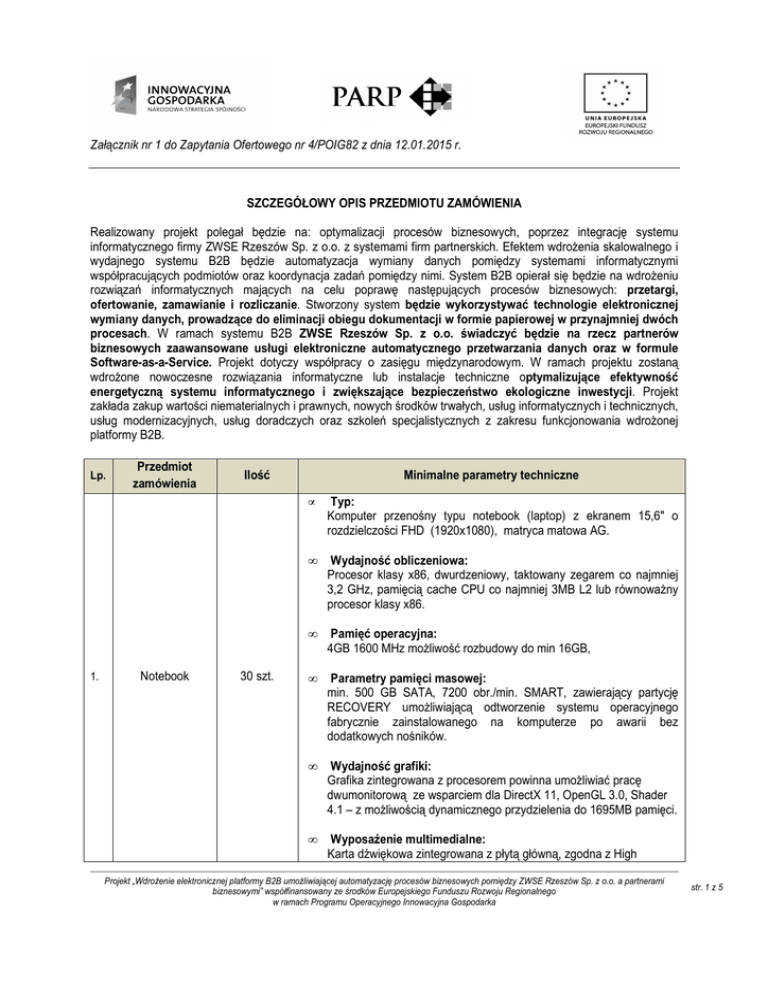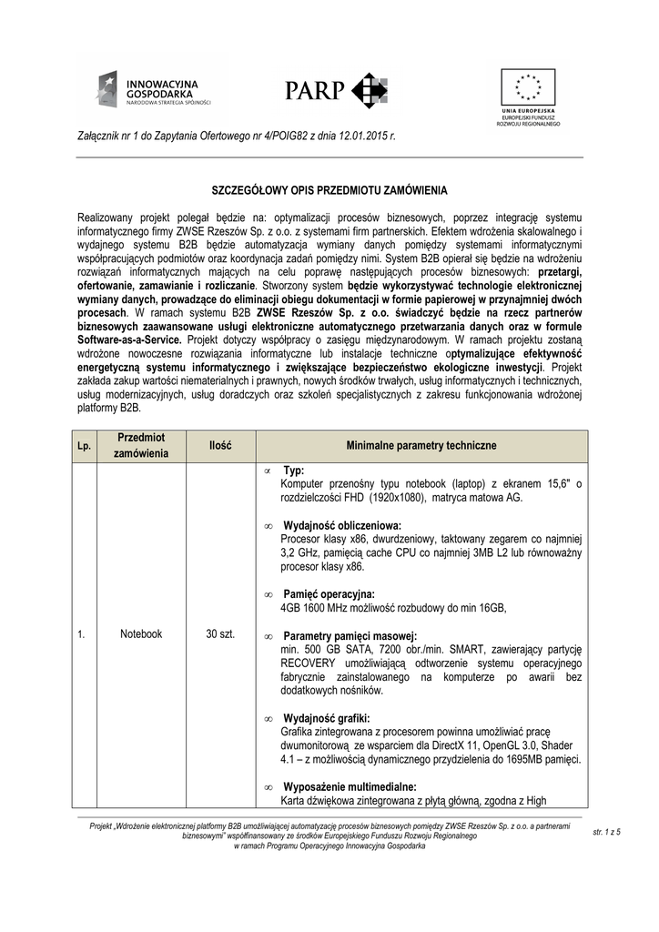 Załącznik nr 1 do Zapytania Ofertowego nr 4/POIG82 z dnia 12.01.2015 r. SZCZEGÓŁOWY OPIS PRZEDMIOTU ZAMÓWIENIA Realizowany projekt polegał będzie na: optymalizacji procesów biznesowych, poprzez integrację systemu informatycznego firmy ZWSE Rzeszów Sp. z o.o. z systemami firm partnerskich. Efektem wdrożenia skalowalnego i wydajnego systemu B2B będzie automatyzacja wymiany danych pomiędzy systemami informatycznymi współpracujących podmiotów oraz koordynacja zadań pomiędzy nimi. System B2B opierał się będzie na wdrożeniu rozwiązań informatycznych mających na celu poprawę następujących procesów biznesowych: przetargi, ofertowanie, zamawianie i rozliczanie. Stworzony system będzie wykorzystywać technologie elektronicznej wymiany danych, prowadzące do eliminacji obiegu dokumentacji w formie papierowej w przynajmniej dwóch procesach. W ramach systemu B2B ZWSE Rzeszów Sp. z o.o. świadczyć będzie na rzecz partnerów biznesowych zaawansowane usługi elektroniczne automatycznego przetwarzania danych oraz w formule Software-as-a-Service. Projekt dotyczy współpracy o zasięgu międzynarodowym. W ramach projektu zostaną wdrożone nowoczesne rozwiązania informatyczne lub instalacje techniczne optymalizujące efektywność energetyczną systemu informatycznego i zwiększające bezpieczeństwo ekologiczne inwestycji. Projekt zakłada zakup wartości niematerialnych i prawnych, nowych środków trwałych, usług informatycznych i technicznych, usług modernizacyjnych, usług doradczych oraz szkoleń specjalistycznych z zakresu funkcjonowania wdrożonej platformy B2B. Lp. 1. Przedmiot zamówienia Notebook Ilość 30 szt. Minimalne parametry techniczne • Typ: Komputer przenośny typu notebook (laptop) z ekranem 15,6" o rozdzielczości FHD (1920x1080), matryca matowa AG. • Wydajność obliczeniowa: Procesor klasy x86, dwurdzeniowy, taktowany zegarem co najmniej 3,2 GHz, pamięcią cache CPU co najmniej 3MB L2 lub równoważny procesor klasy x86. • Pamięć operacyjna: 4GB 1600 MHz możliwość rozbudowy do min 16GB, • Parametry pamięci masowej: min. 500 GB SATA, 7200 obr./min. SMART, zawierający partycję RECOVERY umożliwiającą odtworzenie systemu operacyjnego fabrycznie zainstalowanego na komputerze po awarii bez dodatkowych nośników. • Wydajność grafiki: Grafika zintegrowana z procesorem powinna umożliwiać pracę dwumonitorową ze wsparciem dla DirectX 11, OpenGL 3.0, Shader 4.1 – z możliwością dynamicznego przydzielenia do 1695MB pamięci. • Wyposażenie multimedialne: Karta dźwiękowa zintegrowana z płytą główną, zgodna z High Projekt „Wdrożenie elektronicznej platformy B2B umożliwiającej automatyzację procesów biznesowych pomiędzy ZWSE Rzeszów Sp. z o.o. a partnerami biznesowymi” współfinansowany ze środków Europejskiego Funduszu Rozwoju Regionalnego w ramach Programu Operacyjnego Innowacyjna Gospodarka str. 1 z 5 Załącznik nr 1 do Zapytania Ofertowego nr 4/POIG82 z dnia 12.01.2015 r. Definition, wbudowane dwa głośniki z technologią DTS Boost • Wymagania dotyczące baterii i zasilania: 6-cell, 72WHr, Li-Ion. Zabezpieczenie przed przypadkowym wypadnięciem baterii. • Bezpieczeństwo: Złącze typu Kensington Lock lub równoważne, • Wbudowane porty i złącza: Min. 3x USB 3.0 (1 z możliwością ładowania zewnętrznych urządzeń bezpośrednio z portu USB komputera). RJ-45 VGA Display Port Audio: line-in/mikrofon Audio: line-out/słuchawki Kamera HD z mikrofonem stereofonicznym wbudowana w obudowę matrycy Karta sieciowa LAN 10/100/1000 Ethernet RJ 45 zintegrowana z płytą główną. Zintegrowana w postaci wewnętrznego modułu mini-PCI Express karta sieci WLAN o standardzie 802.11ac Klawiatura układ US –QWERTY z wydzielona klawiaturą numeryczną, Touchpad Bluetooth 4.0, Napęd optyczny DVD +/- RW, zamawiający nie dopuszcza rozwiązania typu „slot”, wnęka na napęd optyczny powinna umożliwiać instalacje wymiennie dodatkowego dysku twardego pracującego w oparciu o interfejs S-ATA II. Dedykowane złącze do stacji dokującej • Gwarancji jakości producenta: Na okres co najmniej 12 miesięcy Naprawy gwarancyjne urządzeń muszą być realizowany przez Producenta lub Autoryzowanego Partnera Serwisowego Producenta • System operacyjny: OS klasy Microsoft Windows 7/Windows 8.1 Professional 64 Bit • Inne: Oprogramowanie klasy Ms Office 2013 H&B; Projekt „Wdrożenie elektronicznej platformy B2B umożliwiającej automatyzację procesów biznesowych pomiędzy ZWSE Rzeszów Sp. z o.o. a partnerami biznesowymi” współfinansowany ze środków Europejskiego Funduszu Rozwoju Regionalnego w ramach Programu Operacyjnego Innowacyjna Gospodarka str. 2 z 5 Załącznik nr 1 do Zapytania Ofertowego nr 4/POIG82 z dnia 12.01.2015 r. 2. Komputer stacjonarny 10 szt. • Typ: Komputer stacjonarny. W ofercie wymagane jest podanie modelu, symbolu oraz producenta • Zastosowanie: Komputer będzie wykorzystywany dla potrzeb aplikacji biurowych, aplikacji edukacyjnych, aplikacji obliczeniowych, dostępu do Internetu oraz poczty elektronicznej, jako lokalna baza danych, stacja programistyczna • Wydajność obliczeniowa: Procesor taktowany zegarem co najmniej 3,10 GHz, pamięci cache L3 6MB • Pamięć operacyjna: 4GB 1600 MHz możliwość rozbudowy do min 16GB, • Parametry pamięci masowej: Min. 500 GB SATA, 7200 obr./min. zawierający partycję RECOVERY umożliwiającą odtworzenie systemu operacyjnego fabrycznie zainstalowanego na komputerze po awarii bez dodatkowych nośników. • Wydajność grafiki: Grafika zintegrowana z procesorem powinna umożliwiać pracę dwumonitorową ze wsparciem dla DirectX 11.1, Open CL 1.2, Open GL 3.3, Shader 5.0 – z możliwością dynamicznego przydzielenia do 1 GB pamięci • Wyposażenie multimedialne: Karta dźwiękowa zintegrowana z płytą główną, zgodna z High Definition, porty słuchawek i mikrofonu na przednim oraz na tylnym panelu obudowy • Obudowa: Typu