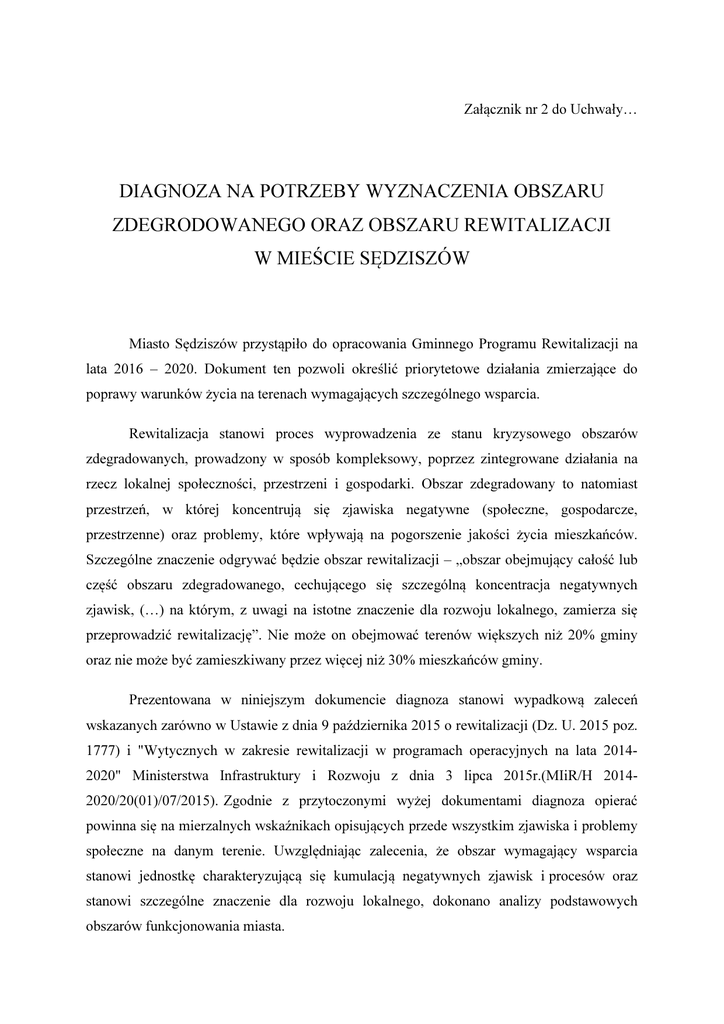 Załącznik nr 2 do Uchwały… DIAGNOZA NA POTRZEBY WYZNACZENIA OBSZARU ZDEGRODOWANEGO ORAZ OBSZARU REWITALIZACJI W MIEŚCIE SĘDZISZÓW Miasto Sędziszów przystąpiło do opracowania Gminnego Programu Rewitalizacji na lata 2016 – 2020. Dokument ten pozwoli określić priorytetowe działania zmierzające do poprawy warunków życia na terenach wymagających szczególnego wsparcia. Rewitalizacja stanowi proces wyprowadzenia ze stanu kryzysowego obszarów zdegradowanych, prowadzony w sposób kompleksowy, poprzez zintegrowane działania na rzecz lokalnej społeczności, przestrzeni i gospodarki. Obszar zdegradowany to natomiast przestrzeń, w której koncentrują się zjawiska negatywne (społeczne, gospodarcze, przestrzenne) oraz problemy, które wpływają na pogorszenie jakości życia mieszkańców. Szczególne znaczenie odgrywać będzie obszar rewitalizacji – „obszar obejmujący całość lub część obszaru zdegradowanego, cechującego się szczególną koncentracja negatywnych zjawisk, (…) na którym, z uwagi na istotne znaczenie dla rozwoju lokalnego, zamierza się przeprowadzić rewitalizację”. Nie może on obejmować terenów większych niż 20% gminy oraz nie może być zamieszkiwany przez więcej niż 30% mieszkańców gminy. Prezentowana w niniejszym dokumencie diagnoza stanowi wypadkową zaleceń wskazanych zarówno w Ustawie z dnia 9 października 2015 o rewitalizacji (Dz. U. 2015 poz. 1777) i "Wytycznych w zakresie rewitalizacji w programach operacyjnych na lata 20142020" Ministerstwa Infrastruktury i Rozwoju z dnia 3 lipca 2015r.(MIiR/H 20142020/20(01)/07/2015). Zgodnie z przytoczonymi wyżej dokumentami diagnoza opierać powinna się na mierzalnych wskaźnikach opisujących przede wszystkim zjawiska i problemy społeczne na danym terenie. Uwzględniając zalecenia, że obszar wymagający wsparcia stanowi jednostkę charakteryzującą się kumulacją negatywnych zjawisk i procesów oraz stanowi szczególne znaczenie dla rozwoju lokalnego, dokonano analizy podstawowych obszarów funkcjonowania miasta. METODOLOGIA Dla potrzeb Gminnego Programu Rewitalizacji przeprowadzono diagnozę stanu Miasta Sędziszowa. Dla potrzeb wyznaczenia obszaru zdegradowanego określono listę potencjalnych wskaźników zgodnych z zapisami Ustawy o rewitalizacji i Wytycznych Ministerstwa Infrastruktury i Rozwoju. Dla zobrazowania analizy dokonano podziału terenów zdegradowanych na sześć obszarów. Graficzny podział na obszary oraz dokładny wykaz działek stanowi załącznik nr 1 do diagnozy. Dla poszczególnych obszarów pozyskano materiały informacyjne dostępne w zasobach Urzędu Miasta Sędziszów, jak i specjalnie w tym celu wygenerowane przez instytucje zewnętrzne – Powiatowy Urząd Pracy, Miejski Ośrodek Pomocy Społecznej w Sędziszowie i Komenda Policji w Sędziszowie. Uzyskane porównywalnych dane przeanalizowano wskaźników pod odnoszących kątem wartość możliwości danej stworzenia zmiennej do listy jednostki obwodu. Weryfikacja wskaźników objęła następujące elementy: • poprawność metodologiczna - wskaźnik powinien opisywać w sposób czytelny i przejrzysty dany problem, powinien być łatwy w odbiorze przez czytelnika, łatwo weryfikowalny, powinien również różnicować przestrzeń miasta i być skonstruowany zgodnie z zasadami matematycznymi i statystycznymi. • poprawność przestrzenna - wskaźnik powinien zostać odniesiony do jednostki mniejszej niż Gmina, w tym przypadku do obszar. W wyniku tak przeprowadzonej procedury wskazano listę 11 wskaźników, które zastosowano dla wyznaczenia obszaru zdegradowanego i obszaru rewitalizowanego. Wskaźniki te obejmują sferę społeczną (bezrobocie, ubóstwo, przestępczość/patologie, poziom edukacji, uczestnictwo w życiu publicznym), sferę gospodarczą (stopień przedsiębiorczości) oraz sferę techniczno-środowiskową (brak rozwiązań technicznych w budownictwie mieszkaniowym w zakresie zapewnienia energooszczędności oraz ochrony środowiska). Dodatkowo w dniach 18 lutego - 21 marca 2016 roku przeprowadzono badania ankietowe wśród mieszkańców, podczas których zebrano 101 ankiet. Badanie miało na celu poznanie opinii na temat obszarów miasta wymagających podjęcia działań rewitalizacyjnych - zarówno wskazania konkretnego obszaru miasta oraz dokonanie oceny kluczowych problemów na jej terenie. Obszar zdegradowany zgodnie z treścią Ustawy oraz Wytycznych Ministerstwa to obszar, na którym zidentyfikowano stan kryzysowy, tj. stan spowodowany koncentracją negatywnych zjawisk społecznych. Dlatego też w kolejnym etapie diagnozy podjęto próbę określenia obszarów charakteryzują się kumulacją problemów. I. WSKAŻNIKI SPOŁECZNE 1.1 Bezrobocie Zgodnie z danymi Powiatowego Urzędu Pracy w gminie Sędziszów na koniec 2015 roku zarejestrowanych było 614 bezrobotnych, co stanowi 7,58% liczby mieszkańców w wieku produkcyjnym. Wskaźnik ten wskazuje na gorszą sytuację na rynku pracy w Gminie Sędziszów niż w całym powiecie. Pozyskując dane z Powiatowego Urzędu Pracy w Jędrzejowie udało się obliczyć poziom bezrobocia w poszczególnych obszarach w Sędziszowie. 4,5% 3,9% 4,0% 3,6% 3,5% 3,1% 3,0% 2,5% 1,9% 2,0% Procentowy udział bezrobotnych 1,5% 1,0% 0,5% 0,5% 0,0% Obszar I Obszar II Obszar III Obszar IV Obszar V + VI Wykres. 1. Procentowy udział bezrobotnych w stosunku do czynnych zawodowo zarejestrowanych w Powiatowym Urzędzie Pracy na dzień 16.01.2016r. w Gminie Sędziszów. Przestrzenne zróżnicowanie bezrobocia w Sędziszowie jest znaczne. Rozkład wartości wskaźnika w analizowanych obszarach mieścił się w zakresie od 0,5% do 3,9% 1.1 Ubóstwo Analiza problemu społecznego jakim jest ubóstwo została wykonana w oparciu o dwa wskaźniki: liczbę rodzin objętych wsparciem Ośrodka Pomocy Społecznej w Sędziszowie oraz liczby skierowań do zawarcia umowy najmu lokalu mieszkaniowego z socjalnego zasobu miasta. Zgodnie z danymi OPS w Sędziszowie 