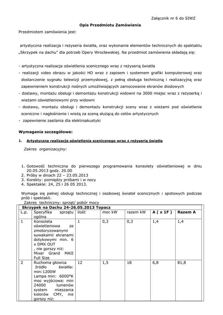 Załącznik nr 6 do SIWZ Opis Przedmiotu Zamówienia Przedmiotem zamówienia jest: artystyczna realizacja i reżyseria światła, oraz wykonanie elementów technicznych do spektaklu „Skrzypek na dachu” dla potrzeb Opery Wrocławskiej. Na przedmiot zamówienia składają się: - artystyczna realizacja oświetlenia scenicznego wraz z reżyserią światła - realizacji video obrazu w jakości HD wraz z zapisem i systemem grafiki komputerowej oraz dostarczenie sygnału telewizji przemysłowej, z pełną obsługa techniczną i realizacyjną oraz zapewnieniem konstrukcji nośnych umożliwiających zamocowanie ekranów diodowych - dostawy, montażu obsługi i demontażu konstrukcji widowni na 3000 miejsc wraz z reżyserką i wieżami oświetleniowymi przy widowni - dostawy, montażu obsługi i demontażu konstrukcji sceny wraz z wieżami pod oświetlenie sceniczne i nagłośnienie i wieżą za sceną służącą do celów artystycznych - zapewnienie zasilania dla elektroakustyki Wymagania szczegółowe: 1. Artystyczna realizacja oświetlenia scenicznego wraz z reżyserią światła Zakres organizacyjny: 1. Gotowość techniczna do pierwszego programowania konsolety oświetleniowej w dniu 20.05.2013 godz. 20.00 2. Próby w dniach 22 – 23.05.2013 3. Korekty: pomiędzy próbami i w nocy 4. Spektakle: 24, 25 i 26 05 2013. Wymaga się pełnej obsługi technicznej i osobowej świateł scenicznych i spotowych podczas prób i spektakli. Zakres techniczny: sprzęt/ pobór mocy Skrzypek na Dachu 24-26.05.2013 Topacz L.p. Specyfika sprzętu ilość moc kW razem kW A ( x 1F ) Razem A ogólna 1 0,3 0,3 1,4 1,4 1 Konsoleta oświetleniowa ze zmotoryzowanymi suwakamii ekranami dotykowymi min. 6 x DMX OUT , nie gorszy niż: Mixer Grand MAII Full Size 12 1,5 18 6,8 81,8 2 Ruchoma głowica źródło światła: min:1200W Lampa min: 6000°K moc wyjściowa: min 24000 lumenów system mieszania kolorów CMY, nie gorszy niż: 3 4 5 VARI*LITE VL3000 spot Ruchoma głowica źródło światła: min MSR 1200W Lampa min. 6300°K SYSTEM KOLORÓW CMY, Tarcza z 5 kolorami + biały, efekt rainbow, kolory 3D, nie gorszy niż: Coemar Infinity XL Wash Ruchoma głowica źródło światła: min 700W Lampa min. 5600°K moc wyjściowa: min 14,500 lumenów nie gorszy niż: VARI*LITE VL2500 spot Ruchoma głowica źródło światła: min 1200W Lampa min 6000°K moc wyjściowa: min 11,000 lumenów beam angle: 16° 24° nie gorszy niż: ClayPaky Stage Zoom 1200SV 24 1,5 36 6,8 163,6 12 1 12 4,5 54,5 10 1,5 15 6,8 68,2 6 Ruchoma głowica źródło światła: min MSR 575 W, SYSTEM KOLORÓW CMY nie gorszy niż: Martin MAC 600NT wash 10 0,7 7 3,2 31,8 7 Ruchoma głowica moc wyjściowa: min: 50,000 lumenów w trybie 1500W kolor: system mieszania kolorów CYM, nie gorszy niż: VARI*LITE VL3500 spot Naświetlacz LED owy min 16,7 mln kolorów. Kąt świecenia 20 stopni nie gorszy niż: PixelLine 10044 J.Thomas Naświetlacz żarowy/blind min 8 12 1,5 18 6,8 81,8 30 0,2 6 0,9 27,3 21 2,2 46,2 10,0 210,0 8 9 x 250 ACL, nie gorszy niż: Molefay/dwe 8 light 10 Maszyna dymu typu 1 1,5 1,5 Hazer, wentylator: min 6000 obrotów na minutę, czas reakcji ok. 60 sek, nie gorszy niż: Smoke machine Hazer Unique 11 Reflektor 4 3 12 prowadzący - Follow Spot, źródło światła min: HMI2500, Lampa min 5600°K nie gorszy niż: Robert Juliat Cyrano 2500W 12 Maszyna dymu 2 1,5 3 moc zadymienia min 85 m3/min , pobór mocy do 715 kW nie gorszy niż: Smoke machine MDG MAX 3000 APS 1,5 3 13 Maszyna dymu 2 zabudowana w case , pobór mocy do 1300 Watt, sterowanie DMX, nie gorszy niż: Smoke machine SmokeFaktory Captain D. Case 14 Lampa żarowa, moc 12 1 12 min 1000 Watt, np. Lamp PAR64 15 Reflektor profilowy 4 0,8 3,2 źródło światła żarowe do 1200 Watt, kąt światła 15-30 stopni, nie gorszy niż:. Lamp Profile ETC Source Four Zoom 15-30 Razem Razem peak per phase 1 Scena - zasilanie PowerLock 2 Reżyserka + widownia zasilanie 125Ax3F 6,8 6,8 13,6 54,5 6,8 13,6 6,8 13,6 4,5 54,5 3,6 14,5 178 269,7 A ( x 1F ) A ( x 1F ) kW A ( x 1F ) 205,3 82,6 Szczegółowe wymagania dla Wykonawcy: 1. Artystyczna realizacja oświetlenia scenicznego wraz z reżyserią dla zapewnienia najlepszego pod względem technicznym i artystycznym oświetlenia sceny, dekoracji oraz artystów wykonawców. Od wykonawcy wymagane jest opracowanie indywidualnego autorskiego projektu kreacji przestrzeni światłem( który zawiera rozmieszczenia oświetlenia, filtracji oraz rozmieszczenia oświetlenia scenograficznego), podkreślenia postaci solistów śpiewaków oraz statystów biorących udział w spektaklu oraz konfiguracji sprzętu według koncepcji reżyserskiej. Związane jest to z umiejętnością zgrania tempa spektaklu, oraz stworzenia artystycznego klimatu przedstawienia, indywidualnego potraktowania każdej postaci dla wykreowania jej charakteru. Twórcze skonfigurowanie i indywidualne rozwiązania w zastosowaniu sprzętu do zarysowania każdej postaci. W wykonaniu wspomnianych czynności konieczna jest od wykonawcy inwencja twórcza, duża wyobraźnia i umiejętność zastosowania barwy światła do kreacji przestrzeni widowiska. 2. Konieczne zapewnienie programisty konsolety oświetleniowej Grand MAII Full Size 3. Wykonawca wykona oświetlenie przeszkodowe/awaryjne wraz z zasilaniem zaplecza scenicznego, schodów scenicznych i innych miejsc (m.in.: na i za sceną, reżyserki) stanowiących zagrożenie na drogach komunikacyjnych artystów. 4. Przekazanie Zamawiającemu pełnej dokumentacji – zapisu scen świetlnych oraz ustawienia i połączeń reflektorów. 5. Sprzęt oświetleniowy i elementy wiszące muszą posiadać: - linki zabezpieczające - niezbędne atesty bezpieczeństwa. 6. Wykonanie pomiarów instalacji elektrycznej głównego zasilania (pionów instalacyjnych i rozdzielnic) dla zamontowanego sprzętu (przekazanie protokołów w terminie do 21.05.2013). 7. Wszystkie trasy przebiegu instalacji wykonane zgodnie z przepisami bhp i ppoż. 8. System komunikacji reżyserka 