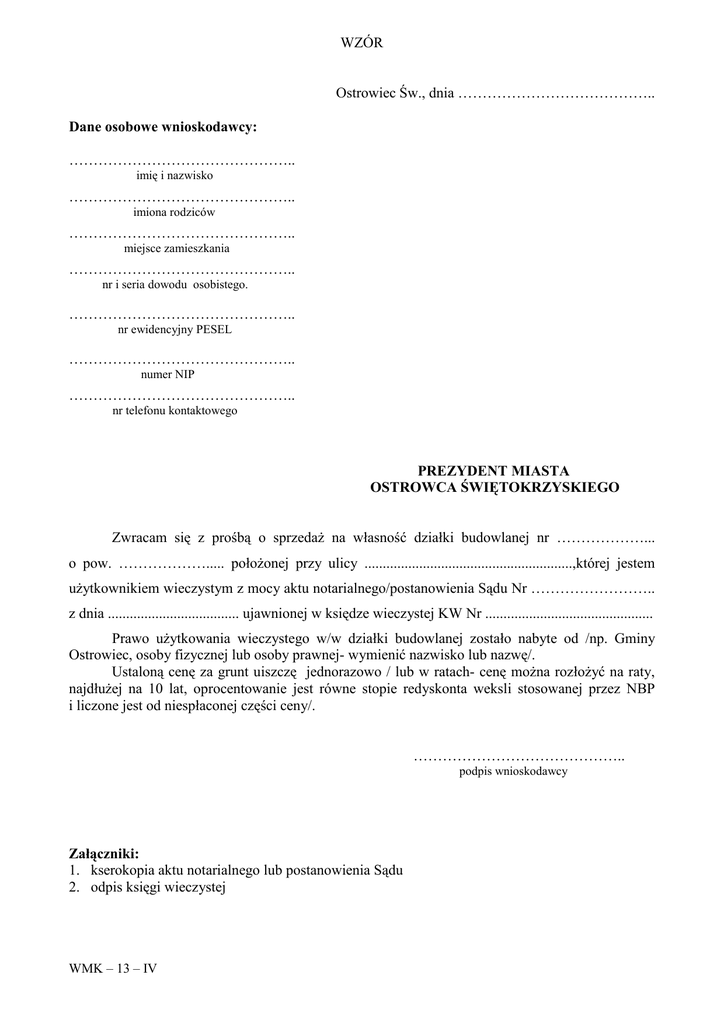 WZÓR Ostrowiec Św., dnia ………………………………….. Dane osobowe wnioskodawcy: ……………………………………….. imię i nazwisko ……………………………………….. imiona rodziców ……………………………………….. miejsce zamieszkania ……………………………………….. nr i seria dowodu osobistego. ……………………………………….. nr ewidencyjny PESEL ……………………………………….. numer NIP ……………………………………….. nr telefonu kontaktowego PREZYDENT MIASTA OSTROWCA ŚWIĘTOKRZYSKIEGO Zwracam się z prośbą o sprzedaŜ na własność działki budowlanej nr ………………... o pow. ………………..... połoŜonej przy ulicy .........................................................,której jestem uŜytkownikiem wieczystym z mocy aktu notarialnego/postanowienia Sądu Nr …………………….. z dnia .................................... ujawnionej w księdze wieczystej KW Nr .............................................. Prawo uŜytkowania wieczystego w/w działki budowlanej zostało nabyte od /np. Gminy Ostrowiec, osoby fizycznej lub osoby prawnej- wymienić nazwisko lub nazwę/. Ustaloną cenę za grunt uiszczę jednorazowo / lub w ratach- cenę moŜna rozłoŜyć na raty, najdłuŜej na 10 lat, oprocentowanie jest równe stopie redyskonta weksli stosowanej przez NBP i liczone jest od niespłaconej części ceny/. …………………………………….. podpis wnioskodawcy Załączniki: 1. kserokopia aktu notarialnego lub postanowienia Sądu 2. odpis księgi wieczystej WMK – 13 – IV