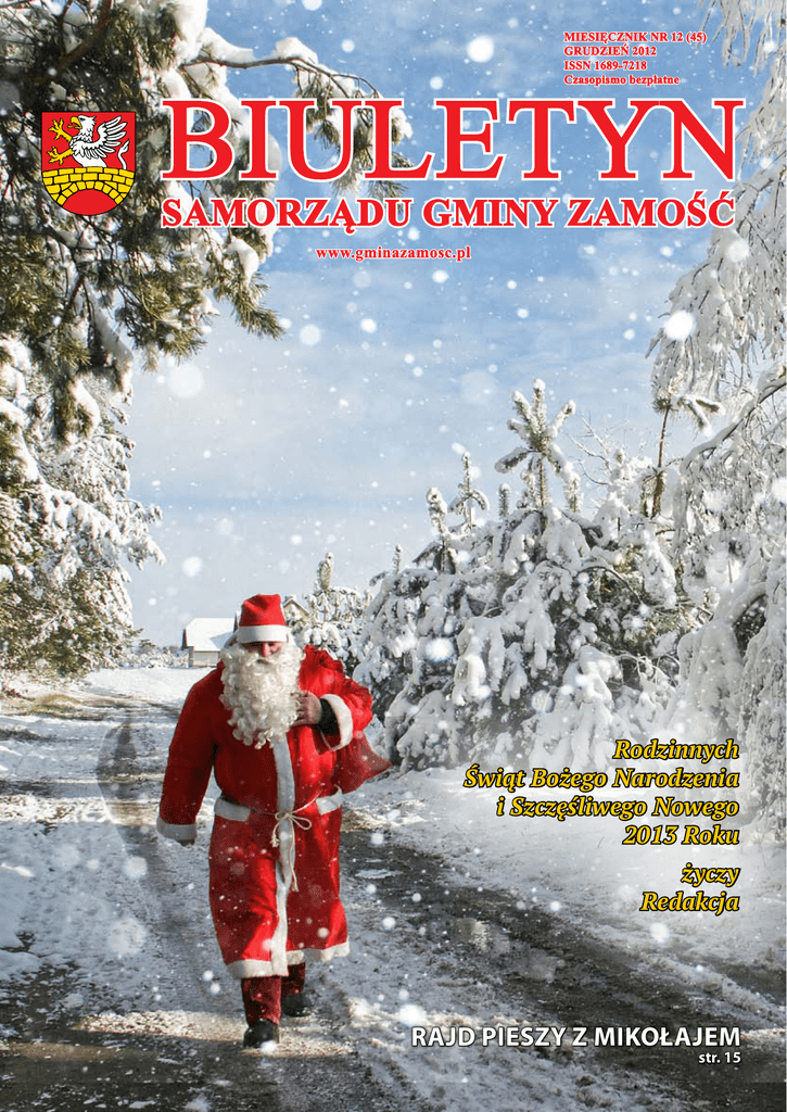 MIESIĘCZNIK NR 12 (45) grudzień 2012 ISSN 1689-7218 Czasopismo bezpłatne BIULETYN SAMORZĄDU GMINY ZAMOŚĆ www.gminazamosc.pl Rodzinnych Świąt Bożego Narodzenia i Szczęśliwego Nowego 2013 Roku życzy Redakcja rajd pieszy z mikołajem str. 15 Z okazji zbliżających się Świąt Bożego Narodzenia dużo zdrowia, radości oraz ciepłej, rodzinnej atmosfery przy wigilijnym stole. Niech kolejny Nowy Rok przyniesie pokój oraz pozwoli na realizację własnych zamierzeń. Wszystkim mieszkańcom gminy Zamość życzą Zdrowych, radosnych i pogodnych Świąt Bożego Narodzenia, pełnych miłości, rodzinnego ciepła, wzajemnej życzliwości i serdeczności. Wszystkiego co najlepsze w nadchodzącym Nowym Roku Emerytom, rencistom, nauczycielom, byłym pracownikom oświaty Gminy Zamość życzy Wicestarosta Jerzy Sobczuk oraz Radni Rady Powiatu w Zamościu: Anna Soboń Ryszard Ciurysek Ireneusz Ścirka Zarząd Stowarzyszenia Emerytów i Rencistów Gminy Zamość Najlepsze życzenia z okazji Świąt Bożego Narodzenia dużo zdrowia, radości, pogody ducha i wszystkiego dobrego w Nowym Roku Mieszkańcom i całej Społeczności Gminy Zamość życzy Zarząd Stowarzyszenia Kobiet na rzecz promocji i rozwoju środowisk lokalnych 28 + Pachnących choinką, szczęśliwych Świąt Bożego Narodzenia, przeżywanych w cieple domowego ogniska w kręgu najbliższych, pogody ducha i pomyślności na Nowy 2013 Rok życzy Polskie Stronnictwo Ludowe Szanownym Państwu Mieszkańcom Gminy Zamość Czytelnikom Biuletynu Spokojnych Świąt Bożego Narodzenia dających miłość, radość i wzajemne zrozumienie, rodzinnego ciepła i odpoczynku od codziennego pośpiechu, Nowego Roku przynoszącego szczęśliwe dni i spełnienie nadziei życzą Przewodniczący Rady Gminy Zamość Wójt Gminy Zamość Jerzy Bondyra Ryszard Gliwiński W owym czasie wyszło rozporządzenie Cezara Augusta, żeby przeprowadzić spis ludności w całym państwie. Pierwszy ten spis odbył się wówczas, gdy wielkorządcą Syrii był Kwiryniusz. Wybierali się więc wszyscy, aby się dać zapisać, każdy do swego miasta. Udał się także Józef z Galilei, z miasta Nazaret, do Judei, do miasta Dawidowego, zwanego Betlejem, ponieważ pochodził z domu i rodu Dawida, żeby się dać zapisać z poślubioną sobie Maryją, która była brzemienna. Kiedy tam przebywali, nadszedł dla Maryi czas rozwiązania. Porodziła swego pierworodnego Syna, owinęła Go w pieluszki i położyła w żłobie, gdyż nie było dla nich miejsca w gospodzie. W tej samej okolicy przebywali w polu pasterze i trzymali straż nocną nad swoim stadem. Naraz stanął przy nich anioł Pański i chwała Pańska zewsząd ich oświeciła, tak że bardzo się przestraszyli. Lecz anioł rzekł do nich: „Nie bójcie się! Oto zwiastuję wam radość wielką, która będzie udziałem całego narodu; dziś w mieście Dawida narodził się wam Zbawiciel, którym jest Mesjasz Pan. A to będzie znakiem dla was: Znajdziecie Niemowlę, owinięte w pieluszki i leżące w żłobie”. I nagle przyłączyło się do anioła mnóstwo zastępów niebieskich, które wielbiły Boga słowami: „Chwała Bogu na wysokościach, a na ziemi pokój ludziom, w których ma upodobanie”. Łk 2,1‒14 Biuletyn grudzień 2012 4 ważne wydarzenie KARTKI bożonarodzeniowe GMINY ZAMOŚĆ Już po raz dziewiąty odbył się konkurs plastyczny „Kartki Bożonarodzeniowe Gminy Zamość”. Na tegoroczną edycję wpłynęło 608 prac. Pięć najpiękniejszych zostało wydrukowanych i rozesłanych z życzeniami świątecznymi od Samorządu Gminy Zamość. Wyróżnieni i nagrodzeni uczestnicy konkursu Konkurs został przeprowadzony w 6 kategoriach: I – dzieci do lat 6 (klasa 0), II – klasy I-III szkoły podstawowej, III – klasy IV-VI szkoły podstawowej, IV – gimnazjum i szkoła średnia, V – „open” osoby dorosłe powyżej 18 roku życia, VI – rodzinna. Patronat nad konkursem objął Wójt Gminy Zamość. Jury w składzie: Robert Gomułka i Jerzy Cabaj wybrało 5 najpiękniejszych prac- zwycięzców konkursu, przyznało także 6 wyróżnień specjalnych i 92 wyróżnienia. Laureatami konkursu zostali: Karolina Bełz, lat 6, ZSPiP w Kalinowicach, Diana Bartko, lat 6, ZSPiP w Kalinowicach, Podczas podsumowania konkursu Adam Gorzkowski, kl. II, Niepubliczne Gimnazjum w Zawadzie, Kamil Mołdoch, kl. IV, Szkoła Podstawowa w Lipsku, Aleksandra Szuwara, kl. IV SP w Pniówku. Wyróżnienia specjalne otrzymali: Iwona Furmaniak, kl. V, SP w Lipsku, Jakub Hałasa, kl. I, ZSPiP w Kalinowicach, Agnieszka Gęśla, kl. VI, SP w Białowoli, Ewa Misztal, kl. I gimnazjum, ZS w Wysokiem, Natalia Misztal, kl. II szkoły podstawowej, ZS w Wysokiem, Kasia Wiatrowska, kl. I, ZSPiP w Kalinowicach. Wyróżnienia otrzymali: Amelia Mielcarek, Bartłomiej Libera, Kamila Pukaluk, Iga Najda, Sylwia Struzik, Wiktoria Sapu- ta, Nikola Jachymczyk, Wiktor Buczyński, Patryk Podolak, Kamila Sznajdrowicz, Arkadiusz Kłapouchy, Julia Bednarz, Igor Kycko, Kamila Jachymczyk, Mateusz Szewczuk, Iga Bielecka, Sebastian Miszczuk, Kamila Jędruszko, Wiktoria Siekierda, Maks Dębiński, Agnieszka Lis, Oktawia Wasilewska, Agata Szust, Oliwia Kawałko (ZSPiP w Kalinowicach); Oliwia Malec, Julia Staniecka, Karolina Mejran, Joanna Duda, Karolina Klus, Joanna Głazowska, Marlena Mojżesz (Zespół Szkół w Płoskiem); Jakub Czuba, Kacper Kukiełka, Dariusz Kudyk, Weronika Dąbrowska, Natalia Michońska, Jakub Małek, Martyna Kawałko (Szkoła Podstawowa w Pniówku); Arkadiusz Tymura, Malwina Gac, Dawid Makowski, Paulina Psiuk, Adam Małysz, Krzysztof Szaran (Szkoła Podstawowa w Mokrem); Martyna Czerniec, Kinga Nieckarz, Dagmara Łyś, Sandra Skrzypa, Natalia Staszczuk, Michał Perduta, Julia Chudyga, Anna Marczuk, Damian Kwitek, Kamila Czerniec (Zespół Szkół w Wysokiem); Oliwia Pasieczna, Karolina Zych, Julia Małecka, Kacper Bekier (Zespół Szkół w Żdanowie); Adrian Pupiec, Sylwester Lenczewski (Szkoła Podstawowa w Białow