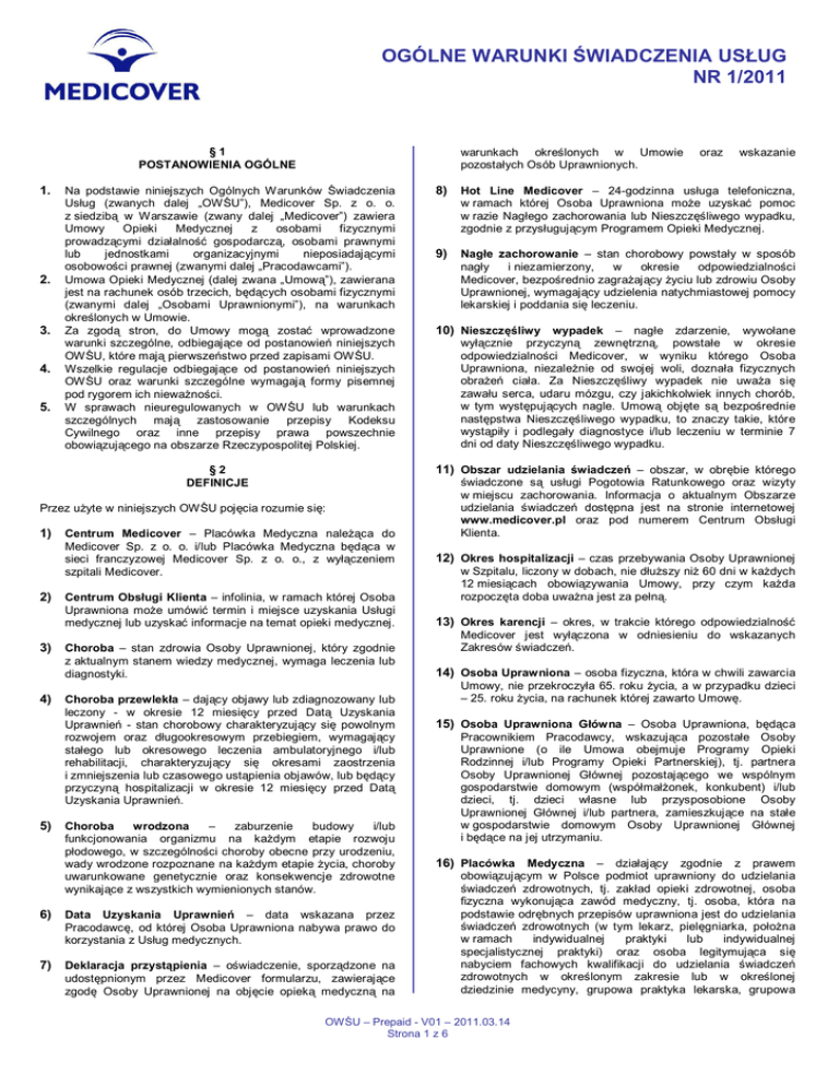 OGÓLNE WARUNKI ŚWIADCZENIA USŁUG NR 1/2011 §1 POSTANOWIENIA OGÓLNE 1. 2. 3. 4. 5. warunkach określonych w Umowie pozostałych Osób Uprawnionych. Na podstawie niniejszych Ogólnych Warunków Świadczenia Usług (zwanych dalej „OWŚU”), Medicover Sp. z o. o. z siedzibą w Warszawie (zwany dalej „Medicover”) zawiera Umowy Opieki Medycznej z osobami fizycznymi prowadzącymi działalność gospodarczą, osobami prawnymi lub jednostkami organizacyjnymi nieposiadającymi osobowości prawnej (zwanymi dalej „Pracodawcami”). Umowa Opieki Medycznej (dalej zwana „Umową”), zawierana jest na rachunek osób trzecich, będących osobami fizycznymi (zwanymi dalej „Osobami Uprawnionymi”), na warunkach określonych w Umowie. Za zgodą stron, do Umowy mogą zostać wprowadzone warunki szczególne, odbiegające od postanowień niniejszych OWŚU, które mają pierwszeństwo przed zapisami OWŚU. Wszelkie regulacje odbiegające od postanowień niniejszych OWŚU oraz warunki szczególne wymagają formy pisemnej pod rygorem ich nieważności. W sprawach nieuregulowanych w OWŚU lub warunkach szczególnych mają zastosowanie przepisy Kodeksu Cywilnego oraz inne przepisy prawa powszechnie obowiązującego na obszarze Rzeczypospolitej Polskiej. Przez użyte w niniejszych OWŚU pojęcia rozumie się: 2) 3) 4) 5) wskazanie 8) Hot Line Medicover – 24-godzinna usługa telefoniczna, w ramach której Osoba Uprawniona może uzyskać pomoc w razie Nagłego zachorowania lub Nieszczęśliwego wypadku, zgodnie z przysługującym Programem Opieki Medycznej. 9) Nagłe zachorowanie – stan chorobowy powstały w sposób nagły i niezamierzony, w okresie odpowiedzialności Medicover, bezpośrednio zagrażający życiu lub zdrowiu Osoby Uprawnionej, wymagający udzielenia natychmiastowej pomocy lekarskiej i poddania się leczeniu. 10) Nieszczęśliwy wypadek – nagłe zdarzenie, wywołane wyłącznie przyczyną zewnętrzną, powstałe w okresie odpowiedzialności Medicover, w wyniku którego Osoba Uprawniona, niezależnie od swojej woli, doznała fizycznych obrażeń ciała. Za Nieszczęśliwy wypadek nie uważa się zawału serca, udaru mózgu, czy jakichkolwiek innych chorób, w tym występujących nagle. Umową objęte są bezpośrednie następstwa Nieszczęśliwego wypadku, to znaczy takie, które wystąpiły i podlegały diagnostyce i/lub leczeniu w terminie 7 dni od daty Nieszczęśliwego wypadku. 11) Obszar udzielania świadczeń – obszar, w obrębie którego §2 DEFINICJE 1) oraz Centrum Medicover – Placówka Medyczna należąca do Medicover Sp. z o. o. i/lub Placówka Medyczna będąca w sieci franczyzowej Medicover Sp. z o. o., z wyłączeniem szpitali Medicover. Centrum Obsługi Klienta – infolinia, w ramach której Osoba Uprawniona może umówić termin i miejsce uzyskania Usługi medycznej lub uzyskać informacje na temat opieki medycznej. Choroba – stan zdrowia Osoby Uprawnionej, który zgodnie z aktualnym stanem wiedzy medycznej, wymaga leczenia lub diagnostyki. Choroba przewlekła – dający objawy lub zdiagnozowany lub leczony - w okresie 12 miesięcy przed Datą Uzyskania Uprawnień - stan chorobowy charakteryzujący się powolnym rozwojem oraz długookresowym przebiegiem, wymagający stałego lub okresowego leczenia ambulatoryjnego i/lub rehabilitacji, charakteryzujący się okresami zaostrzenia i zmniejszenia lub czasowego ustąpienia objawów, lub będący przyczyną hospitalizacji w okresie 12 miesięcy przed Datą Uzyskania Uprawnień. Choroba wrodzona – zaburzenie budowy i/lub funkcjonowania organizmu na każdym etapie rozwoju płodowego, w szczególności choroby obecne przy urodzeniu, wady wrodzone rozpoznane na każdym etapie życia, choroby uwarunkowane genetycznie oraz konsekwencje zdrowotne wynikające z wszystkich wymienionych stanów. 6) Data Uzyskania Uprawnień – data wskazana przez Pracodawcę, od której Osoba Uprawniona nabywa prawo do korzystania z Usług medycznych. 7) Deklaracja przystąpienia – oświadczenie, sporządzone na udostępnionym przez Medicover formularzu, zawierające zgodę Osoby Uprawnionej na objęcie opieką medyczną na świadczone są usługi Pogotowia Ratunkowego oraz wizyty w miejscu zachorowania. Informacja o aktualnym Obszarze udzielania świadczeń dostępna jest na stronie internetowej www.medicover.pl oraz pod numerem Centrum Obsługi Klienta. 12) Okres hospitalizacji – czas przebywania Osoby Uprawnionej w Szpitalu, liczony w dobach, nie dłuższy niż 60 dni w każdych 12 miesiącach obowiązywania Umowy, przy czym każda rozpoczęta doba uważna jest za pełną. 13) Okres karencji – okres, w trakcie którego odpowiedzialność Medicover jest wyłączona w odniesieniu do wskazanych Zakresów świadczeń. 14) Osoba Uprawniona – osoba fizyczna, która w chwili zawarcia Umowy, nie przekroczyła 65. roku życia, a w przypadku dzieci – 25. roku życia, na rachunek której zawarto Umowę. 15) Osoba Uprawniona Główna – Osoba Uprawniona, będąca Pracownikiem Pracodawcy, wskazująca pozostałe Osoby Uprawnione (o ile Umowa obejmuje Programy Opieki Rodzinnej i/lub Programy Opieki Partnerskiej), tj. partnera Osoby Uprawnionej Głównej pozostającego we wspólnym gospodarstwie domowym (współmałżonek, konkubent) i/lub dzieci, tj. dzieci własne lub przysposobione Osoby Uprawnionej Głównej i/lub partnera, zamieszkujące na stałe w gospodarstwie domowym Osoby Uprawnionej Głównej i będące na jej utrzymaniu. 16) Placówka Medyczna – działający zgodnie z prawem obowiązującym w Polsce podmiot uprawniony do udzielania świadczeń zdrowotnych, tj. zakład opieki zdrowotnej, osoba fizyczna wykonująca zawód medyczny, tj. osoba, która na podstawie odrębnych przepisów uprawniona jest do udzielania świadczeń zdrowotnych (w tym lekarz, pielęgniarka, położna w ramach indywidualnej praktyki lub indywidualnej specjalistycznej praktyki) oraz osoba legitymująca się nabyciem fachowych kwalifikacji do udzielani