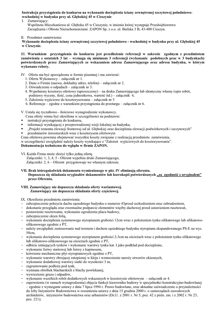 Instrukcja przystąpienia do konkursu na wykonanie docieplenia ściany zewnętrznej szczytowej południowowschodniej w budynku przy ul. Głębokiej 45 w Cieszynie I. Zamawiający: Wspólnota Mieszkaniowa ul. Głęboka 45 w Cieszynie, w imieniu której występuje Przedsiębiorstwo Zarządzania i Obrotu Nieruchomościami ZAPON Sp. z o.o. ul. Bielska 3 B, 43-400 Cieszyn. II. Przedmiot zamówienia: Wykonanie docieplenia ściany zewnętrznej szczytowej południowo - wschodniej w budynku przy ul. Głębokiej 45 w Cieszynie. III. Warunkiem przystąpienia do konkursu jest przedłożenie referencji w zakresie zgodnym z przedmiotem zamówienia z ostatnich 3 lat – wymaga się minimum 3 referencji (wykonanie podobnych prac w 3 budynkach) potwierdzonych przez Zamawiających ze wskazaniem adresu Zamawiającego oraz adresu budynku, w którym wykonano roboty. IV. Oferta ma być sporządzona w formie pisemnej i ma zawierać: 1. Oferta Wykonawcy – załącznik nr 1. 2. Dane o Firmie (nazwa, dokładny adres, telefon) – załącznik nr 2. 3. Oświadczenie o odpadach – załącznik nr 3. 4. Wypełniony kosztorys ofertowy (uproszczony) – na druku Zamawiającego lub identyczny własny (opis robót, podstawy wyceny, ilość, cena jednostkowa, wartość itd.) – załącznik 4, 5. Założenia wyjściowe do kosztorysowania – załącznik nr 5 6. Referencje – zgodne z warunkiem przystąpienia do przetargu – załącznik nr 6. V. Ustala się ryczałtowo - ilościowe wynagrodzenie wykonawcy. Cena oferty winna być określona w szczególności na podstawie: instrukcji przystąpienia do konkursu, informacji wynikającej z przeprowadzonej wizji lokalnej na budynku, „Projekt remontu elewacji frontowej od ul. Głębokiej oraz docieplenia elewacji podwórkowych i szczytowych” przedmiarów inwestorskich wraz z kosztorysem ofertowym Cena ofertowa powinna obejmować wszystkie koszty związane z realizacją przedmiotu zamówienia, w szczególności uwzględnić należy koszty wynikające z “Założeń wyjściowych do kosztorysowania”. Dokumentacja techniczna do wglądu w firmie ZAPON. VI. Każda Firma może złożyć tylko jedną ofertę. Załączniki: 1, 3, 4, 5 - Oferent wypełnia druki Zamawiającego, Załączniki: 2, 6 – Oferent przygotowuje we własnym zakresie. VII. Brak któregokolwiek dokumentu wymienionego w pkt. IV eliminują oferenta. Dopuszcza się składania oryginałów dokumentów lub kserokopii potwierdzonych „za zgodność z oryginałem” przez Oferenta. VIII. Zamawiający nie dopuszcza składania oferty wariantowej. Zamawiający nie dopuszcza składania oferty częściowej. IX. Określenie przedmiotu zamówienia: - zabezpieczenie pokrycia dachu sąsiedniego budynku o numerze 43przed uszkodzeniem oraz zabrudzeniem, - dokonanie przeglądu oraz ewentualne podparcie elementów więźby dachowej przed ustawieniem rusztowań, - postawienie rusztowania, wykonanie ogrodzenia placu budowy, - zabezpieczenie okien folią, - wykonanie docieplenia systemowego styropianem grubości 12cm wraz z położeniem tynku silikatowego lub silikatowosilikonowego zgodnie z PT, - należy uwzględnić zastosowanie nad terenem i dachem sąsiedniego budynku styropianu ekspandowanego PS-E na wys. 50cm, - wykonanie docieplenia systemowego styropianem grubości 2-3cm na ościeżach wraz z położeniem tynku silikatowego lub silikatowo-silikonowego na ościeżach zgodnie z PT, - odbicie istniejących tynków i wykonanie warstwy tynku kat. I jako podkład pod docieplenie, - wykonanie listwy startowej lub listwy z kapinosem, - kotwienie mechaniczne płyt styropianowych zgodnie z PT, - wykonanie warstwy zbrojącej zatopionej w kleju i wzmocnienie naroży otworów okiennych, - wykonanie dodatkowej warstwy siatki do wysokości 3 m, - zagruntowanie podłoża pod tynk, - wymiana obróbek blacharskich z blachy powlekanej, - wywiezienie gruzu i odpadów, - wykonanie wszelkich robót dodatkowych wskazanych w kosztorysie ofertowym – załącznik nr 4. - zapewnienie (w ramach wynagrodzenia) objęcia funkcji kierownika budowy w specjalności konstrukcyjno-budowlanej – zgodnie z wymogami ustawy z dnia 7 lipca 1994 r. Prawo budowlane, oraz aktualne zaświadczenie o przynależności do Izby Inżynierów Budownictwa w rozumieniu ustawy z dnia 15 grudnia 2000 r. o samorządach zawodowych architektów, inżynierów budownictwa oraz urbanistów (Dz.U. z 2001 r. Nr 5, poz. 42 z późn. zm. i z 2002 r. Nr 23, poz. 221); - zapewnienie na czas prowadzenia robót budowlanych dla pracowników na terenie budowy toalety przenośnej TOY-TOY. Wykonawca będzie odpowiedzialny za należyte zabezpieczenie pokrycia dachu budynku nr 43 oraz więźby dachowej na czas prowadzenia robót. Nie dopuszcza się jakichkolwiek zmian w parametrach techniczno – eksploatacyjnych, cena w ofercie Wykonawcy musi obejmować wszystkie parametry zawarte przez Zamawiającego w pkt. IX. Wykonawca zobowiązany jest do stosowania materiałów posiadających krajowe aprobaty techniczne, certyfikaty, deklaracje zgodności. X. Kryteria oceny ofert: Cena Gwarancje - 95 % - 5 % tzn. 1% za każdy rok gwarancji powyżej wymaganego 5-letniego okresu gwarancji, XI. Okres gwarancji i opis jej zakresu – gwarancja musi obejmować wszystkie elementy wymienione w trakcie remontu i wykonane prace. Gwarancja nie spełniająca tych wymogów lub nieprecyzyjnie określona będzie traktowana przy rozpatrywaniu ofert, jako spełniająca jedynie wymogi Kodeksu Cywilnego o obowiązkowej rocznej rękojmi. XII. Termin wykonania zamówienia : do 30.06.2016r. XIII. Osoby uprawnione do kontaktów z oferentami : Leszek Rakowski – inspektor ds. technicznych firmy ZAPON ul. Bielska 3B, 43-400 Cieszyn, tel. 33 857-90-79 Tadeusz Milczarek - inspektor ds. technicznych firmy ZAPON ul. Bielska 3B, 43-400 Cieszyn, tel. 33 857-90-79 XIV. Miejsce i termin składania ofert : Oferty należy składać w zamkniętych kopertach lub opakowaniach w Przedsiębiorstwie Zarządzania i Obrotu Nieruchomościami ZAP
