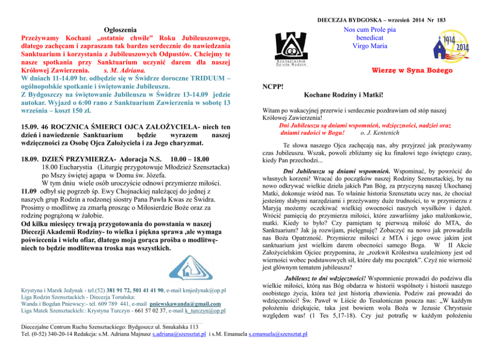 DIECEZJA BYDGOSKA – wrzesień 2014 Nr 183 Ogłoszenia Przeżywamy Kochani „ostatnie chwile” Roku Jubileuszowego, dlatego zachęcam i zapraszam tak bardzo serdecznie do nawiedzania Sanktuarium i korzystania z Jubileuszowych Odpustów. Chciejmy te nasze spotkania przy Sanktuarium uczynić darem dla naszej Królowej Zawierzenia. s. M. Adriana. W dniach 11-14.09 br. odbędzie się w Świdrze doroczne TRIDUUM – ogólnopolskie spotkanie i świętowanie Jubileuszu. Z Bydgoszczy na świętowanie Jubileuszu w Świdrze 13-14.09 jedzie autokar. Wyjazd o 6:00 rano z Sanktuarium Zawierzenia w sobotę 13 września – koszt 150 zł. 15.09. 46 ROCZNICA ŚMIERCI OJCA ZAŁOŻYCIELA- niech ten dzień i nawiedzenie Sanktuarium będzie wyrazem naszej wdzięczności za Osobę Ojca Założyciela i za Jego charyzmat. 18.09. DZIEŃ PRZYMIERZA- Adoracja N.S. 10.00 – 18.00 18.00 Eucharystia (Liturgię przygotowuje Młodzież Szensztacka) po Mszy świętej agapa w Domu św. Józefa. W tym dniu wiele osób uroczyście odnowi przymierze miłości. 11.09 odbył się pogrzeb śp. Ewy Chojnackiej należącej do jednej z naszych grup Rodzin a rodzonej siostry Pana Pawła Kwas ze Świdra. Prosimy o modlitwę za zmarłą prosząc o Miłosierdzie Boże oraz za rodzinę pogrążoną w żałobie. Od kilku miesięcy trwają przygotowania do powstania w naszej Diecezji Akademii Rodziny- to wielka i piękna sprawa ,ale wymaga poświecenia i wielu ofiar, dlatego moja gorąca prośba o modlitwęniech to będzie modlitewna troska nas wszystkich. Krystyna i Marek Jedynak - tel.(52) 381 91 72, 501 41 41 90, e-mail [email protected] Liga Rodzin Szensztackich - Diecezja Toruńska: Wanda i Bogdan Pniewscy:- tel. 609 789 441, e-mail [email protected] Liga Matek Szensztackich:: Krystyna Turczyn - 661 57 02 37, e-mail [email protected] Nos cum Prole pia benedicat Virgo Maria Wierzę w Syna Bożego NCPP! Kochane Rodziny i Matki! Witam po wakacyjnej przerwie i serdecznie pozdrawiam od stóp naszej Królowej Zawierzenia! Dni Jubileuszu są dniami wspomnień, wdzięczności, nadziei oraz dniami radości w Bogu! o. J. Kentenich Te słowa naszego Ojca zachęcają nas, aby przyjrzeć jak przeżywamy czas Jubileuszu. Wszak, powoli zbliżamy się ku finałowi tego świętego czasy, kiedy Pan przechodzi... Dni Jubileuszu są dniami wspomnień. Wspominać, by powrócić do własnych korzeni! Wracać do początków naszej Rodziny Szensztackiej, by na nowo odkrywać wielkie dzieła jakich Pan Bóg, za przyczyną naszej Ukochanej Matki, dokonuje wśród nas. To właśnie historia Szensztatu uczy nas, że chociaż jesteśmy słabymi narzędziami i przeżywamy duże trudności, to w przymierzu z Maryją możemy oczekiwać wielkiej owocności naszych wysiłków i dążeń. Wrócić pamięcią do przymierza miłości, które zawarliśmy jako małżonkowie, matki. Kiedy to było? Czy pamiętam tę pierwszą miłość do MTA, do Sanktuarium? Jak ją rozwijam, pielęgnuję? Zobaczyć na nowo jak prowadziła nas Boża Opatrzność. Przymierze miłości z MTA i jego owoc jakim jest sanktuarium jest wielkim darem obecności samego Boga. W II Akcie Założycielskim Ojciec przypomina, że „rozkwit Królestwa uzależniony jest od wierności wobec podstawowych sił, które dały mu początek”. Czyż nie wierność jest głównym tematem jubileuszu? Jubileusz to dni wdzięczności! Wspomnienie prowadzi do podziwu dla wielkie miłości, którą nas Bóg obdarza w historii wspólnoty i historii naszego osobistego życia, która też jest historią zbawienia. Podziw zaś prowadzi do wdzięczności! Św. Paweł w Liście do Tesaloniczan poucza nas: „W każdym położeniu dziękujcie, taka jest bowiem wola Boża w Jezusie Chrystusie względem was! (1 Tes 5,17-18). Czy już potrafię w każdym położeniu ___________________________________________________________________________________________________________________________________________________________ Diecezjalne Centrum Ruchu Szensztackiego: Bydgoszcz ul. Smukalska 113 Tel. (0-52) 340-20-14 Redakcja: s.M. Adriana Majnusz [email protected] i s.M. Emanuela [email protected] DIECEZJA BYDGOSKA – wrzesień 2014 Nr 183 dziękować? Kiedy jest mi najtrudniej? Dziękując świadczę o Wielkości Boga! Uwielbiam Go! Jest to najbardziej bezinteresowna modlitwa. Czy często czynię ją sposobem mojego kontaktu z Panem Bogiem, Maryją – naszą Panią i Królową? Jubileusz to dni nadziei, bo kontemplacja wierności Boga daje nadzieję na jutro! “Chętnie zamieszkam wśród was, będę rozdawała obficie dary i łaski, pociągnę ku sobie młodzieńcze serca” – Maryja i dziś jest wierna swojej obietnicy, to jest źródło naszej nadziei! Św. Jan Paweł II ujął tę prawdę w krótkim zdaniu: "Pamięć o przeszłości oznacza zaangażowanie w przyszłość." Również moje zaangażowanie w przyszłość! Dni Jubileuszu są dniami radości w Bogu. Nadzieja płynąca z doświadczenia Bożej obecności rodzi głęboką radość. Psalmista podpowiada: ”Raduj się w Panu, a On spełni pragnienia twego serca!” (Ps 37,4). Czego pragnie moje serce? Czy tego, co Serce Jezusowe, co Niepokalane Serce Maryi? Właśnie przy tych Sercach trzeba mi obiektywizować moje pragnienia, tęsknoty, aby dojść do takiego zjednoczenia, o którym nasz Ojciec mówi: trzy serca, a jedno uderzenie. Jubileusz jest czasem łaski. Kairos – czas przejścia Pana, który nasyca nasze serca swoją łaską. Sanktuarium szensztackie jest miejscem szczególnej łaski, ale teraz w czasie jubileuszu możemy również doświadczyć w nim łaski odpustu zupełnego pod zwykłymi warunkami. Odpust zupełny jest wielkim darem Kościoła św., niecodziennym przywilejem, jest darowaniem kary doczesnej, którą musimy odpokutować albo w na tym świecie, albo w czyśćcu. Możemy ofiarować go za siebie, lub za zmarłych. Zachęcam do możliwie częstego nawiedzania Sanktuarium Zawierzenia, aby i na nas mogły spełniać się słowa Pana Je