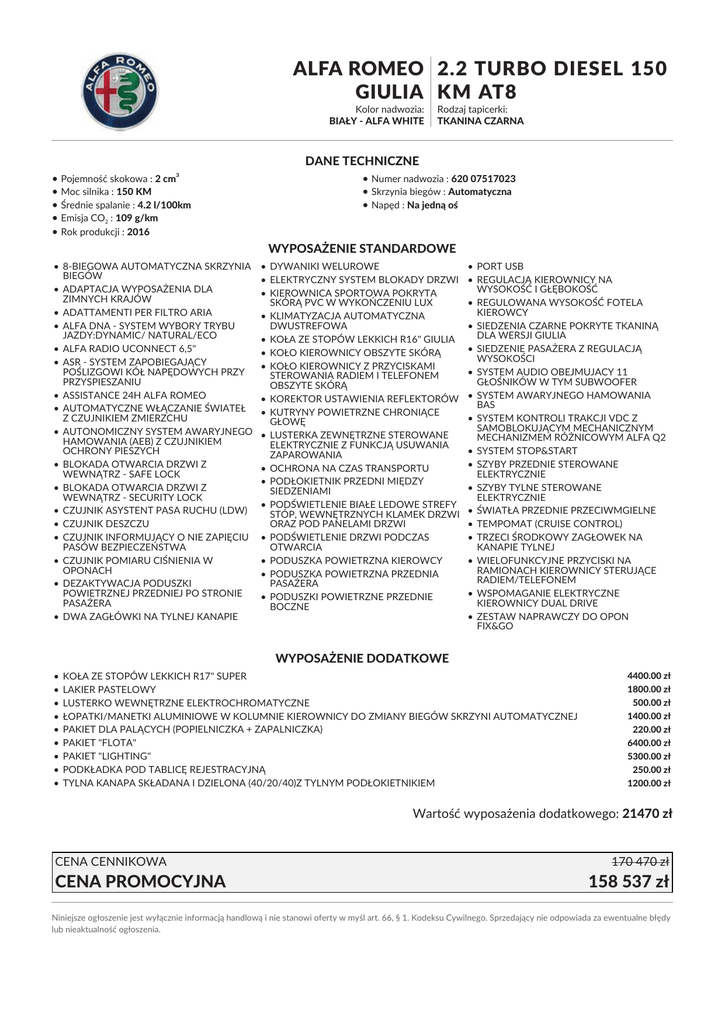 ALFA ROMEO 2.2 TURBO DIESEL 150 GIULIA KM AT8 Kolor nadwozia: BIAŁY - ALFA WHITE Rodzaj tapicerki: TKANINA CZARNA DANE TECHNICZNE • Pojemność skokowa : 2 cm • Moc silnika : 150 KM • Średnie spalanie : 4.2 l/100km • Emisja CO2 : 109 g/km • Rok produkcji : 2016 3 • Numer nadwozia : 620 07517023 • Skrzynia biegów : Automatyczna • Napęd : Na jedną oś WYPOSAŻENIE STANDARDOWE • 8-BIEGOWA AUTOMATYCZNA SKRZYNIA BIEGÓW • ADAPTACJA WYPOSAŻENIA DLA ZIMNYCH KRAJÓW • ADATTAMENTI PER FILTRO ARIA • ALFA DNA - SYSTEM WYBORY TRYBU JAZDY:DYNAMIC/ NATURAL/ECO • ALFA RADIO UCONNECT 6,5" • ASR - SYSTEM ZAPOBIEGAJĄCY POŚLIZGOWI KÓŁ NAPĘDOWYCH PRZY PRZYSPIESZANIU • ASSISTANCE 24H ALFA ROMEO • AUTOMATYCZNE WŁĄCZANIE ŚWIATEŁ Z CZUJNIKIEM ZMIERZCHU • AUTONOMICZNY SYSTEM AWARYJNEGO HAMOWANIA (AEB) Z CZUJNIKIEM OCHRONY PIESZYCH • BLOKADA OTWARCIA DRZWI Z WEWNĄTRZ - SAFE LOCK • BLOKADA OTWARCIA DRZWI Z WEWNĄTRZ - SECURITY LOCK • CZUJNIK ASYSTENT PASA RUCHU (LDW) • CZUJNIK DESZCZU • CZUJNIK INFORMUJĄCY O NIE ZAPIĘCIU PASÓW BEZPIECZEŃSTWA • CZUJNIK POMIARU CIŚNIENIA W OPONACH • DEZAKTYWACJA PODUSZKI POWIETRZNEJ PRZEDNIEJ PO STRONIE PASAŻERA • DWA ZAGŁÓWKI NA TYLNEJ KANAPIE • DYWANIKI WELUROWE • ELEKTRYCZNY SYSTEM BLOKADY DRZWI • KIEROWNICA SPORTOWA POKRYTA SKÓRĄ PVC W WYKOŃCZENIU LUX • KLIMATYZACJA AUTOMATYCZNA DWUSTREFOWA • KOŁA ZE STOPÓW LEKKICH R16" GIULIA • KOŁO KIEROWNICY OBSZYTE SKÓRĄ • KOŁO KIEROWNICY Z PRZYCISKAMI STEROWANIA RADIEM I TELEFONEM OBSZYTE SKÓRĄ • KOREKTOR USTAWIENIA REFLEKTORÓW • KUTRYNY POWIETRZNE CHRONIĄCE GŁOWĘ • LUSTERKA ZEWNĘTRZNE STEROWANE ELEKTRYCZNIE Z FUNKCJĄ USUWANIA ZAPAROWANIA • OCHRONA NA CZAS TRANSPORTU • PODŁOKIETNIK PRZEDNI MIĘDZY SIEDZENIAMI • PODŚWIETLENIE BIAŁE LEDOWE STREFY STÓP, WEWNĘTRZNYCH KLAMEK DRZWI ORAZ POD PANELAMI DRZWI • PODŚWIETLENIE DRZWI PODCZAS OTWARCIA • PODUSZKA POWIETRZNA KIEROWCY • PODUSZKA POWIETRZNA PRZEDNIA PASAŻERA • PODUSZKI POWIETRZNE PRZEDNIE BOCZNE • PORT USB • REGULACJA KIEROWNICY NA WYSOKOŚĆ I GŁĘBOKOŚĆ • REGULOWANA WYSOKOŚĆ FOTELA KIEROWCY • SIEDZENIA CZARNE POKRYTE TKANINĄ DLA WERSJI GIULIA • SIEDZENIE PASAŻERA Z REGULACJĄ WYSOKOŚCI • SYSTEM AUDIO OBEJMUJACY 11 GŁOŚNIKÓW W TYM SUBWOOFER • SYSTEM AWARYJNEGO HAMOWANIA BAS • SYSTEM KONTROLI TRAKCJI VDC Z SAMOBLOKUJĄCYM MECHANICZNYM MECHANIZMEM RÓŻNICOWYM ALFA Q2 • SYSTEM STOP&START • SZYBY PRZEDNIE STEROWANE ELEKTRYCZNIE • SZYBY TYLNE STEROWANE ELEKTRYCZNIE • ŚWIATŁA PRZEDNIE PRZECIWMGIELNE • TEMPOMAT (CRUISE CONTROL) • TRZECI ŚRODKOWY ZAGŁOWEK NA KANAPIE TYLNEJ • WIELOFUNKCYJNE PRZYCISKI NA RAMIONACH KIEROWNICY STERUJĄCE RADIEM/TELEFONEM • WSPOMAGANIE ELEKTRYCZNE KIEROWNICY DUAL DRIVE • ZESTAW NAPRAWCZY DO OPON FIX&GO WYPOSAŻENIE DODATKOWE • • • • • • • • • KOŁA ZE STOPÓW LEKKICH R17" SUPER LAKIER PASTELOWY LUSTERKO WEWNĘTRZNE ELEKTROCHROMATYCZNE ŁOPATKI/MANETKI ALUMINIOWE W KOLUMNIE KIEROWNICY DO ZMIANY BIEGÓW SKRZYNI AUTOMATYCZNEJ PAKIET DLA PALĄCYCH (POPIELNICZKA + ZAPALNICZKA) PAKIET "FLOTA" PAKIET "LIGHTING" PODKŁADKA POD TABLICĘ REJESTRACYJNĄ TYLNA KANAPA SKŁADANA I DZIELONA (40/20/40)Z TYLNYM PODŁOKIETNIKIEM 4400.00 zł 1800.00 zł 500.00 zł 1400.00 zł 220.00 zł 6400.00 zł 5300.00 zł 250.00 zł 1200.00 zł Wartość wyposażenia dodatkowego: 21470 zł CENA CENNIKOWA CENA PROMOCYJNA 170 470 zł 158 537 zł Niniejsze ogłoszenie jest wyłącznie informacją handlową i nie stanowi oferty w myśl art. 66, § 1. Kodeksu Cywilnego. Sprzedający nie odpowiada za ewentualne błędy lub nieaktualność ogłoszenia.