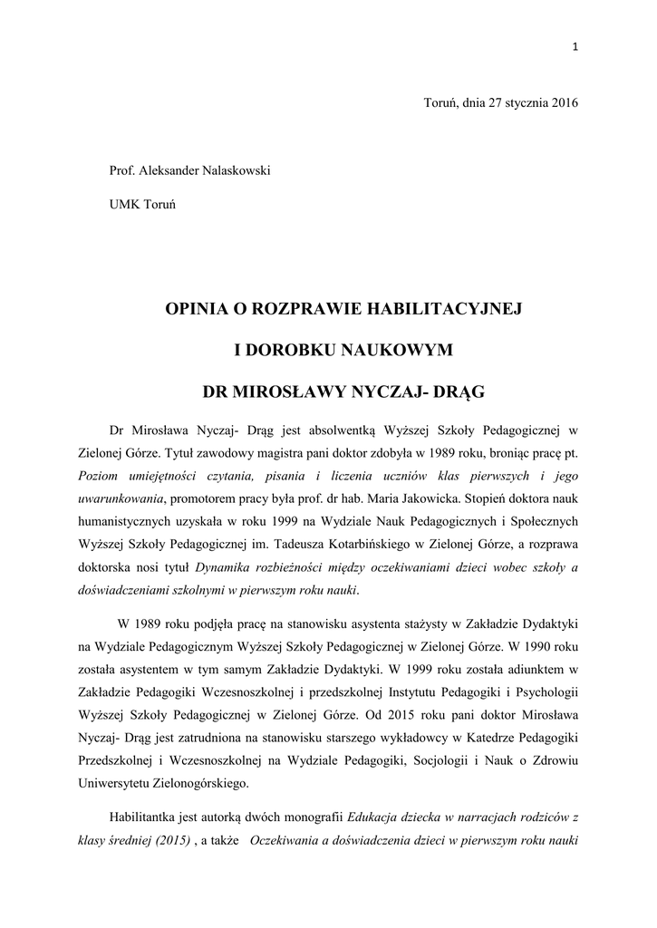 1 Toruń, dnia 27 stycznia 2016 Prof. Aleksander Nalaskowski UMK Toruń OPINIA O ROZPRAWIE HABILITACYJNEJ I DOROBKU NAUKOWYM DR MIROSŁAWY NYCZAJ- DRĄG Dr Mirosława Nyczaj- Drąg jest absolwentką Wyższej Szkoły Pedagogicznej w Zielonej Górze. Tytuł zawodowy magistra pani doktor zdobyła w 1989 roku, broniąc pracę pt. Poziom umiejętności czytania, pisania i liczenia uczniów klas pierwszych i jego uwarunkowania, promotorem pracy była prof. dr hab. Maria Jakowicka. Stopień doktora nauk humanistycznych uzyskała w roku 1999 na Wydziale Nauk Pedagogicznych i Społecznych Wyższej Szkoły Pedagogicznej im. Tadeusza Kotarbińskiego w Zielonej Górze, a rozprawa doktorska nosi tytuł Dynamika rozbieżności między oczekiwaniami dzieci wobec szkoły a doświadczeniami szkolnymi w pierwszym roku nauki. W 1989 roku podjęła pracę na stanowisku asystenta stażysty w Zakładzie Dydaktyki na Wydziale Pedagogicznym Wyższej Szkoły Pedagogicznej w Zielonej Górze. W 1990 roku została asystentem w tym samym Zakładzie Dydaktyki. W 1999 roku została adiunktem w Zakładzie Pedagogiki Wczesnoszkolnej i przedszkolnej Instytutu Pedagogiki i Psychologii Wyższej Szkoły Pedagogicznej w Zielonej Górze. Od 2015 roku pani doktor Mirosława Nyczaj- Drąg jest zatrudniona na stanowisku starszego wykładowcy w Katedrze Pedagogiki Przedszkolnej i Wczesnoszkolnej na Wydziale Pedagogiki, Socjologii i Nauk o Zdrowiu Uniwersytetu Zielonogórskiego. Habilitantka jest autorką dwóch monografii Edukacja dziecka w narracjach rodziców z klasy średniej (2015) , a także Oczekiwania a doświadczenia dzieci w pierwszym roku nauki 2 (2001) oraz 9 artykułów. Jest współredaktorem 8 opracowań zbiorowych, a także autorką 43 rozdziałów w pracach zbiorowych. Pani doktor Mirosława Nyczaj- Drąg podaje, iż w latach 2001- 2015 pod jej kierunkiem powstało ponad sto prac licencjackich oraz 70 prac dyplomowych słuchaczy studiów podyplomowych. Realizuje zajęcia dydaktyczne z teoretycznych podstaw pedagogiki wczesnoszkolnej, pedagogiki wczesnoszkolnej z metodyką, edukacji polonistycznej, matematycznej i społeczno- przyrodniczej. Jest autorką programu podyplomowych studiów opiekunek dziecięcych, podyplomowych studiów myślenia twórczego i technik przyspieszonego uczenia się oraz autorką programu i kierownikiem podyplomowych studiów Pedagogika Marii Montessori i Plan Daltoński. Jest członkiem Polskiego Komitetu Światowej Organizacji Wychowania Przedszkolnego OMEP oraz Towarzystwa Przyjaciół Dzieci, jest również członkiem Polskiego Towarzystwa Dysleksji, a także opiekunem Studenckiego Koła Przyjaciół Dzieci. W 2002 roku otrzymała nagrodę Rektora UZ za osiągnięcia w pracy naukowo- badawczej, a w roku 2013 nagrodę zespołową III stopnia Rektora UAM. Habilitantka organizowała szkolenia dla nauczycieli wczesnej edukacji, dyrektorów szkół i pedagogów szkolnych na temat Rodzice w szkole, seminaria i prelekcje dla rodziców i nauczycieli, razem ze studentami prowadzi warsztaty tematyczne dla dzieci przedszkolnych i wczesnoszkolnych. Współpracowała z Nadleśnictwem Lubsko w realizacji projektu edukacji przyrodniczej dzieci wczesnoszkolnych z wykorzystaniem ścieżek dydaktycznych. W 2012 roku w ramach programu Erasmus pani doktor Mirosław Nyczaj- Drąg prowadziła wykłady dla studentów w Hradec Kralove. Od 2011 roku współpracuje z Ukraińskim Komitetem OMEP, tematyka współpracy to: Edukacja dzieci przedszkolnych i wczesnoszkolnych w Polsce i na Ukrainie, dzięki temu uczestniczyła w dwóch międzynarodowych konferencjach ( w roku 2013 i 2014). Brała również udział w międzynarodowym seminarium naukowo- praktycznym pod tytułem Wpływ środowiska na rozwój psychiczny dziecka. Habilitantka współpracowała także z Fundacją Dalton International z Zwolle w Holandii. W ramach współpracy wzięła udział w konferencji szkoleniowej Koncepcja edukacji szkół daltońskich jako przykład pracy z dziećmi o zróżnicowanych możliwościach(2011). Zorganizowano międzynarodową konferencję Edukacja dziecka 3 według planu daltońskiego w teorii i praktyce. Wzięła również udział w konferencji i szkoleniu pod tytułem Let's get inspired by Dalton. Pani doktor w latach 2001- 2015 wzięła udział w 29 konferencjach naukowych, w 2007 roku kierowała projektem Wczesne selekcje społeczno-szkolne. Studium porównawcze dwóch pierwszych klas, a w roku 2011 była głównym wykonawcą projektu Doświadczenia edukacyjne i zawodowe nauczycieli wczesnej edukacji. Studium autobiografii Monografia zatytułowana „Edukacja dziecka w narracjach rodziców z klasy średniej” stanowi główne dzieło zgłoszonego do oceny przez panią Doktor Mirosławę Nyczaj- Drąg dorobku mającego stanowić podstawę do nadania jej stopnia doktora habilitowanego. Na samym wstępie przyznać muszę, że jest to praca wyjątkowa i w pełni potwierdzająca habilitacyjne aspiracje kandydatki. Rozprawa wychodzi z określonego założenia brzmiącego następująco „problematyka niniejszej książki wiąże się z tezą, że biografia edukacyjna dzieci jest uzależniona nie tyle od ich kompetencji intelektualnych (zdolności i motywacji- o czym mówi zasada merytokracji), ile przede wszystkim od habitusu klasowego, ekonomicznego, społecznego i kulturowego rodziny”. Jest to oczywiste nawiązanie do tez Pierre’a Bourdieu, którego postać i prace przewijają się na niemal wszystkich stronach książki. Po pewnym czasie tej lektury dochodzi się do wniosku, że doktor Nyczaj- Drąg niepotrzebnie asekuruje się postacią wybitnego socjologa, gdyż jej wiedza i kompetencje intelektualne czynią z niej potencjalnego twórcę oryginalnej i własnej teorii. Zwłaszcza, że przekonuje o tym sama konstrukcja książki, będąca w dużej mierze wykładem typologicznym. Autorka odwołała się do trzech mocnych kategorii pedagogicznych i socjologicznych. Pierwszą z nich jest „edukacja dziecka”, a więc
