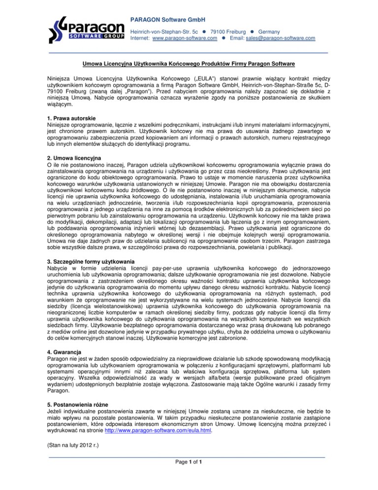 PARAGON Software GmbH Heinrich-von-Stephan-Str. 5c 79100 Freiburg Germany Internet: www.paragon-software.com Email: [email protected] Umowa Licencyjna Użytkownika Końcowego Produktów Firmy Paragon Software Niniejsza Umowa Licencyjna Użytkownika Końcowego („EULA”) stanowi prawnie wiążący kontrakt między użytkownikiem końcowym oprogramowania a firmą Paragon Software GmbH, Heinrich-von-Stephan-Straße 5c, D79100 Freiburg (zwaną dalej „Paragon”). Przed nabyciem oprogramowania należy zapoznać się dokładnie z niniejszą Umową. Nabycie oprogramowania oznacza wyrażenie zgody na poniższe postanowienia ze skutkiem wiążącym. 1. Prawa autorskie Niniejsze oprogramowanie, łącznie z wszelkimi podręcznikami, instrukcjami i/lub innymi materiałami informacyjnymi, jest chronione prawem autorskim. Użytkownik końcowy nie ma prawa do usuwania żadnego zawartego w oprogramowaniu zabezpieczenia przed kopiowaniem ani informacji o prawach autorskich, numeru rejestracyjnego lub innych elementów służących do identyfikacji programu. 2. Umowa licencyjna O ile nie postanowiono inaczej, Paragon udziela użytkownikowi końcowemu oprogramowania wyłącznie prawa do zainstalowania oprogramowania na urządzeniu i użytkowania go przez czas nieokreślony. Prawo użytkowania jest ograniczone do kodu obiektowego oprogramowania. Prawo to ustaje w momencie naruszenia przez użytkownika końcowego warunków użytkowania ustanowionych w niniejszej Umowie. Paragon nie ma obowiązku dostarczenia użytkownikowi końcowemu kodu źródłowego. O ile nie postanowiono inaczej w niniejszym dokumencie, nabycie licencji nie uprawnia użytkownika końcowego do udostępniania, instalowania i/lub uruchamiania oprogramowania na wielu urządzeniach jednocześnie, tworzenia i/lub rozpowszechniania kopii oprogramowania, przenoszenia oprogramowania z jednego urządzenia na inne za pomocą środków elektronicznych lub za pośrednictwem sieci po pierwotnym pobraniu lub zainstalowaniu oprogramowania na urządzeniu. Użytkownik końcowy nie ma także prawa do modyfikacji, dekompilacji, adaptacji lub lokalizacji oprogramowania lub łączenia go z innym oprogramowaniem, lub poddawania oprogramowania inżynierii wtórnej lub dezasemblacji. Prawo użytkowania jest ograniczone do określonego oprogramowania nabytego w określonej wersji i nie obejmuje kolejnych wersji oprogramowania. Umowa nie daje żadnych praw do udzielania sublicencji na oprogramowanie osobom trzecim. Paragon zastrzega sobie wszystkie dalsze prawa, w szczególności prawa do rozpowszechniania, powielania i publikacji. 3. Szczególne formy użytkowania Nabycie w formie udzielenia licencji pay-per-use uprawnia użytkownika końcowego do jednorazowego uruchomienia lub użytkowania oprogramowania; dalsze użytkowanie oprogramowania nie jest dozwolone. Nabycie oprogramowania z zastrzeżeniem określonego okresu ważności kontraktu uprawnia użytkownika końcowego jedynie do użytkowania oprogramowania do momentu upływu danego okresu ważności kontraktu. Nabycie licencji technika uprawnia użytkownika końcowego do użytkowania oprogramowania na różnych systemach, pod warunkiem że oprogramowanie nie jest wykorzystywane na wielu systemach jednocześnie. Nabycie licencji dla siedziby (licencja wielostanowiskowa) uprawnia użytkownika końcowego do użytkowania oprogramowania na nieograniczonej liczbie komputerów w ramach określonej siedziby firmy, podczas gdy nabycie licencji dla firmy uprawnia użytkownika końcowego do użytkowania oprogramowania na wszystkich komputerach we wszystkich siedzibach firmy. Użytkowanie bezpłatnego oprogramowania dostarczanego wraz prasą drukowaną lub pobranego z mediów online jest dozwolone jedynie w przypadku prywatnego użytku, chyba że oddzielna umowa o użytkowaniu do celów komercyjnych stanowi inaczej. Użytkowanie komercyjne jest zabronione. 4. Gwarancja Paragon nie jest w żaden sposób odpowiedzialny za nieprawidłowe działanie lub szkodę spowodowaną modyfikacją oprogramowania lub użytkowaniem oprogramowania w połączeniu z konfiguracjami sprzętowymi, platformami lub systemami operacyjnymi innymi niż zalecana lub właściwa konfiguracja sprzętowa, platforma lub system operacyjny. Wszelka odpowiedzialność za wady w wersjach alfa/beta (wersje publikowane przed oficjalnym wydaniem) udostępnionych bezpłatnie zostaje wyłączona. Zastosowanie mają także Ogólne warunki i zasady firmy Paragon. 5. Postanowienia różne Jeżeli indywidualne postanowienia zawarte w niniejszej Umowie zostaną uznane za nieskuteczne, nie będzie to miało wpływu na pozostałe postanowienia. W takim przypadku nieskuteczne postanowienie zostanie zastąpione postanowieniem, które odpowiada interesom ekonomicznym stron Umowy. Umowę licencyjną można przejrzeć i wydrukować na stronie http://www.paragon-software.com/eula.html. (Stan na luty 2012 r.) Page 1 of 1