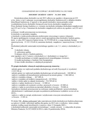 UZASADNIENIE DO UCHWAŁY BUDŻETOWEJ NA 2015 ROK DOCHODY BUDŻETU GMINY NA 2015 ROK. Konstrukcja planu dochodów na rok 2015 odbywa się zgodnie z dyspozycją art.235 u.f.p., który w ust.1 nakazuje wyszczególnienie dochodów budżetowych w układzie działów klasyfikacji budżetowej. Z ujętych w ten sposób dochodów muszą ponadto zostać wyodrębnione kwoty dochodów bieżących oraz kwoty dochodów majątkowych. Przez dochody bieżące budżetu j.s.t. rozumie się dochody niebędące dochodami majątkowymi (art.235 ust.2 u.f.p.). Natomiast do dochodów majątkowych zalicza się zgodnie z art.235 ust.3 u.f.p. : a) dotacje i środki przeznaczone na inwestycje, b) dochody ze sprzedaży majątku, c) dochody z tytułu przekształcenia użytkowania wieczystego w prawo własności. W ujęciu spełniającym wymogi ustawy został sporządzony plan dochodów budżetu gminy, który w roku 2015 stanowić będzie kwotę 16 579 995,60 zł, z czego dochody bieżące stanowią kwotę 15 335 152,60 zł, natomiast dochody majątkowe stanowią kwotę 1 244 843 zł. Dochodami jednostki samorządu terytorialnego zgodnie z art. 3.1. ustawy o dochodach j.s.t są: 1) dochody własne, 2) subwencja ogólna, 3) dotacje celowe z budżetu państwa, oraz zgodnie z art.3.3 ustawy o dochodach j.s.t dochodami j.s.t mogą być : 1) środki pochodzące ze źródeł zagranicznych niepodlegające zwrotowi, 2) środki pochodzące z budżetu Unii Europejskiej, 3) inne środki określone w odrębnych przepisach.. W grupie dochodów własnych największą pozycję stanowią : udziały gminy we wpływach podatku dochodowego od osób fizycznych w wysokości 2 235 338 zł, udziały gminy we wpływach podatku dochodowego od osób prawnych – 160 000 zł, wpływy z podatku od nieruchomości położonych na terenie gminy – 1 062 600 zł, wpływy z podatku rolnego - 667 400 zł, wpływy z podatku od środków transportowych - 165 903zł, wpłaty z tytułu opłat za odpady komunalne - 516 585,60 zł, wpływy z opłaty skarbowej w kwocie - 12 000 zł, wpływy z podatku od czynności cywilno- prawnych w kwocie - 43 000 zł, wpływy z opłat za zezwolenia na sprzedaż alkoholu w kwocie - 70 000 zł, kierunkowe dochody przeznaczone na realizacje zadań profilaktyki i przeciwdziałania alkoholizmowi i narkomanii przyjęte na podstawie preliminarza wydatków na ten cel na 2015r., wpływy z opłat za zarząd, użytkowanie i użytkowanie wieczyste nieruchomości w kwocie - 3 585 zł. W dziale 758 „Różne rozliczenia” jako największym dziale dochodowym budżetu planowane są wpływy z tytułu subwencji ogólnej dla gminy na 2015 rok w wielkości, które zostały ustalone według zasad określonych w ustawie z dnia 13 listopada 2003 r. o dochodach jednostek samorządu terytorialnego i zostały zawarte w załączniku do pisma Ministra Finansów Nr ST3/4820/16/2014 z dnia 10 października 2014r. Podstawą do ustalenia wysokości kwoty podstawowej stanowiły dane ze sprawozdań z wykonania dochodów podatkowych gminy za 2013 rok oraz dane o liczbie mieszkańców według stanu na dzień 31 grudnia 2013r., ustalonej przez Główny Urząd Statystyczny. Część oświatowa subwencji ogólnej naliczana jest dla każdej jednostki samorządu terytorialnego. Naliczenia subwencji dokonano na podstawie projektu rozporządzenia ministra Edukacji Narodowej w sprawie sposobu podziału części oświatowej subwencji ogólnej dla jednostek samorządu terytorialnego w roku 2015. Wielkość części oświatowej subwencji ogólnej na 2015 rok wynosi 4 649 574 zł i podobnie jak w przypadku pozostałych subwencji może ulegać korektom (w praktyce - najczęściej zmniejszającym) po ostatecznym ustaleniu globalnej kwoty przeznaczonej na subwencje oświatowe ujęte w budżecie państwa. Część wyrównawcza subwencji . Za podstawę wyliczeń subwencji wyrównawczej przyjmowane są dane I półrocza roku poprzedzającego rok budżetowy na podstawie sprawozdania j.s.t o dochodach z (uwzględnieniem) doliczeniem zastosowanych przez gminę ulg, umorzeń, zwolnień oraz skutków (różnicy stawek) obniżenia przez gminę górnych stawek podatków. Planowana wielkość subwencji wyrównawczej dla Gminy Lądek na rok 2015 wynosi 2 552 744 zł. Wielkość ta może podlegać modyfikacjom w korelacji z ostatecznymi wielkościami w Budżecie Państwa. W drugim co do wielkości wpływów budżetowych, dziale 756 „Dochody od osób prawnych, od osób fizycznych i innych jednostek nie posiadających osobowości prawnej „ realizowane są różne podatki i opłaty, którym podlegają osoby prawne i osoby fizyczne oraz jednostki nie posiadające osobowości prawnej. Dochody z tego tytułu zaplanowane zostały w oparciu o przewidywane wykonanie w bieżącym roku i z uwzględnieniem skutków podjętych uchwał rady gminy dotyczących określenia stawek podatków na 2015 rok, tak więc wpływy z podatku od nieruchomości zaplanowano ze wzrostem o 0,4%, wpływy podatku od środków transportowych na poziomie roku bieżącego, gdyż stawki nie zostały zmienione uchwałą rady natomiast wpływy z podatku rolnego zaplanowano na poziomie o 10 % niższym od planowanych wpływów w bieżącym roku, ze względu na obniżenie stawki do wymiaru podatku rolnego o ok.10 % w stosunku do wielkości stawki na rok 2014. W załączniku do pisma Ministra Finansów podana jest również informacja o planowanych dochodach z tytułu udziału gmin we wpływach z podatku dochodowego od osób fizycznych i ma ona charakter informacyjno-szacunkowy, ponieważ dochody podatkowe planowane są w budżecie państwa na podstawie szacunków i prognoz. Realizacja tych dochodów może ulec zwiększeniu lub zmniejszeniu w porównaniu z planem, z powodów , na które Minister Finansów nie ma bezpośredniego wpływu. W związku z powyższym, faktyczne dochody gminy z tego tytułu mogą być zatem większe lub mniejsze od tych wielkości, które wynikają z informacji podanej przez Ministra Finansów. Du