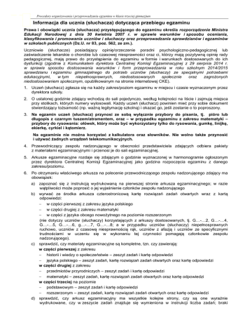 30 Procedury organizowania i przeprowadzania egzaminu w klasie trzeciej gimnazjum 9. Informacja dla ucznia (słuchacza) dotycząca przebiegu egzaminu Prawa i obowiązki ucznia (słuchacza) przystępującego do egzaminu określa rozporządzenie Ministra Edukacji Narodowej z dnia 30 kwietnia 2007 r. w sprawie warunków i sposobu oceniania, klasyfikowania i promowania uczniów i słuchaczy oraz przeprowadzania sprawdzianów i egzaminów w szkołach publicznych (Dz.U. nr 83, poz. 562, ze zm.). Uczniowie (słuchacze) posiadający opinię/orzeczenie poradni psychologiczno-pedagogicznej lub zaświadczenie lekarskie o chorobie lub czasowej niesprawności oraz ci, którzy mają pozytywną opinię rady pedagogicznej, mają prawo do przystąpienia do egzaminu w formie i warunkach dostosowanych do ich dysfunkcji (zgodnie z Komunikatem dyrektora Centralnej Komisji Egzaminacyjnej z 29 sierpnia 2014 r. w sprawie sposobu dostosowania warunków i form przeprowadzania w roku szkolnym 2014/2015 sprawdzianu i egzaminu gimnazjalnego do potrzeb uczniów (słuchaczy) ze specjalnymi potrzebami edukacyjnymi, w tym niepełnosprawnych, niedostosowanych społecznie oraz zagrożonych niedostosowaniem społecznym, opublikowanym na stronie internetowej CKE). 1. Uczeń (słuchacz) zgłasza się na każdy zakres/poziom egzaminu w miejscu i czasie wyznaczonym przez dyrektora szkoły. 2. O ustalonej godzinie zdający wchodzą do sali pojedynczo, według kolejności na liście i zajmują miejsca przy stolikach, których numery wylosowali. Każdy uczeń (słuchacz) powinien mieć przy sobie dokument stwierdzający tożsamość (np. ważną legitymację szkolną) i okazać go, jeśli zostanie o to poproszony. 3. Na egzamin uczeń (słuchacz) przynosi ze sobą wyłącznie przybory do pisania, tj. pióro lub długopis z czarnym tuszem/atramentem, oraz – w przypadku egzaminu z zakresu matematyki – przybory do rysowania: ołówek, który może być wykorzystany tylko do rysowania, gumkę, linijkę, ekierkę, cyrkiel i kątomierz. Na egzaminie nie można korzystać z kalkulatora oraz słowników. Nie wolno także przynosić i używać żadnych urządzeń telekomunikacyjnych. 4. Przewodniczący zespołu nadzorującego w obecności przedstawiciela zdających odbiera pakiety z materiałami egzaminacyjnymi i przenosi je do sali egzaminacyjnej. 5. Arkusze egzaminacyjne rozdaje się zdającym o godzinie wyznaczonej w harmonogramie ogłoszonym przez dyrektora Centralnej Komisji Egzaminacyjnej jako godzina rozpoczęcia egzaminu z danego zakresu/poziomu. 6. Po otrzymaniu właściwego arkusza na polecenie przewodniczącego zespołu nadzorującego zdający ma obowiązek: a) zapoznać się z instrukcją wydrukowaną na pierwszej stronie arkusza egzaminacyjnego; w razie wątpliwości może poprosić o jej wyjaśnienie członków zespołu nadzorującego b) wyrwać ze środka arkusza czterostronicową kartę rozwiązań zadań otwartych wraz z kartą odpowiedzi: w części pierwszej z zakresu języka polskiego w części drugiej z zakresu matematyki w części z języka obcego nowożytnego na poziomie rozszerzonym (nie dotyczy uczniów (słuchaczy) korzystających z arkuszy dostosowanych, tj. G…-…2, G…-…4, G…-…5, G…-…6, g…-…7, G…-…8; a w przypadku uczniów (słuchaczy) niepełnosprawnych ruchowo, uczniów z czasową niesprawnością rąk, uczniów z afazją i uczniów ze specyficznymi trudnościami w uczeniu się w wykonaniu tej czynności pomagają członkowie zespołu nadzorującego). c) sprawdzić, czy materiały egzaminacyjne są kompletne, tzn. czy zawierają: w części pierwszej z zakresu historii i wiedzy o społeczeństwie – zeszyt zadań i kartę odpowiedzi języka polskiego – zeszyt zadań, kartę rozwiązań zadań otwartych oraz kartę odpowiedzi w części drugiej z zakresu przedmiotów przyrodniczych – zeszyt zadań i kartę odpowiedzi matematyki – zeszyt zadań, kartę rozwiązań zadań otwartych oraz kartę odpowiedzi w części trzeciej na poziomie podstawowym – zeszyt zadań i kartę odpowiedzi rozszerzonym – zeszyt zadań, kartę rozwiązań zadań otwartych oraz kartę odpowiedzi d) sprawdzić, czy arkusz egzaminacyjny ma wszystkie kolejne strony, czy są one wyraźnie wydrukowane, czy w zeszycie zadań znajduje się wymieniona w instrukcji liczba zadań; braki Procedury organizowania i przeprowadzania egzaminu w klasie trzeciej gimnazjum 31 powinien natychmiast zgłosić przewodniczącemu zespołu nadzorującego, a po otrzymaniu kompletnego arkusza – potwierdzić jego odbiór czytelnym podpisem w odpowiednim miejscu protokołu przebiegu danego zakresu/poziomu egzaminu e) sprawdzić poprawność numeru PESEL na naklejce przygotowanej przez OKE, zapisać swój trzyznakowy kod, numer PESEL oraz umieścić naklejki przygotowane przez OKE w wyznaczonych miejscach (w przypadku uczniów (słuchaczy) korzystających z arkuszy dostosowanych, tj. G...-…2, G...-…4, G...-…5, G...-…6, G...-…7, G...-…8 oraz uczniów (słuchaczy) niepełnosprawnych ruchowo, uczniów (słuchaczy) z czasową niesprawnością rąk, uczniów (słuchaczy) z afazją i uczniów (słuchaczy) ze specyficznymi trudnościami w uczeniu się czynności związane z kodowaniem wykonują członkowie zespołu nadzorującego). 7. Czas przeznaczony na rozwiązywanie zadań liczy się od momentu zapisania na tablicy (planszy) godziny rozpoczęcia pracy i wynosi odpowiednio: a) w części humanistycznej: arkusz egzaminacyjny z historii i wiedzy o społeczeństwie – 60 minut; w przypadku uczniów (słuchaczy), dla których czas trwania egzaminu może być przedłużony – nie więcej niż 80 minut arkusz egzaminacyjny z języka polskiego – 90 minut; w przypadku uczniów (słuchaczy), dla których czas trwania egzaminu może być przedłużony – nie więcej niż 135 minut b) w części matematyczno-przyrodniczej: arkusz egzaminacyjny z przedmiotów przyrodniczych – 60 minut; w przypadku uczniów (słuchaczy), dla 