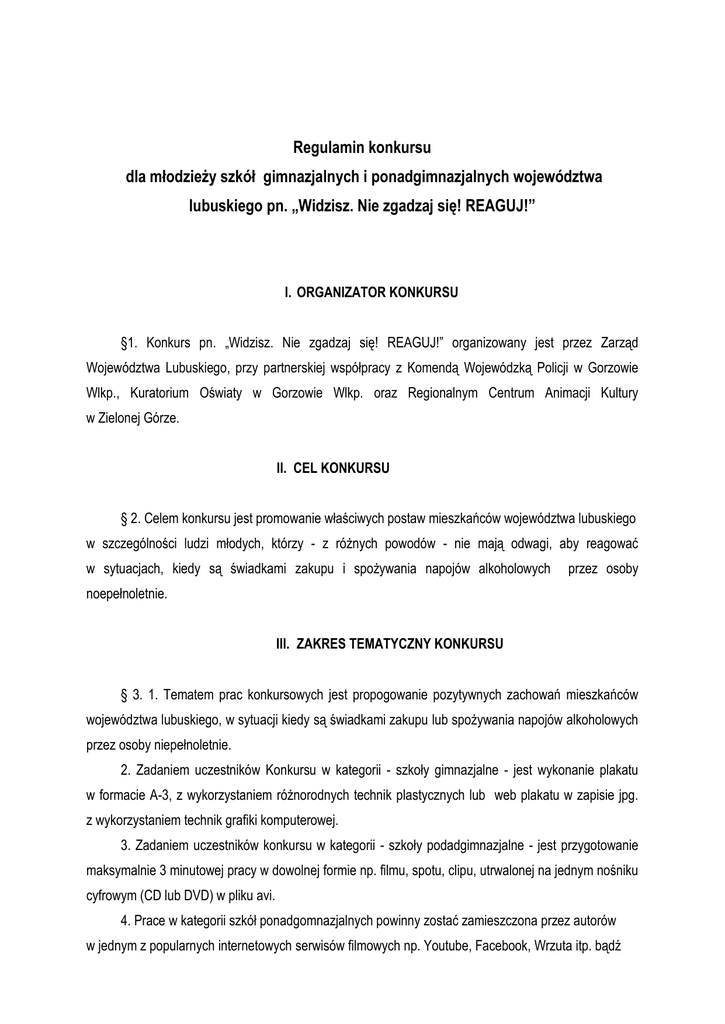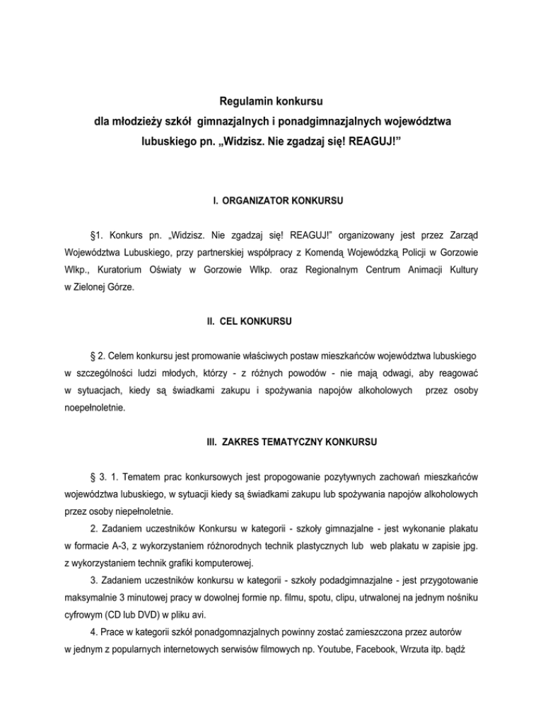 Regulamin konkursu dla młodzieży szkół gimnazjalnych i ponadgimnazjalnych województwa lubuskiego pn. „Widzisz. Nie zgadzaj się! REAGUJ!” I. ORGANIZATOR KONKURSU §1. Konkurs pn. „Widzisz. Nie zgadzaj się! REAGUJ!” organizowany jest przez Zarząd Województwa Lubuskiego, przy partnerskiej współpracy z Komendą Wojewódzką Policji w Gorzowie Wlkp., Kuratorium Oświaty w Gorzowie Wlkp. oraz Regionalnym Centrum Animacji Kultury w Zielonej Górze. II. CEL KONKURSU § 2. Celem konkursu jest promowanie właściwych postaw mieszkańców województwa lubuskiego w szczególności ludzi młodych, którzy - z różnych powodów - nie mają odwagi, aby reagować w sytuacjach, kiedy są świadkami zakupu i spożywania napojów alkoholowych przez osoby noepełnoletnie. III. ZAKRES TEMATYCZNY KONKURSU § 3. 1. Tematem prac konkursowych jest propogowanie pozytywnych zachowań mieszkańców województwa lubuskiego, w sytuacji kiedy są świadkami zakupu lub spożywania napojów alkoholowych przez osoby niepełnoletnie. 2. Zadaniem uczestników Konkursu w kategorii - szkoły gimnazjalne - jest wykonanie plakatu w formacie A-3, z wykorzystaniem różnorodnych technik plastycznych lub web plakatu w zapisie jpg. z wykorzystaniem technik grafiki komputerowej. 3. Zadaniem uczestników konkursu w kategorii - szkoły podadgimnazjalne - jest przygotowanie maksymalnie 3 minutowej pracy w dowolnej formie np. filmu, spotu, clipu, utrwalonej na jednym nośniku cyfrowym (CD lub DVD) w pliku avi. 4. Prace w kategorii szkół ponadgomnazjalnych powinny zostać zamieszczona przez autorów w jednym z popularnych internetowych serwisów filmowych np. Youtube, Facebook, Wrzuta itp. bądź innych stronach www. Ponadto w formularzu karty zgłoszeniowej powinien zostać umieszczony link umożliwiającyjej wyświetlenie. IV. UCZESTNICY KONKURSU § 4.1. Adresatami bezpośrednimi Konkursu są uczniowie szkół gimnazjalnych i ponadgimnazjalnych województwa lubuskiego, realizujący naukę w systemie dziennym. Pośrednimi adresatami są mieszkańcy województwa lubuskiego. 2. Prace konkursowe w kategorii – szkoły gimnazjalne – są pracami indywidualnymi. 3. Prace konkursowe kategorii – szkoły ponadgimnazjalne – są pracami zespołowymi – max do 3 osób. 4. Prace konkursowe wykonywane są pod kierunkliem nauczyciela/opiekuna. 5. Każdy uczestnik/zespół może zgłosić tylko 1 pracę. 6. Nie ogranicza się ilości uczestników/zespołów z danej szkoły, 1 opiekun może jednocześnie nadzorować pracę kilku uczestników/zespołów. V. TERMINARZ KONKURSU § 5. 1. Zgłoszenia będą przyjmowane w terminie od dnia ogłoszenia na stronie internetowej www.lubuskie.pl do 15 listopada 2016 r. włącznie (decyduje data stempla pocztowego). 2. Prace należy przesłać lub dostarczyć do Departamentu Infrastruktury Społecznej Urzędu Marszałkowskiego Województwa Lubuskiego, ul. Podgórna 7, 65-057 Zielona Góra. Na kopercie musi być dopisek „Praca na konkurs Widzisz. Nie zgadzaj się! REAGUJ!” 3. Ogłoszenie wyników nastąpi w grudniu 2016 roku. VI. WARUNKI UCZESTNICTWA W KONKURSIE § 6.1. Warunkiem uczestnictwa w Konkursie jest nadesłanie pracy wraz z formularzem zgłoszenia, który określa załącznik nr 1 Regulaminu. 2. Dodatkowym warunkiem uczestnictwa w Konkursie osoby niepełnoletniej jest wyrażenie zgody przedstawiciela ustawowego, według wzoru określonego w załączniku nr 2 Regulaminu. 3. Przesłanie pracy konkursowej jest równoznaczne z wyrażeniem zgody na przetwarzanie swoich danych osobowych na potrzeby organizacji i promocji konkursu. W przypadku uczestników, którzy nie ukończyli 18- tego roku życia, zgodę wyrażają ich opiekunowie prawni. Osobom wyrażającym zgodę przysługuje prawo wglądu do przekazanych danych oraz do ich poprawienia, a także ewentualnego usunięcia. 4. Udział w Konkursie oraz podanie przez uczestników danych osobowych (imię, nazwisko, data urodzenia, adres e-mail, telefon) są całkowicie dobrowolne. VII. KRYTERIA OCENY KOMISJI KONKURSOWEJ § 7.1. Praca konkursowa aby spełnić wymogi formalne – musi mieć formę: - w kategorii – szkoły gmimnazjalne: a) web plakatu z wykorzystaniem nowoczesnych grafik komputerowych – nagrany na płycie CD lub DVD w pliku jpg. lub b) plakatu w wersji papierowej w formacie A-3, wykonanego dowolną techniką. - w kategorii – szkoły ponadgimnazjalne - maksymalnie 3 minutowej pracy w dowolnej formie np. filmu, spotu, clipu, utrwalonej na jednym nośniku cyfrowym (CD lub DVD) w pliku avi. 2. Do pracy musi być dołączony wypełniony formularz zgłoszeniowy, którego wzór określa załącznik nr 1 do Regulaminu. 3. Przy ocenie prac będą brane pod uwagę: a) zgodność pracy z tematem konkursu, b) siła przekazu, c) pomysłowość, d) estetyka pracy. 4. Wszystkie prace będą oceniane przez Komisję Konkursową powołaną przez organizatora w dwóch kategoriach: szkoły gimnazjalne i szkoły ponadgimnazjalne. Decyzja Komisji jest ostateczna i nie przysługuje od niej odwołanie. 5. Nadesłane prace nie będą zwracane uczestnikom Konkursu. Organizator zastrzega sobie prawo do ich częściowej lub całościowej publikacji. 6. Prace lub ich fragmenty mogą być wykorzystywane przez organizatora do prezentowania w publikacjach internetowych oraz w telewizji. 7. Złożenie pracy konkursowej oznacza wyrażenie przez uczestników konkursu zgody na jej nieodpłatną publikację. 8. Organizator nie zwraca uczestnikom Konkursu kosztów związanych ze zgłoszeniem prac. VIII. NAGRODY § 8.1. Autorzy najlepszych prac w kategorii szkół gimnazjalnych i szkół ponadgimnazjalnych otrzymają nagrody rzeczowe indywidualne. 2. Uroczyste wręczenie nagród oraz prezentacja prac odbędzie się podczas uroczystości podsumowania Konkursu, o terminie której laureaci zostaną indywidualnie poinformowani. IX. OŚWIADCZENIA O PRAWACH AUTORSKICH § 9.1. Nadesłanie zgłoszenia konkursowego jest równoznaczne z udzieleniem organizat