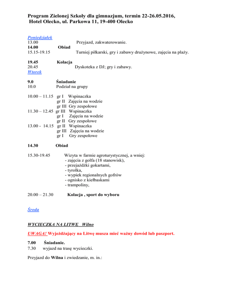 Program Zielonej Szkoły dla gimnazjum, termin 22-26.05.2016, Hotel Olecko, ul. Parkowa 11, 19-400 Olecko Poniedziałek 13.00 14.00 15.15-19.15 Przyjazd, zakwaterowanie. Obiad Turniej piłkarski, gry i zabawy drużynowe, zajęcia na plaży. 19.45 20.45 Wtorek Kolacja 9.0 10.0 Śniadanie Podział na grupy Dyskoteka z DJ; gry i zabawy. 10.00 – 11.15 gr I gr II gr III 11.30 – 12.45 gr III gr I gr II 13.00 - 14.15 gr II gr III gr I 14.30 Wspinaczka Zajęcia na wodzie Gry zespołowe Wspinaczka Zajęcia na wodzie Gry zespołowe Wspinaczka Zajęcia na wodzie Gry zespołowe Obiad 15.30-19.45 20.00 – 21.30 Wizyta w farmie agroturystycznej, a wniej: - zajęcia z golfa (18 stanowisk), - przejażdżki gokartami, - tyrolka, - wypiek regionalnych gofrów - ognisko z kiełbaskami - trampoliny, Kolacja , sport do wyboru Środa WYCIECZKA NA LITWĘ Wilno UWAGA! Wyjeżdżający na Litwę musza mieć ważny dowód lub paszport. 7.00 7.30 Śniadanie. wyjazd na trasę wycieczki. Przyjazd do Wilna i zwiedzanie, m. in.: Kościół Piotra i Pawła na Antokolu – z fundacji Michała Paca, zbudowany na wzór bazyliki watykańskiej, z wyposażeniem w rzeźby stiukowe. Cmentarz na Rossie z pochówkami osób zasłużonych dla historii i kultury polskiej, litewskiej i białoruskiej, w tym grób „Matka i serce Syna”. Przerwa na posiłek Po przerwie dalszy ciąg zwiedzania: Ostra Brama – „litewska Częstochowa” - kaplica z obrazem Matki Boskiej Ostrobramskiej; Starówka Wileńska – jedna z największych i najpiękniejszych w tej części Europy; Cerkiew św. Ducha - ze szczątkami świętych prawosławnych; Pomnik Adama Mickiewicza; Katedra ś. ś. Stanisława i Władysława z fundacji Władysława Jagiełły z kaplicą Św. Kazimierza; wejście na Wzgórze Giedymina i/lub wjazd na Wzgórze Trzech Krzyży. Ok. 17.00 wyjazd w drogę powrotną do Polski. Ok. 21.00 powrót do obiektu noclegowego, obiadokolacja i nocleg. Czwartek 8.00 Śniadanie 10.00 – 12.00 Przejazd w kierunku Suwalskiego Parku Krajobrazowego i zwiedzanie Głazowiska Bachanowo /największe nagromadzenie głazów narzutowych/ oraz jeziora Hańcza 108,5 m, najgłębsze jezioro w Polsce. Zdobycie Góry Cisowej. Suchy prowiant w trakcie zwiedzania. 13.00-16.00 Muzeum Wigier – Wigierski Park Narodowy Rejs łodzią z przeszklonym dnem po jeziorze Wigry. Historia regionu, lekcja muzealna: -bóbr i jego rodzinka. -nie tylko wilk i zając – zwierzęta WPN. -podwodni mieszkańcy - ryby WPN. -ćwirek i przyjaciele – ptaki WPN. -żyjmy z przyrodą w zgodzie - formy ochrony przyrody w Polsce. -badamy wigierską wodę - czy w jej kropli coś żyje? -wyprawa do lasu w parku narodowym. 18.00 Obiadokolacja 19.00 – 21.00 Turniej gier zespołowych. Piątek 9.00 Śniadanie (dodatkowo zabieramy suchy prowiant) 10.00 Rozdanie nagród W Warszawie jesteśmy około 16.00