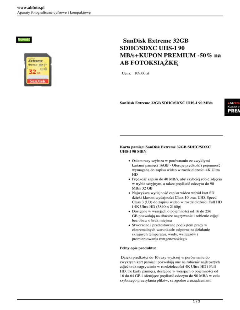 www.abfoto.pl Aparaty fotograficzne cyfrowe i kompaktowe SanDisk Extreme 32GB SDHC/SDXC UHS-I 90 MB/s+KUPON PREMIUM -50% na AB FOTOKSIĄŻKĘ Cena: 109.00 zł SanDisk Extreme 32GB SDHC/SDXC UHS-I 90 MB/s Karta pamięci SanDisk Extreme 32GB SDHC/SDXC UHS-I 90 MB/s Osiem razy szybsza w porównaniu ze zwykłymi kartami pamięci 16GB - Oferuje prędkość i pojemność wymaganą do zapisu wideo w rozdzielczości 4K Ultra HD Prędkość zapisu do 40 MB/s, aby szybciej robić zdjęcia w trybie seryjnym, a także prędkość odczytu do 90 MB/s 32 GB Najwyższa wydajność zapisu wideo wśród kart SD dzięki klasom wydajności Class 10 oraz UHS Speed Class 3 (U3) do zapisu wideo w rozdzielczości Full HD i 4K Ultra HD (3840 × 2160p) Dostępne w wersjach o pojemności od 16 do 256 GB pozwalają na dłuższe nagrywanie i robienie zdjęć bez obaw o brak miejsca Stworzone i przetestowane pod kątem pracy w ekstremalnych warunkach; odporne na działanie skrajnych temperatur, wody, wstrząsów i promieniowania rentgenowskiego Pełny opis produktu: Dzięki prędkości do 10 razy wyższej w porównaniu do zwykłych kart pamięci pozwalają one na robienie najlepszych zdjęć oraz nagrywanie w rozdzielczości 4K Ultra HD i Full HD. Te karty pamięci, dostępne w wersjach o pojemności od 16 do 64 GB i oferujące prędkość odczytu do 90 MB/s w celu szybszego przesyłania plików, są zgodne z urządzeniami 1/3 www.abfoto.pl Aparaty fotograficzne cyfrowe i kompaktowe wspierającymi standard SDHC lub SDXC i objęte dożywotnią gwarancją. Karty UHS Speed Class 3 (U3) oferują wyjątkowo wysoką prędkość, która pozwala na korzystanie z najnowszego standardu rozdzielczości. Funkcje i zalety: Ekstremalna wydajność podczas robienia zdjęcia po zdjęciu dzięki prędkości zapisu do 40 MB/s [16-64 GB] Wysoka prędkość przenoszenia plików (do 90 MB/s) Klasy prędkości Class 10 + UHS Speed Class 3 (U3) umożliwiające nagrywanie w rozdzielczości Full HD (1080p) i 4K Ultra HD (3840 x 2160p) Dostępne w wersjach o pojemności od 16 do 256 GB Odporne na działanie wody, skrajnych temperatur, promieniowania rentgenowskiego oraz wstrząsów Wyprodukowane z wykorzystaniem interfejsu o wysokiej szybkości UHS-I Dożywotnia gwarancja Wykorzystaj w pełni swoje urządzenie Nie przegap żadnej chwili Zyskaj większą wydajność, by móc fotografować szybkie akcje i zapisywać wiele klatek na sekundę. Te karty oferują prędkość, jakiej potrzebujesz, aby zrobić więcej zdjęć w trybie seryjnym. Idealny partner Twojego aparatu Zwykłe karty mogą nie nadążać za możliwościami współczesnych zaawansowanych aparatów. Od zaufanego lidera w dziedzinie pamięci flash Od ponad 25 lat SanDisk jest producentem pamięci flash. Nasze karty oferują niezawodność i ekstremalną wydajność, której zaufali zarówno profesjonaliści, jak i zwykli klienci. Dane techniczne: Wydajność/prędkość: odczyt do 90 MB/s i zapis do 40 MB/s [16-64 GB] Wymiary karty: 24 mm × 32 mm × 2,1 mm Temperatura działania: od -25oC do 85oC Temperatura przechowywania: od -40oC do 85oC Zgodność: zgodne z wszystkimi urządzeniami obsługującymi standardy SDHC, SDXC, SDHC UHS i SDXC UHS Ochrona: Wbudowany przełącznik ochrony przed zapisem zapobiega przypadkowemu usunięciu danych Oferta na pobranie oprogramowania do odzyskiwania danych RescuePRO Etykieta umożliwiająca podpisanie w celu łatwiejszej identyfikacji i organizacji Etui Jewel Case chroni karty podczas przechowywania i archiwizowania Dożywotnia gwarancja 2/3 www.abfoto.pl Aparaty fotograficzne cyfrowe i kompaktowe Pomimo dołożenia wszelkich starań oraz zachowania należytej staranności nie możemy zagwarantować, iż prezentowane opisy wraz ze zdjęciami produktów są w pełni zgodne ze specyfikacją producenta i stanem faktycznym. Jednocześnie zastrzegamy sobie prawo do błędów i nie ponosimy odpowiedzialności za błędne podanie parametrów produktów, które mogą być podstawą do ewentualnych roszczeń. W razie jakichkolwiek wątpliwości lub chęci uzyskania dodatkowych informacji prosimy o kontakt z działem handlowym lub weryfikację w oparciu o stronę producenta. 3/3 Powered by TCPDF (www.tcpdf.org)