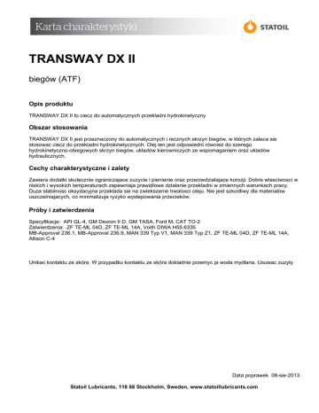 TRANSWAY DX II biegów (ATF) Opis produktu TRANSWAY DX II to ciecz do automatycznych przekladni hydrokinetyczny Obszar stosowania TRANSWAY DX II jest przeznaczony do automatycznych i recznych skrzyn biegów, w których zaleca sie stosowac ciecz do przekladni hydrokinetycznych. Olej ten jest odpowiedni równiez do szeregu hydrokinetyczno-obiegowych skrzyn biegów, ukladów kierowniczych ze wspomaganiem oraz ukladów hydraulicznych. Cechy charakterystyczne i zalety Zawiera dodatki skutecznie ograniczajace zuzycie i pienienie oraz przeciwdzialajace korozji. Dobre wlasciwosci w niskich i wysokich temperaturach zapewniaja prawidlowe dzialanie przekladni w zmiennych warunkach pracy. Duza stabilnosc oksydacyjna przeklada sie na zwiekszenie trwalosci oleju. Nie jest szkodliwy dla materialów uszczelniajacych, co minimalizuje ryzyko wystepowania przecieków. Próby i zatwierdzenia Specyfikacje: API GL-4, GM Dexron II D, GM TASA, Ford M, CAT TO-2 Zatwierdzenia: ZF TE-ML 04D, ZF TE-ML 14A, Voith DIWA H55.6335 MB-Approval 236.1, MB-Approval 236.9, MAN 339 Typ V1, MAN 339 Typ Z1, ZF TE-ML 04D, ZF TE-ML 14A, Allison C-4 Unikac kontaktu ze skóra. W przypadku kontaktu ze skóra dokladnie przemyc ja woda mydlana. Usuwac zuzyty Data poprawek 08-sie-2013 Statoil Lubricants, 118 88 Stockholm, Sweden, www.statoillubricants.com Dane charakterystyczne Charakterystyka Jednostki Metoda mPas ASTM D 2983 868.9 194 kg/m3 °C ISO 12185 -52 37.5 7.49 172 °C mm² / s mm² / s - ISO 3016 ISO 3104 ISO 3104 ISO 2909 Brookfielda w temperaturze -40°C (COC) Data poprawek 08-sie-2013 Statoil Lubricants, 118 88 Stockholm, Sweden, www.statoillubricants.com