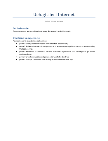 UsługisieciInternet dr inż. Piotr Bubacz Cel ćwiczenie: Celem ćwiczenia jest przedstawienie usług dostępnych w sieci Internet. Uzyskane kompetencje Po zrealizowaniu tego ćwiczenia będziesz: • potrafił założyć konto Microsoft wraz z kontem pocztowym; • potrafił dodawać kontakty do swojej sieci oraz przesyłać pocztę elektroniczną za pomocą usługi Outlook on-line; • potrafił korzystać z kalendarza on-line, dodawać wydarzenia oraz udostępniać go innym użytkownikom; • potrafił przechowywać i udostępniać pliki w usłudze SkyDrive • potrafił tworzyć i edytować dokumenty w usłudze Office Web App. Usługi sieci Internet dr inż. Piotr Bubacz Przygotowanie do ćwiczenia: Ze względu na ograniczoną liczbę osób, które mogą założyć konto LiveID z jednego adresu IP w ciągu 24h niezbędne jest abyś założył to konto zanim przystąpisz do realizacji ćwiczenia. W tym celu w przeglądarce wpisz adres http://outlook.com. Następnie kliknij na link umieszczony po prawej stronie: Utwórz konto teraz. Na kolejnej stronie wpisz wymagane dane Strona 2 Usługi sieci Internet dr inż. Piotr Bubacz Pamiętaj, aby podać co najmniej dwie metody odzyskiwania hasła – inne konto pocztowe, pytanie bezpieczeństwa lub numer telefonu komórkowego. Po wciśnięciu przycisku Akceptuję na dole strony podaj znaki bezpieczeństwa i ponownie wciśnij Akceptuję Po poprawnym podaniu znaków bezpieczeństwa zostaniesz przeniesiony do Twojej skrzynki odbiorczej. Strona 3 Usługi sieci Internet dr inż. Piotr Bubacz Wprowadzenie teoretyczne Windows Live, pakiet bezpłatnych usług internetowych oferowanych przez Microsoft. Na całym świecie z jego usług korzysta ponad 500mln użytkowników. Usługa Microsoft Account – konto Microsoft Microsoft Account (dawniej Windows Live ID) to ogólnodostępny, jednolity system, umożliwiający dowolnym użytkownikom korzystanie ze wszystkich stron Microsoft, wymagających logowania. Każdy zarejestrowany użytkownik otrzymuje swój indywidualny identyfikator, który pomaga mu w poruszaniu się po wszystkich zasobach Microsoft, na całym świecie. Outlook on-line Outlook on-line to platforma grupująca w jednym miejscu zasoby internetowe: wiadomości e-mail, kalendarze, kontakty, funkcje ochrony przed spamem itd. Każdy użytkownik usługi otrzymuje przestrzeń magazynową o wielkości 7 GB. Ze skrzynki odbiorczej usługi Hotmail możliwy jest dostęp do innych kont poczty e-mail. Program Poczta usługi Windows Live ułatwia dostęp do skrzynki pocztowej w systemie Windows. Usługa Windows Live Kalendarz Usługa umożliwia planowanie terminów, wydarzeń i spotkań, tworzenie listy zadania do wykonania, ustawianie przypomnienia i udostępnianie kalendarza innym osobom, aby mogli korzystać z informacji o Twojej dostępności. Strona kalendarza zawiera kilka elementów. Strona 4 Usługi sieci Internet dr inż. Piotr Bubacz Element oznaczony 1 zawiera menu umożliwiające: • • • • dodanie nowego Wydarzenia, Zadania do wykonania, Urodzin lub Kalendarz (Nowy); usunięcie zaznaczonego element (Usuń); subskrypcję – połączenie z kalendarzem innego użytkownika (Subskybuj); udostępnienie kalendarza innym użytkownikom (Udostępnij); • • • wydruk aktualnego wyglądu kalendarza ( ); przejście do daty dzisiejszej (Dzisiaj); przesunięcie o kolejne 4 tygodnie (Następne 4 tygodnie). Element oznaczony 2 umożliwia szybkie przejście do wybranej daty. Element oznaczony 3 umożliwia zarządzanie kalendarzami – włączanie, wyłączanie, edycję oraz dodawanie nowego kalendarza. Na początku dodane są trzy kalendarze: • • • kalendarz główny użytkownika; kalendarz zawierający polskie święta; kalendarz, do którego dodawane będą informację o urodzinach. Element 4 zawiera pole wyświetlające kalendarz w wybranym przez użytkownika widoku (dnia, tygodnia, miesiąca lub listy zadań do wykonania). Dodanie nowego Wydarzenia Po wybraniu z menu górnego kalendarza (obszar 1) Nowy, a następnie Wydarzenie na stronie pojawi się okno Dodaj wydarzenie. W polu Co: określamy nazwę wydarzenia, która będzie wyświetlana w kalendarzu, w polu Gdzie określamy miejsce wydarzenia w liście rozwijanej Kalendarz wybieramy kalendarz do którego to wydarzenie zostanie dodane, w polu początek i koniec określamy datę i godzinę rozpoczęcia (jeśli wydarzenie jest całodniowe należy zaznaczyć opcję Cały dzień, a następnie wskazać datę rozpoczęcia i zakończenia). Strona 5 Usługi sieci Internet dr inż. Piotr Bubacz Jeśli chcemy dodać więcej informacji do zdarzenia należy klikną na odnośniku Dodaj więcej szczegółów. Na nowej stronie można dodatkowo: • określić, czy zdarzenie ma być prywatne (opcja ma znaczenie w przypadku udostępniania kalendarza); • wybrać znaczek, jaki będzie wyświetlany w widoku kalendarza; • ustalić cykl zdarzenia – co jaki czas następuje (codziennie, co tydzień, co miesiąc i co rok), od kiedy do kiedy występuje lub ile razy; • określić kiedy ma zostać przesłane przypomnienie; • zaprosić inne osoby do uczestniczenia w wydarzeniu. Usługa SkyDrive W usłudze SkyDrive możemy przechowywać do 7GB danych. Strona 6 Usługi sieci Internet dr inż. Piotr Bubacz Przebieg laboratorium Ćwiczenie 1 W tym ćwiczeniu nauczysz się korzystać z kalendarza Windows Live. Dodasz zdarzenie cykliczne – spotkanie (na śniadanie) z wybraną przez Ciebie osobą na stołówce od 9 do 10 w każdy poniedziałek i wtorek przez najbliższe 10 tygodni. 1. Jeśli jesteś nie jesteś zalogowany, to wykonaj krok 1 w ćwiczeniu 1. 2. W menu na górze strony wybierz Więcej, a następnie Kalendarz Przy pierwszym uruchomieniu usługi należy określić strefę czasową kalendarza. Należy wybrać (GMT+01:00) Sarajewo, Skopie, Warszawa, Zagrzeb, a następnie wcisnąć przycisk Przejdź do swojego kalendarza. Strona 7 Usługi sieci Internet dr inż. Piotr Bubacz 3. Z menu powyżej kalen