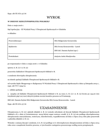 Sygn. akt III AUa 37/16 WYROK W IMIENIU RZECZYPOSPOLITEJ POLSKIEJ Dnia 11 maja 2016 r. Sąd Apelacyjny - III Wydział Pracy i Ubezpieczeń Społecznych w Gdańsku w składzie: Przewodniczący: SSA Małgorzata Gerszewska Sędziowie: SSA Iwona Krzeczowska - Lasoń SSO del. Danuta Szykut (spr.) Protokolant: stażysta Anita Musijowska po rozpoznaniu w dniu 11 maja 2016 r. w Gdańsku sprawy A. B. (1) i A. B. (2) przeciwko Zakładowi Ubezpieczeń Społecznych Oddział w B. o ustalenie obowiązku ubezpieczenia na skutek apelacji Zakładu Ubezpieczeń Społecznych Oddział w B. od wyroku Sądu Okręgowego w Bydgoszczy VI Wydział Pracy i Ubezpieczeń Społecznych z dnia 13 listopada 2015 r., sygn. akt VI U 1354/15 1. oddala apelację; 2. zasądza od Zakładu Ubezpieczeń Społecznych Oddział w B. na rzecz A. B. (1) i A. B. (2) kwoty po 135,00 (sto trzydzieści pięć 00/100) złotych tytułem zwrotu kosztów procesu za II instancję. SSO del. Danuta Szykut SSA Małgorzata Gerszewska SSA Iwona Krzeczowska - Lasoń Sygn. akt III AUa 37/16 UZASADNIENIE Ubezpieczona A. B. (2) i płatnik składek A. B. (1) wniosły odwołanie od decyzji Zakładu Ubezpieczeń Społecznych Oddział w B. z dnia 27 kwietnia2015r. mocą której organ rentowy orzekł, iż A. B. (2) nie podlega obowiązkowemu ubezpieczeniu emerytalnemu, rentowym, chorobowemu, wypadkowemu od dnia 11 lipca 2014 roku jako pracownik u płatnika składek A. B. (1). Wniosły o zmianę decyzji i ustalenie, iż A. B. (2) podlega w/w obowiązkowym ubezpieczeniom od dnia 11 lipca 2014 roku oraz o zasądzenie kosztów procesu, w tym kosztów zastępstwa procesowego według norm przepisanych. Pozwany organ rentowy – Zakład Ubezpieczeń Społecznych Oddział w B. - wniósł o oddalenie odwołania wskazując, że w związku ze złożonym przez ubezpieczoną A. B. (2) wnioskiem o zasiłek chorobowy przeprowadził postępowanie wyjaśniające. Wyniki kontroli skutkowały wydaniem zaskarżonej decyzji albowiem w ocenie organu rentowego stosunek pracy pomiędzy A. B. (2) i A. B. (1) faktycznie nie został nawiązany, a zgłoszenie jej do ubezpieczeń społecznych miało na celu wyłącznie uzyskanie świadczeń z ZUS. Sąd Okręgowy w Bydgoszczy VI Wydział Pracy i Ubezpieczeń Społecznych wyrokiem z dnia 13 listopada 2015 roku, sygn. akt VI U 1354/15 zmienił zaskarżoną decyzję w ten sposób, że odwołująca A. B. (2) jako pracownik u płatnika składek A. B. (1) podlega obowiązkowo ubezpieczeniom: emerytalnemu, rentowym, chorobowemu i wypadkowemu od dnia 11 lipca 2014 roku (punkt pierwszy), zasądził od Zakładu Ubezpieczeń Społecznych Oddział w B. na rzecz odwołujących A. B. (1) i A. B. (2) kwoty po 120 zł tytułem zwrotu kosztów zastępstwa prawnego (punkt drugi). Powyższe rozstrzygnięcie Sąd Okręgowy oparł na następujących ustaleniach i rozważaniach. Odwołująca A. B. (1) prowadzi działalność gospodarczą pod nazwą " Biuro (...)", w ramach której zajmuje się obsługą księgową innych podmiotów. Jednocześnie jest zatrudniona na podstawie umowy o pracę w pełnym wymiarze czasu pracy na stanowisku wiceprezesa Spółki (...) SA w B., z tego tytułu uzyskuje wynagrodzenie w kwocie 15.000 złotych miesięcznie. Od 1 kwietnia 2014 roku została zatrudniona na podstawie umowy o pracę na 1/4 etatu na stanowisku głównej księgowej za wynagrodzeniem w wysokości 2.000 złotych, w Spółce (...) Spółce z o.o., powiązanej ze Spółką (...) SA. W związku z podjęciem dodatkowego zatrudnienia i brakiem możliwości czasowych równoczesnego, rzetelnego zajmowania się obsługą klientów w ramach prowadzonej przez siebie firmy, zdecydowała się zatrudnić swoją siostrzenicę A. B. (2). Umowę o pracę strony zawarły w dniu 11 lipca 2014 roku. A. B. (2) została zatrudniona na 1/2 etatu za wynagrodzeniem w wysokości 2.000 złotych miesięcznie. Do jej zadań należało wprowadzanie danych księgowych klientów obsługiwanych przez firmę (...), wprowadzenie faktur i tego typu czynności księgowe. Wyżej wymieniona świadczyła pracę w swoim domu, przy pomocy udostępnionego jej przez pracodawcę komputera, popołudniami, to jest po powrocie do domu jej matki, która przejmowała wówczas zajmowanie się małym dzieckiem odwołującej. Równolegle do zatrudnienia u A. B. (1), A. B. (2) formalnie pozostawała zatrudniona w firmie (...), na stanowisku dyspozytora, korzystając jednak w tej firmie z urlopu wychowawczego. Praca na tym stanowisku w firmie (...) była pracą zmianową. O tym, że znajduje się w ciąży odwołująca dowiedziała się podczas pobytu u lekarza w dniu dwudziestym trzecim lipca 2014 roku. Wcześniej, mimo że ostatnią miesiączkę miała pod koniec maja, nie przypuszczała, że może być w ciąży, z uwagi na nieregularność cyklu, występujące co półtora lub 2 miesiące miesiączki oraz na przekonanie, iż utrudnionym jest zajście w ciążę, w trakcie karmienia piersią dziecka. Od 1 września 2014 roku A. B. (2) stała się niezdolna do pracy. Wynagrodzenie chorobowe od dnia 3 października 2014 roku wypłacił jej pracodawca, czyli A. B. (1), następnie wypłaty zasiłku chorobowego w okresie od 5 października 2014 do 24 lutego 2015 oraz wypłatę zasiłku macierzyńskiego od dnia urodzenia dziecka, to jest od 25 lutego 2015 przejął ZUS. W miejsce odwołującej po jej przejściu na zwolnienie lekarskie, A. B. (1) od dnia 17 listopada 2014 roku zatrudniła na 1/4 etatu za wynagrodzeniem w wysokości 1.000 złotych J. P., która zajmowała się tego samego rodzaju czynnościami księgowymi, co ubezpieczona, czyli wprowadzała dane z dokumentów do systemu komputerowego (...) 2. J. P. wykonywała pracę do 30 kwietnia 2015 roku, po czym ze względów zdrowotnych z niej zrezygnowała. Taki stan faktyczny Sąd ustalił na podstawie umów o pracę odwołującej oraz umów o pracę A. B. (3), znajdujących się w ich aktach osobowych, w dokumentacji lekarskiej, wydruków z systemu komputer