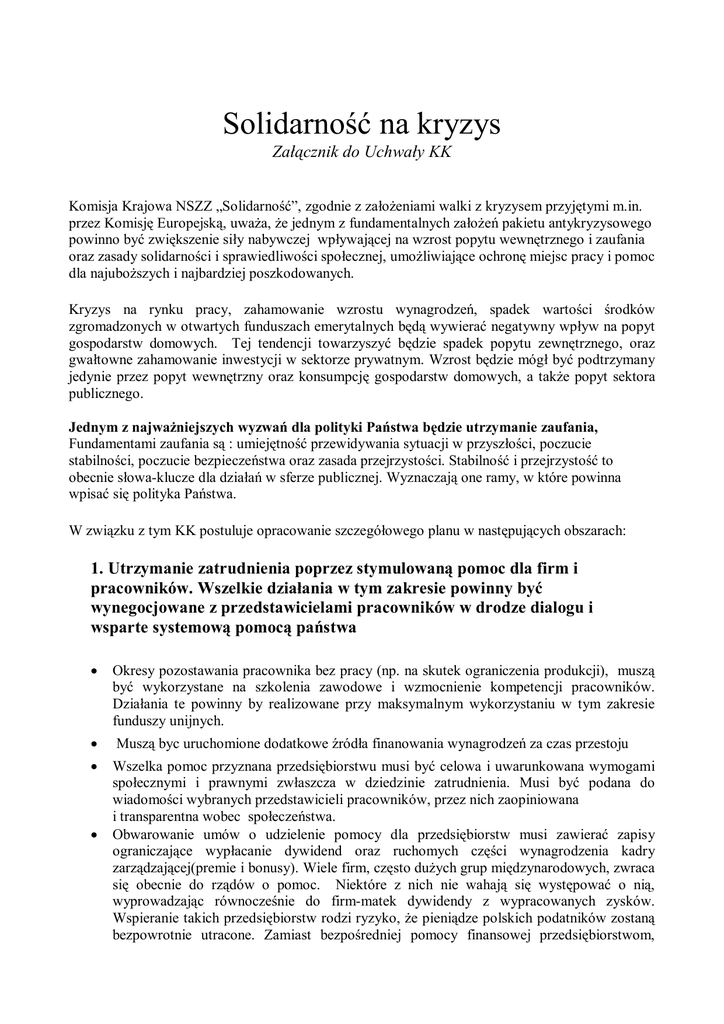 Solidarność na kryzys Załącznik do Uchwały KK Komisja Krajowa NSZZ „Solidarność”, zgodnie z założeniami walki z kryzysem przyjętymi m.in. przez Komisję Europejską, uważa, że jednym z fundamentalnych założeń pakietu antykryzysowego powinno być zwiększenie siły nabywczej wpływającej na wzrost popytu wewnętrznego i zaufania oraz zasady solidarności i sprawiedliwości społecznej, umożliwiające ochronę miejsc pracy i pomoc dla najuboższych i najbardziej poszkodowanych. Kryzys na rynku pracy, zahamowanie wzrostu wynagrodzeń, spadek wartości środków zgromadzonych w otwartych funduszach emerytalnych będą wywierać negatywny wpływ na popyt gospodarstw domowych. Tej tendencji towarzyszyć będzie spadek popytu zewnętrznego, oraz gwałtowne zahamowanie inwestycji w sektorze prywatnym. Wzrost będzie mógł być podtrzymany jedynie przez popyt wewnętrzny oraz konsumpcję gospodarstw domowych, a także popyt sektora publicznego. Jednym z najważniejszych wyzwań dla polityki Państwa będzie utrzymanie zaufania, Fundamentami zaufania są : umiejętność przewidywania sytuacji w przyszłości, poczucie stabilności, poczucie bezpieczeństwa oraz zasada przejrzystości. Stabilność i przejrzystość to obecnie słowa-klucze dla działań w sferze publicznej. Wyznaczają one ramy, w które powinna wpisać się polityka Państwa. W związku z tym KK postuluje opracowanie szczegółowego planu w następujących obszarach: 1. Utrzymanie zatrudnienia poprzez stymulowaną pomoc dla firm i pracowników. Wszelkie działania w tym zakresie powinny być wynegocjowane z przedstawicielami pracowników w drodze dialogu i wsparte systemową pomocą państwa • Okresy pozostawania pracownika bez pracy (np. na skutek ograniczenia produkcji), muszą być wykorzystane na szkolenia zawodowe i wzmocnienie kompetencji pracowników. Działania te powinny by realizowane przy maksymalnym wykorzystaniu w tym zakresie funduszy unijnych. • Muszą byc uruchomione dodatkowe źródła finanowania wynagrodzeń za czas przestoju • Wszelka pomoc przyznana przedsiębiorstwu musi być celowa i uwarunkowana wymogami społecznymi i prawnymi zwłaszcza w dziedzinie zatrudnienia. Musi być podana do wiadomości wybranych przedstawicieli pracowników, przez nich zaopiniowana i transparentna wobec społeczeństwa. Obwarowanie umów o udzielenie pomocy dla przedsiębiorstw musi zawierać zapisy ograniczające wypłacanie dywidend oraz ruchomych części wynagrodzenia kadry zarządzającej(premie i bonusy). Wiele firm, często dużych grup międzynarodowych, zwraca się obecnie do rządów o pomoc. Niektóre z nich nie wahają się występować o nią, wyprowadzając równocześnie do firm-matek dywidendy z wypracowanych zysków. Wspieranie takich przedsiębiorstw rodzi ryzyko, że pieniądze polskich podatników zostaną bezpowrotnie utracone. Zamiast bezpośredniej pomocy finansowej przedsiębiorstwom, • należy wybrać inwestycje w polski kapitał ludzki, bo gdy minie kryzys, pozostanie on głównym zasobem kraju. • Prowadzenie dialogu społecznego na różnych poziomach. 2. Utrzymanie popytu wewnętrznego poprzez ochronę poziomu wynagrodzeń, systematyczny wzrost płacy minimalnej, zmniejszanie rozwarstwienia dochodów, a także wzrost nakładów na inwestycje budżetowe. Ożywienie gospodarcze - wzrost konsumpcji – pomoc dla firm - wzrost siły nabywczej szczególnie osób o najskromniejszych dochodach. • W branżach, w przedsiębiorstwach, w służbie publicznej negocjacje płacowe muszą zapewnić przynajmniej utrzymanie siły nabywczej i zmniejszenie nierówności płacowych. • Pokrywanie kosztów dojazdu do pracy komunikacja miejską i dofinansowanie kwoty kosztów przejazdu własnym środkiem transportu poprzez a) pracodawców, przy wykorzystaniu zewnętrznych źródeł finansowania b) zwiększenie ulg ustawowych na przejazdy /( zwiększenie kosztów uzyskania przychodów w związku z dojazdem do pracy do wysokości rzeczywiście poniesionych wydatków). • zwolnienie z opodatkowania kwot talonów przeznaczonych na posiłki dla pracowników, na opiekę nad członkami rodziny (przedszkola, żłobki, opieka pielęgnacyjna i pielegniarska, oświata). Partnerzy społeczni i rząd powinni dopracować system zwolnień podatkowych w innych obszarach. • Poprawienie jakości działania służb publicznych oraz obsługi klientow, uwzględniając zwiekszenie niezbędnych środków budzetowych. Wpływ na wzrost konsumpcji może odbywać się również poprzez działania: • • • Okresowe zmniejszenie podstawowej stawki podatku VAT na wybrane artykuły, w tym żywność Obniżenie ceny kredytu – obniżenie stawek podstawowych oraz polityka banków obniżenia ceny kredytu (oprocentowania) przy konieczności stworzenia narzędzi monitoringu rzeczywistego wykorzystania uwolnionych środków ( kontrola czy zwiększone strumienie pieniędzy zostały skierowane na odblokowanie akcji kredytowej dla przedsiębiorstw Intensyfikacja inwestycji publicznych (szczególnie drogowej, budownictwa i sektorze paliwowo=energetycznym) przy maksymalnym wykorzystaniu środków unijnych. Spadający popyt w sektorze prywatnym należy zrównoważyć większym popytem w sektorze publicznym 3. Lepsze wykorzystanie funduszy europejskich do działań antykryzysowych na rynku pracy. • Uruchomienie środków dla firm i służb zatrudnienia, aby finansować w/w działania ograniczające wydatki przedsiębiorstw i utrzymujące popyt wewnętrzny. • Odbiurokratyzowanie procedur przyznawania środków – zmiana przepisów pozwalająca na skrócenie okresu od złożenia wniosku do uruchomienia środków, aby móc szybko 2 reagować w miarę pojawiających się sytuacji kryzysowych w przedsiębiorstwach oraz uproszczenie procedur ich rozliczania. • Preferencje dla projektów, w tym tzw. projektów indywidualnych, obejmujących działania kompleksowe, nowe rozwiązania na rynku pracy – pomoc przedsiębiorcom,