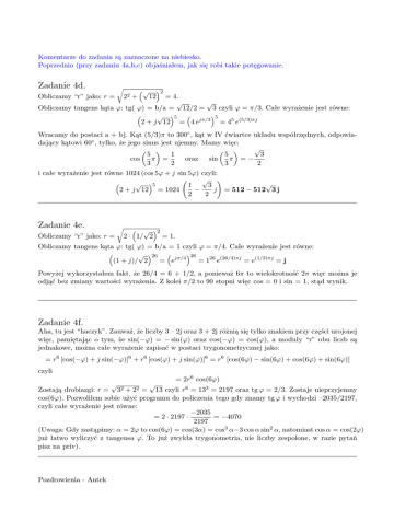 Komentarze do zadania są zaznaczone na niebiesko. Poprzednio (przy zadaniu 4a,b,c) objaśniałem, jak się robi takie potęgowanie. Zadanie 4d. r 22 + Obliczamy “r” jako: r = √ 2 12 = 4. √ √ Obliczamy tangens kąta ϕ: tg( ϕ) = b/a = 12/2 = 3 czyli ϕ = π/3. Całe wyrażenie jest równe: 5 √ 5 2 + j 12 = 4 ejπ/3 = 45 e(5/3)πj Wracamy do postaci a + bj. Kąt (5/3)π to 300◦ , kąt w IV ćwiartce układu współrzędnych, odpowiadający kątowi 60◦ , tylko, że jego sinus jest ujemny. Mamy więc: √ 5 1 5 3 cos π = oraz sin π =− 3 2 3 2 i całe wyrażenie jest równe 1024 (cos 5ϕ + j sin 5ϕ) czyli: √ ! √ 5 √ 3 1 2 + j 12 = 1024 − j = 512 − 512 3 j 2 2 Zadanie 4e. r Obliczamy “r” jako: r = √ 2 2 · 1/ 2 = 1. Obliczamy tangens kąta ϕ: tg( ϕ) = b/a = 1 czyli ϕ = π/4. Całe wyrażenie jest równe: √ 26 jπ/4 26 = 126 e(26/4)πj = e(1/2)πj = j (1 + j)/ 2 = e Powyżej wykorzystałem fakt, że 26/4 = 6 + 1/2, a ponieważ 6π to wielokrotność 2π więc można je odjąć bez zmiany wartości wyrażenia. Z kolei π/2 to 90 stopni więc cos = 0 i sin = 1, stąd wynik. Zadanie 4f. Aha, tu jest “haczyk”. Zauważ, że liczby 3 – 2j oraz 3 + 2j różnią się tylko znakiem przy części urojonej więc, pamiętając o tym, że sin(−ϕ) = − sin(ϕ) oraz cos(−ϕ) = cos(ϕ), a moduły “r” obu liczb są jednakowe, można całe wyrażenie zapisać w postaci trygonometrycznej jako: = r6 [cos(−ϕ) + j sin(−ϕ)]6 + r6 [cos(ϕ) + j sin(ϕ)]6 = r6 [cos(6ϕ) − sin(6ϕ) + cos(6ϕ) + sin(6ϕ)] czyli √ √ = 2r6 cos(6ϕ) Zostają drobiazgi: r = 32 + 22 = 13 czyli r6 = 133 = 2197 oraz tg ϕ = 2/3. Zostaje nieprzyjemny cos(6ϕ). Pozwoliłem sobie użyć programu do policzenia tego gdy znamy tg ϕ i wychodzi –2035/2197, czyli całe wyrażenie jest równe: −2035 = 2 · 2197 · = −4070 2197 (Uwaga: Gdy zastąpimy: α = 2ϕ to cos(6ϕ) = cos(3α) = cos3 α−3 cos α sin2 α, natomiast cos α = cos(2ϕ) już łatwo wyliczyć z tangensa ϕ. To już zwykła trygonometria, nie liczby zespolone, w razie pytań pisz na priv). Pozdrowienia - Antek