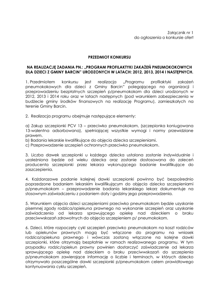 Załącznik nr 1 do ogłoszenia o konkursie ofert PRZEDMIOT KONKURSU NA REALIZACJĘ ZADANIA PN.: „PROGRAM PROFILAKTYKI ZAKAŻEŃ PNEUMOKOKOWYCH DLA DZIECI Z GMINY BARCIN” URODZONYCH W LATACH: 2012, 2013, 2014 I NASTĘPNYCH. 1. Przedmiotem konkursu jest realizacja „Programu profilaktyki zakażeń pneumokokowych dla dzieci z Gminy Barcin” polegającego na organizacji i przeprowadzeniu bezpłatnych szczepień p/pneumokokom dla dzieci urodzonych w 2012, 2013 i 2014 roku oraz w latach następnych (pod warunkiem zabezpieczenia w budżecie gminy środków finansowych na realizację Programu), zamieszkałych na terenie Gminy Barcin. 2. Realizacja programu obejmuje następujące elementy: a) Zakup szczepionki PCV 13 – przeciwko pneumokokom, (szczepionka koniugowana 13-walentna adsorbowana), spełniającej wszystkie wymogi i normy przewidziane prawem. b) Badania lekarskie kwalifikujące do objęcia dziecka szczepieniami. c) Przeprowadzenie szczepień ochronnych przeciwko pneumokokom. 3. Liczba dawek szczepionki u każdego dziecka ustalona zostanie indywidualnie i uzależniona będzie od wieku dziecka oraz zostanie dostosowana do zaleceń producenta szczepionki przez lekarza wykonującego badanie kwalifikujące do zaszczepienia. 4. Każdorazowe podanie kolejnej dawki szczepionki powinno być bezpośrednio poprzedzone badaniem lekarskim kwalifikującym do objęcia dziecka szczepieniami p/pneumokokom – przeprowadzenie badania lekarskiego lekarz dokumentuje na stosownym zaświadczeniu z podaniem daty i godziny jego przeprowadzenia. 5. Warunkiem objęcia dzieci szczepieniami przeciwko pneumokokom będzie uzyskanie pisemnej zgody rodzica/opiekuna prawnego na wykonanie szczepień oraz uzyskanie zaświadczenia od lekarza sprawującego opiekę nad dzieckiem o braku przeciwwskazań zdrowotnych do objęcia szczepieniem p/ pneumokokom. 6. Dzieci, które rozpoczęły cykl szczepień przeciwko pneumokokom na koszt rodziców lub opiekunów prawnych mogą być włączone do programu na wniosek rodzica/opiekuna prawnego i wówczas zostaną włączone na kolejne dawki szczepionki, które otrzymają bezpłatnie w ramach realizowanego programu. W tym przypadku rodzic/opiekun prawny powinien dostarczyć zaświadczenie od lekarza sprawującego opiekę nad dzieckiem o braku przeciwwskazań do szczepienia p/pneumokokom zawierające informację o liczbie i terminach, w których dziecko otrzymywało poszczególne dawki szczepionki p/pneumokokom celem prawidłowego kontynuowania cyklu szczepień. 7. Badania kwalifikujące do szczepień oraz szczepienia ochronne będą realizowane w punktach szczepień podmiotów wykonujących działalność leczniczą wybranych w otwartym konkursie ofert wyposażonych zgodnie z obowiązującymi przepisami prawa. 2. Osoby uprawnione do udziału w programie: 1. Do udziału w programie uprawnione są dzieci urodzone w latach: 2012, 2013 i 2014 i następnych – mieszkańcy gminy Barcin. W bieżącym roku wg. założeń planuje się zaszczepienie ok. 406 dzieci, szczepionych w schematach 2+1 (135 dzieci); 1+1 (125 dzieci); 1 (146). Do Programu zostaną włączone także dzieci, które rozpoczęły cykl szczepień p/pneumokokom na koszt rodziców lub opiekunów prawnych na kolejne dawki szczepionki, które otrzymają bezpłatnie w ramach realizowanego programu. Warunkiem zakwalifikowania dziecka do Programu jest okazanie, przez przynajmniej jednego rodzica dowodu tożsamości w celu potwierdzenia zameldowania na ternie Gminy, oraz dokumentu potwierdzającego uiszczenie podatku od osób fizycznych w Urzędzie Skarbowym w Żninie. Rodzice dziecka, którzy nie są zameldowani na ternie Gminy Barcin, a czasowo zamieszkują i płacą podatek od osób fizycznych w Urzędzie Skarbowym w Żninie na podstawie okazania dokumentu potwierdzającego zamieszkanie i uiszczanie podatku. 3. Monitorowanie: 1. Ogólna liczba dzieci objętych programem szczepień p/pneumokokom, z rozbiciem na: a) liczbę dzieci, które otrzymały 1 dawkę szczepionki, b) liczbę dzieci, które otrzymały 2 dawki szczepionki, c) liczbę dzieci, które otrzymały 3 dawki szczepionki, 2) liczbę dzieci, które nie zaszczepiono z powodu przeciwwskazań zdrowotnych. WARUNKI KONKURSU: 1. Informacje o konkursie ofert: 1. Konkurs ofert dotyczy wyboru realizatorów zadań wynikających z Uchwały Nr XLIII/366/2014 Rady Miejskiej w Barcinie z dnia 27.06.2014 r. 2. Konkurs ofert prowadzi Komisja Konkursowa powołana zarządzeniem Nr 107/2014 Burmistrza Barcina z dnia 1 lipca 2014 r. 3. Tryb pracy Komisji określa Regulamin Pracy Komisji. 4. Oferty zgłoszone do konkursu powinny być sporządzone na udostępnionym formularzu oferty. 5. Komisja Konkursowa dokonuje oceny i wyboru ofert. 6. Organizator konkursu zastrzega sobie prawo: a) wyboru więcej niż jednej oferty, b) odwołania postępowania konkursowego bez podania przyczyny. 7. Wyniki konkursu zostaną podane do publicznej wiadomości. 8. Z wybranymi oferentami zostaną zawarte stosowne umowy. 2. Ogólne warunki przystąpienia do konkursu ofert: 1. Prowadzenie działalności leczniczej na podstawie wpisu do rejestru podmiotów wykonujących działalność leczniczą zgodnie z ustawą z dnia 15 kwietnia 2011 r. o działalności leczniczej ( Dz. U. z 2013r. Nr 217 z póź. zm.) 2. Zgodność wykonywania usług medycznych w zakresie wymaganym w konkursie ofert ze statutem podmiotu wykonującego działalność leczniczą składającego ofertę. 3. Złożenie oferty na formularzu ofertowym zgodnie ze wzorem, o którym mowa w pkt. I. wraz z aktualnymi (ważnymi 3 m-ce od daty wystawienia) dokumentami stosownie do statusu prawnego jednostki: a) zaświadczenie o wpisie do ewidencji działalności gospodarczej, jeśli podmiot nie jest widoczny w ogólnodostępnej wyszukiwarce Centralnej Ewidencji i Informacji o działalności Gospodarczej ( CEIDG ) b) statut podmiotu, c) dokument stwierdzający wpis do rejestru właściwej Okręgowej Rady Lekarskiej (w przypadku praktyk zawodowych lek
